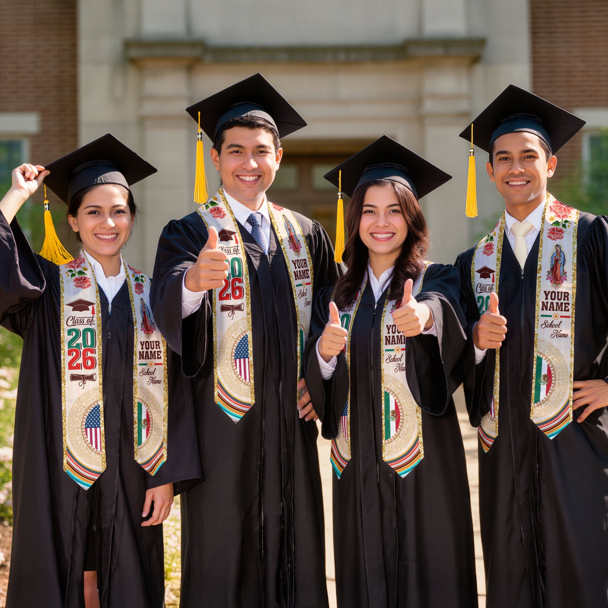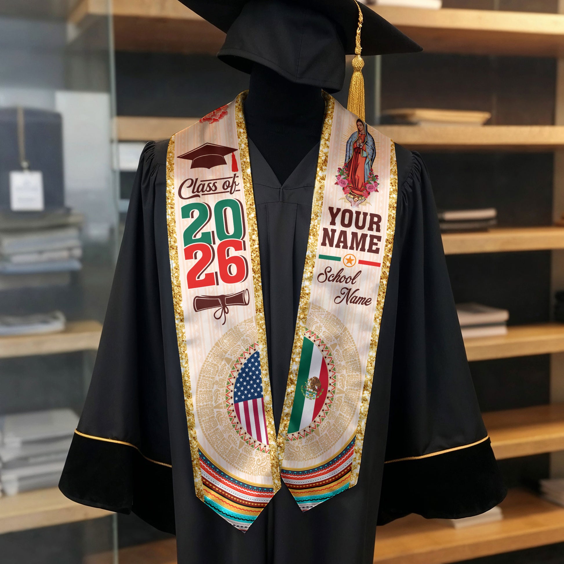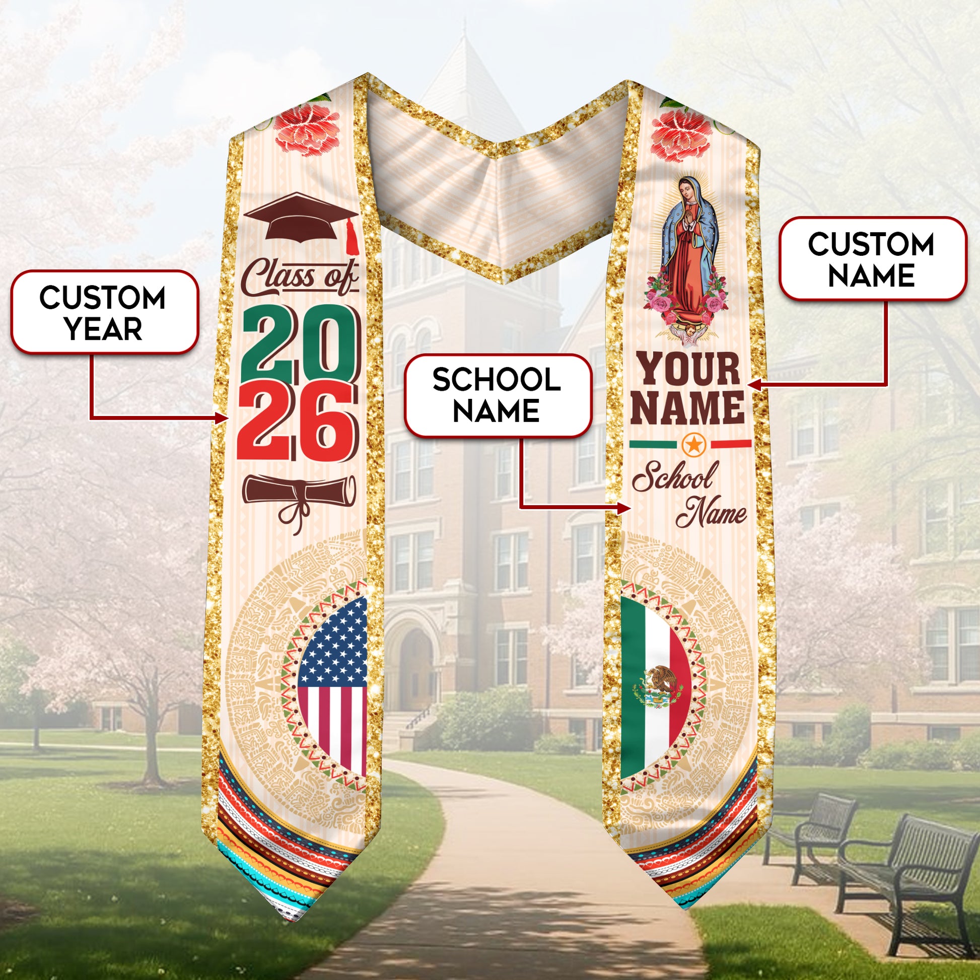 Custom Mexican Graduation Stole Aztec Calendar Virgin Mary USA Mexico Flag 2026