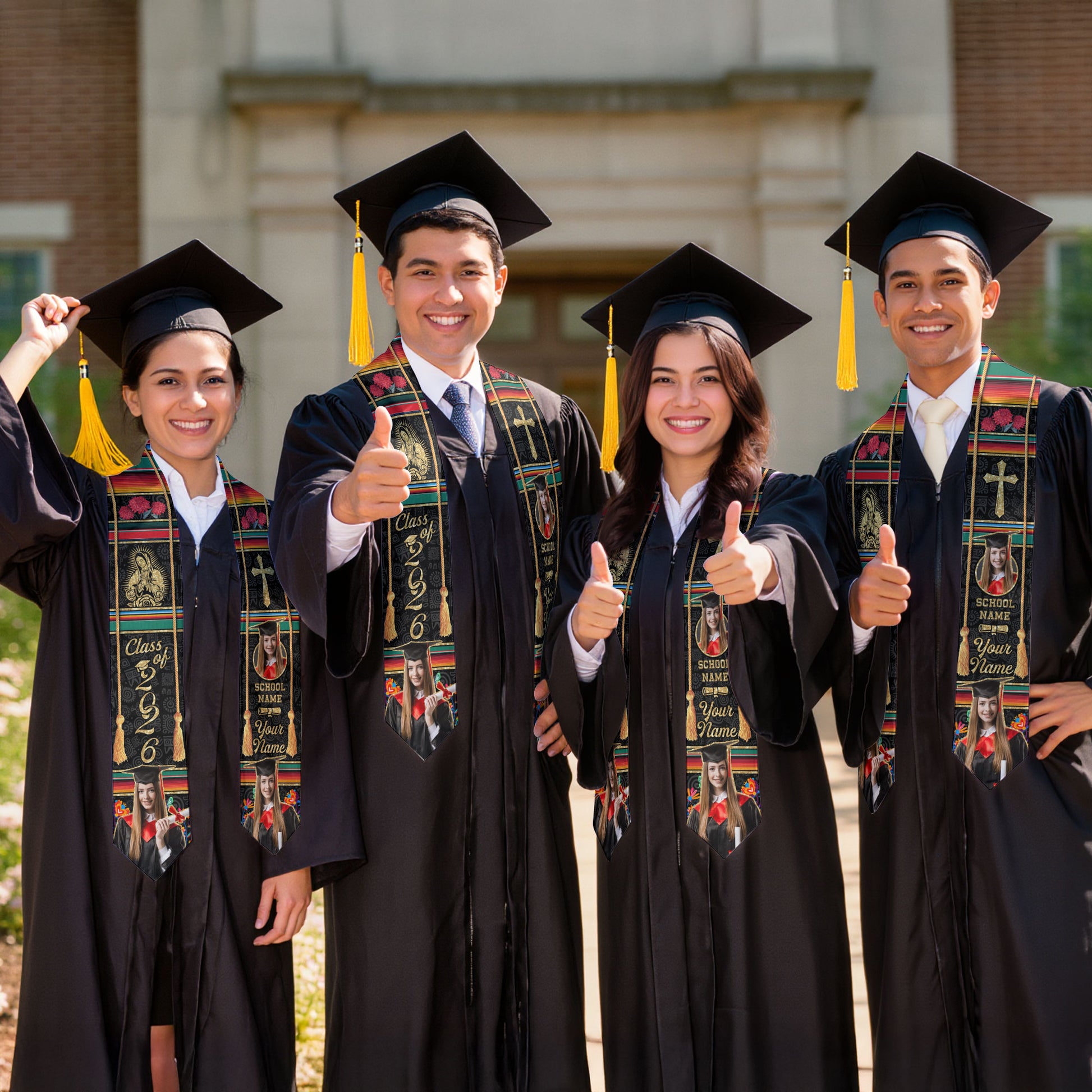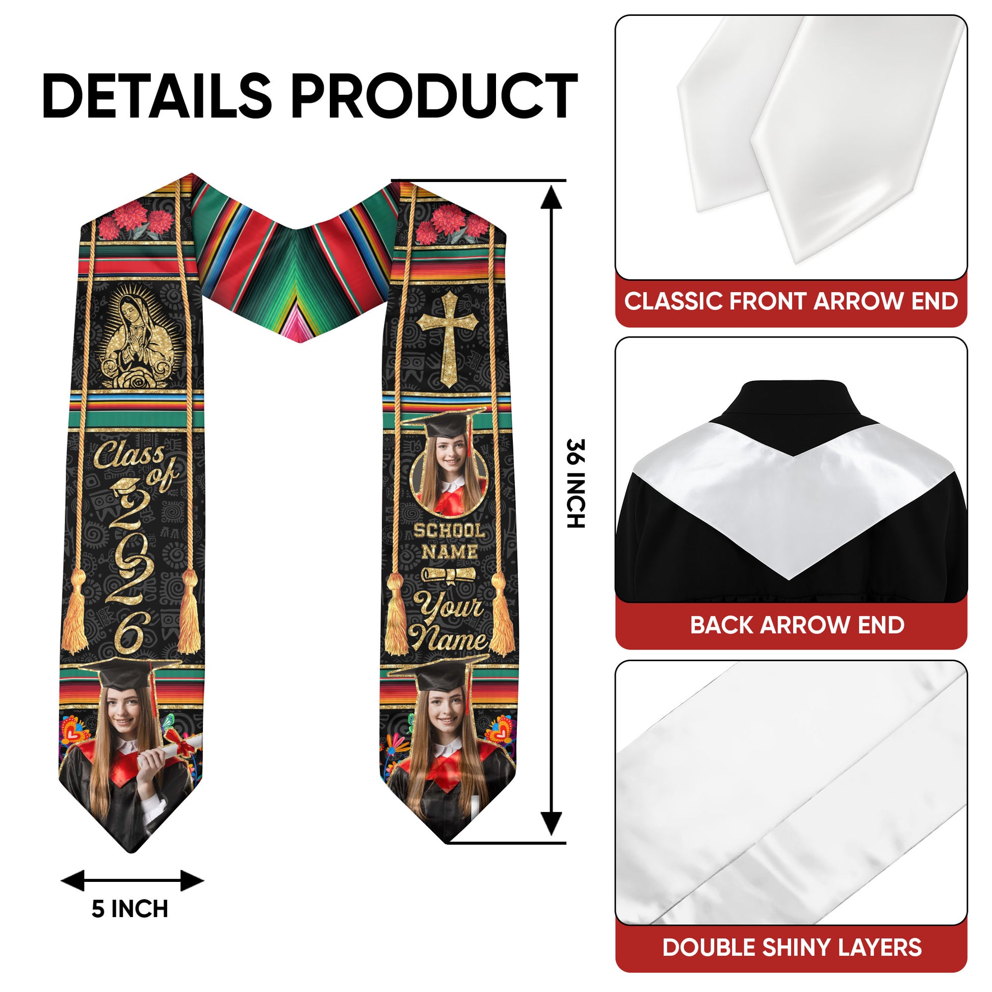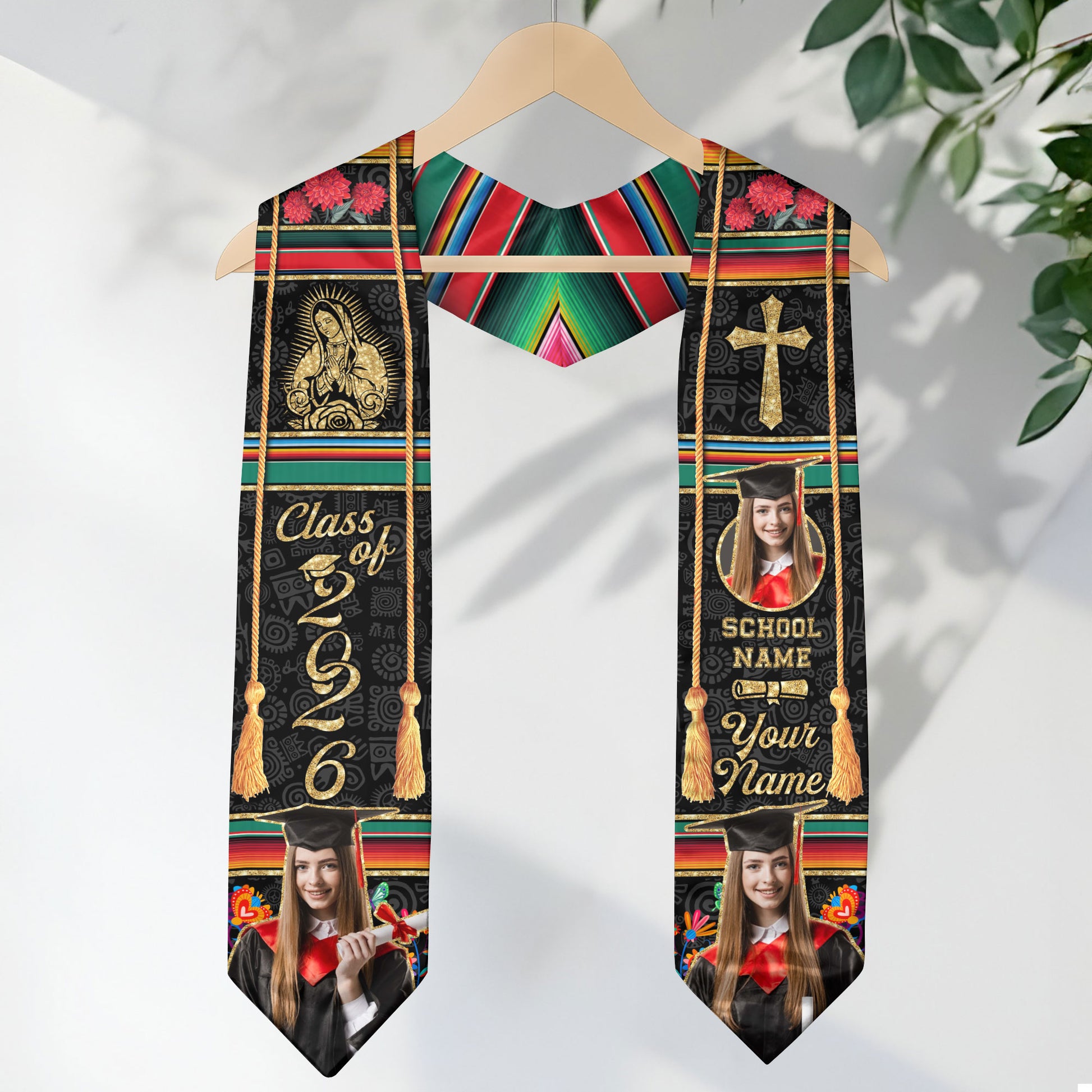 Custom Photo Mexican Graduation Stole 2026 Aztec Virgin Mary & Cross Graduation Sash Mexico