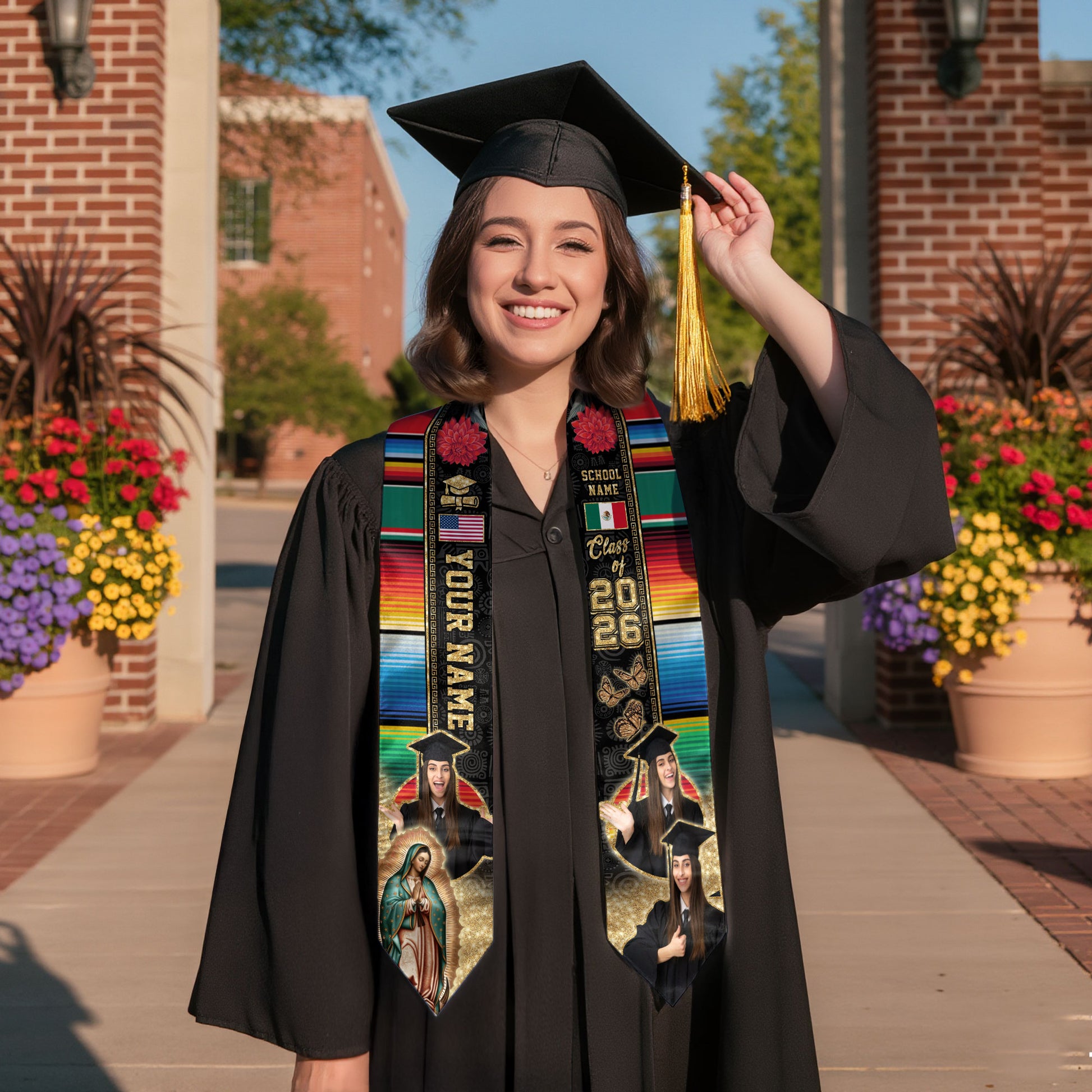 Graduation Stole Mexican with Aztec Patterns Serape USA & Mexico Flag Custom Photo Sash 2026