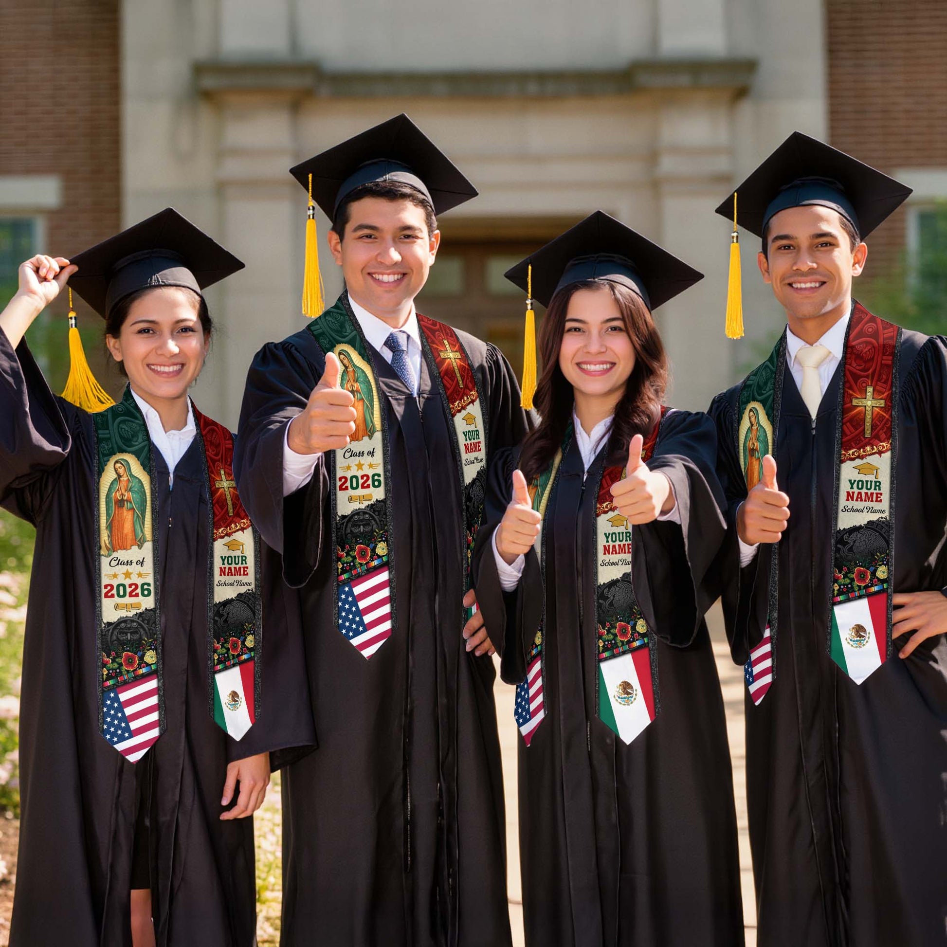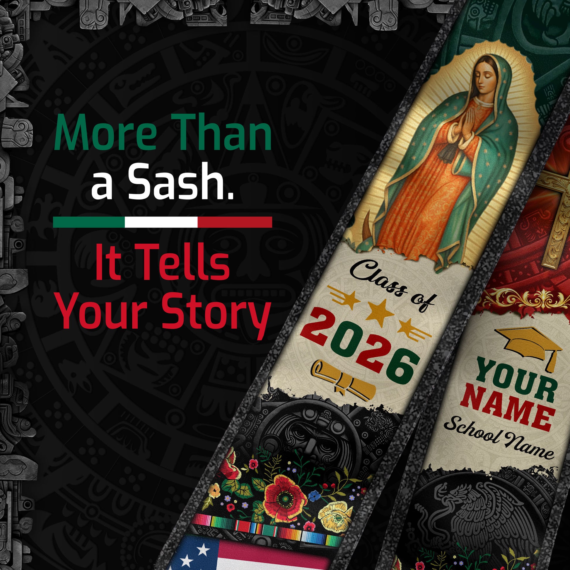 Mexican Graduation Stole Aztec Eagle Virgin Mary Cross Floral USA Flag Custom Sash