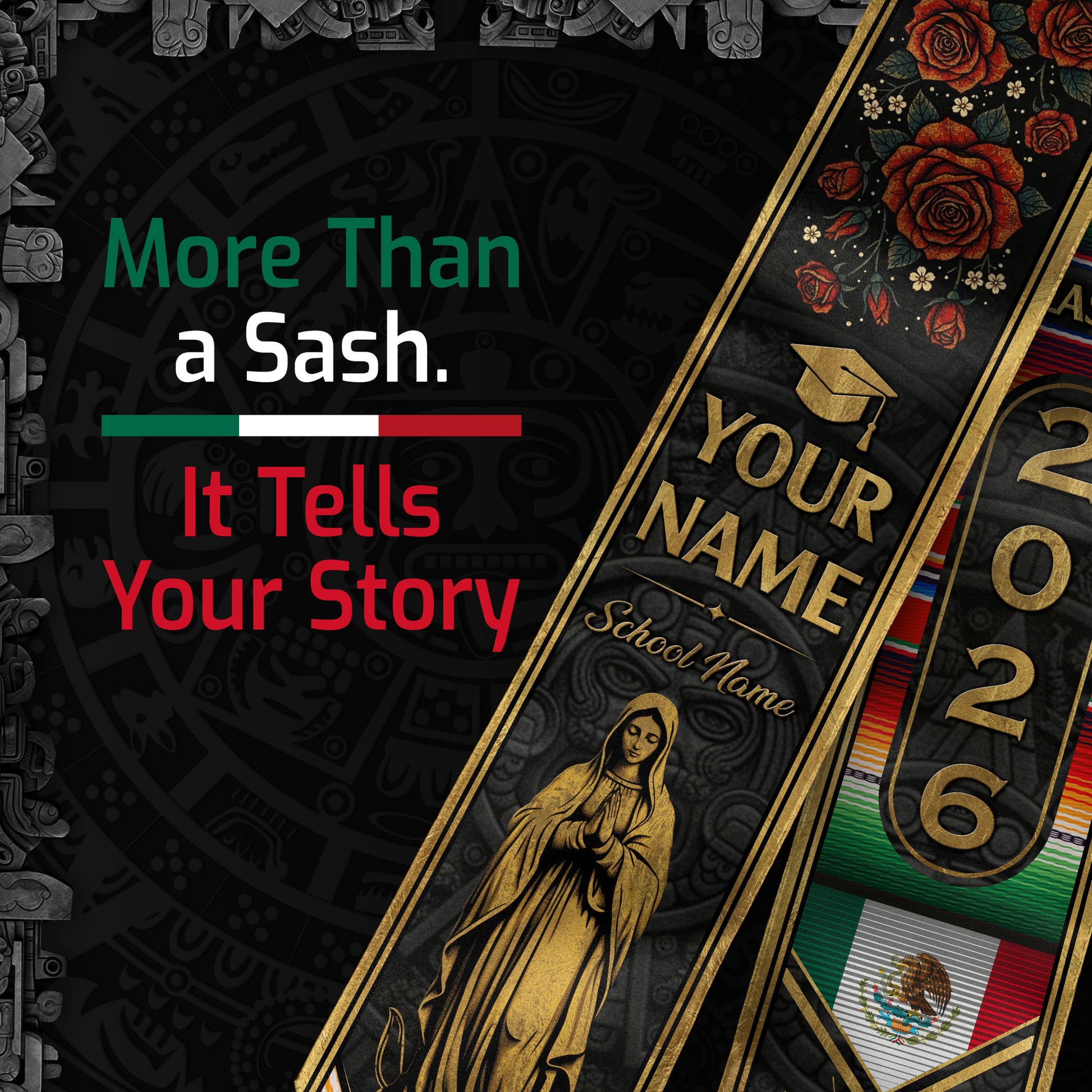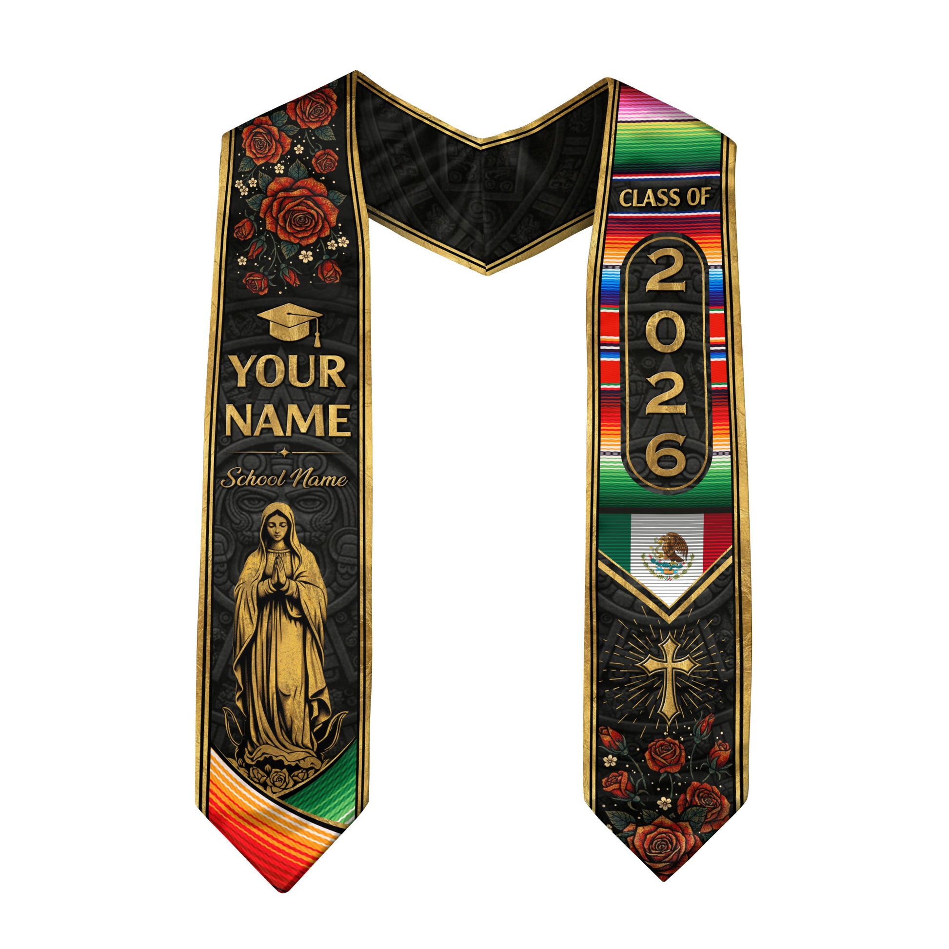 Mexican Graduation Stole Aztec Pattern Virgin Mary Cross Rose Serape Custom Sash 2026