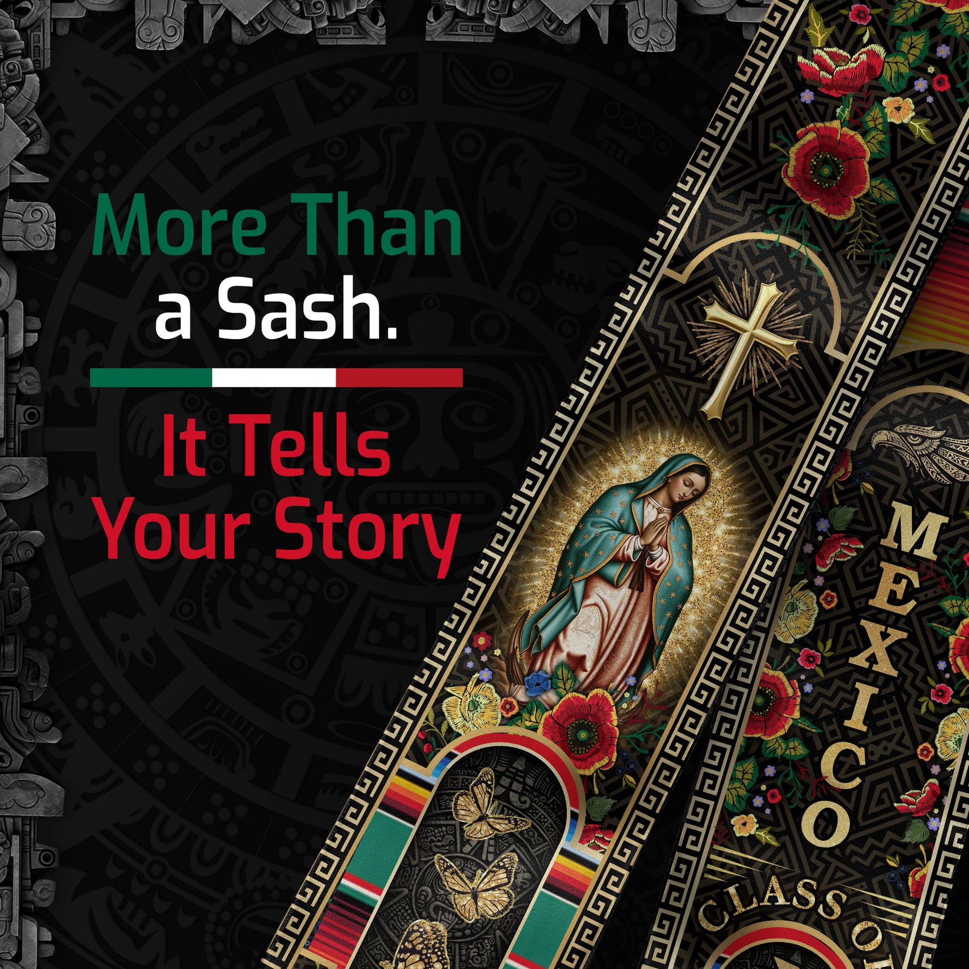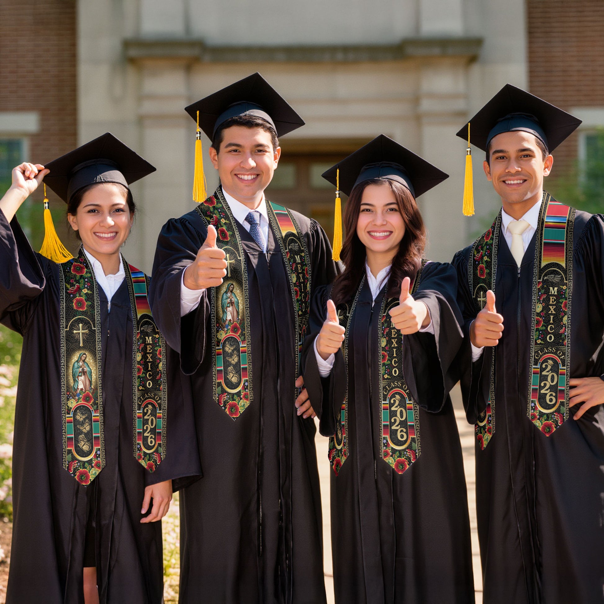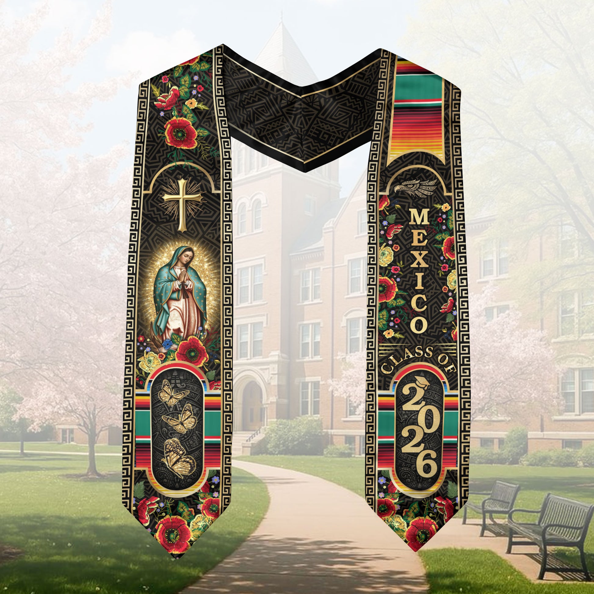 Mexican Graduation Stole Class of 2026 Aztec Cross Virgin Mary Butterfly Floral Mexico Sash