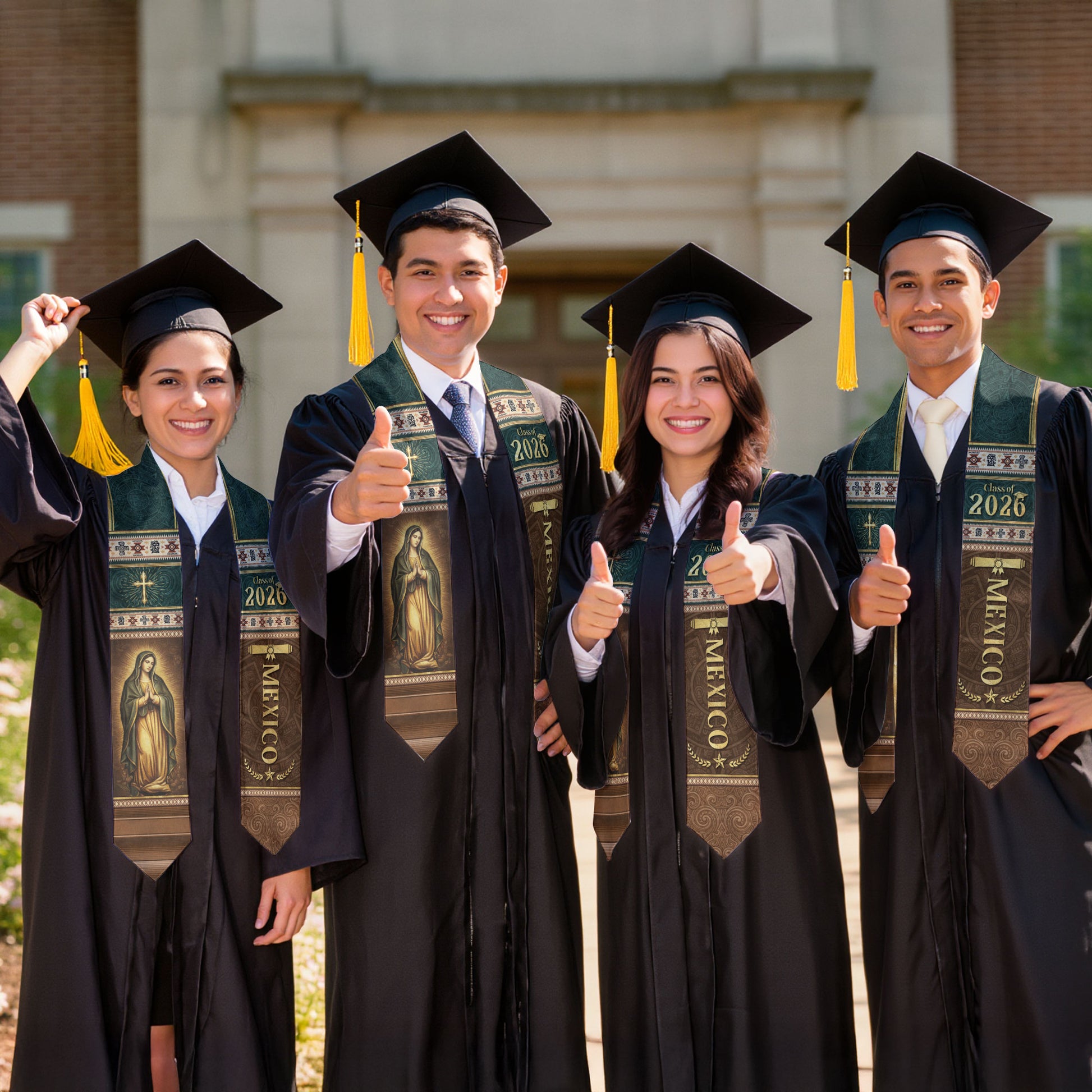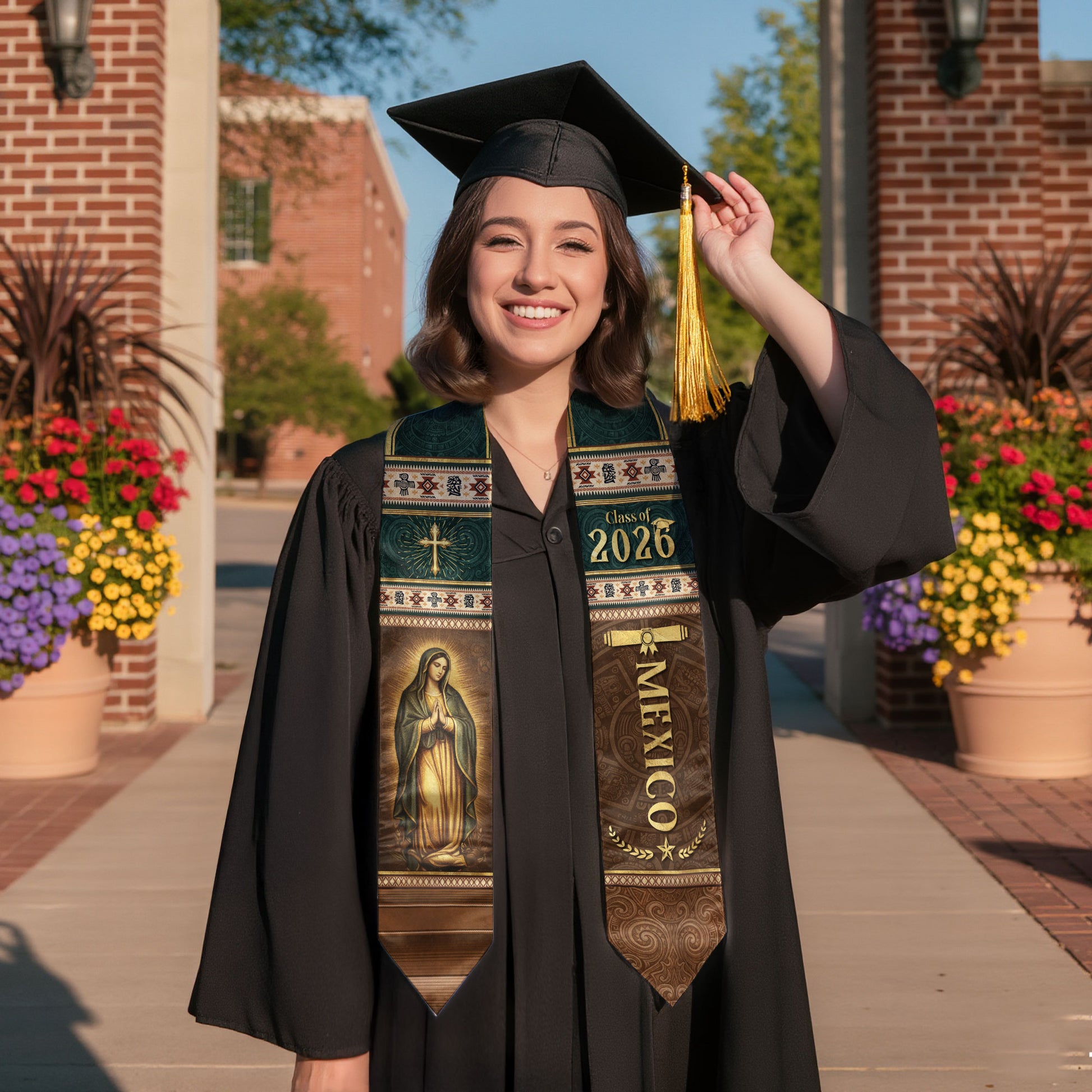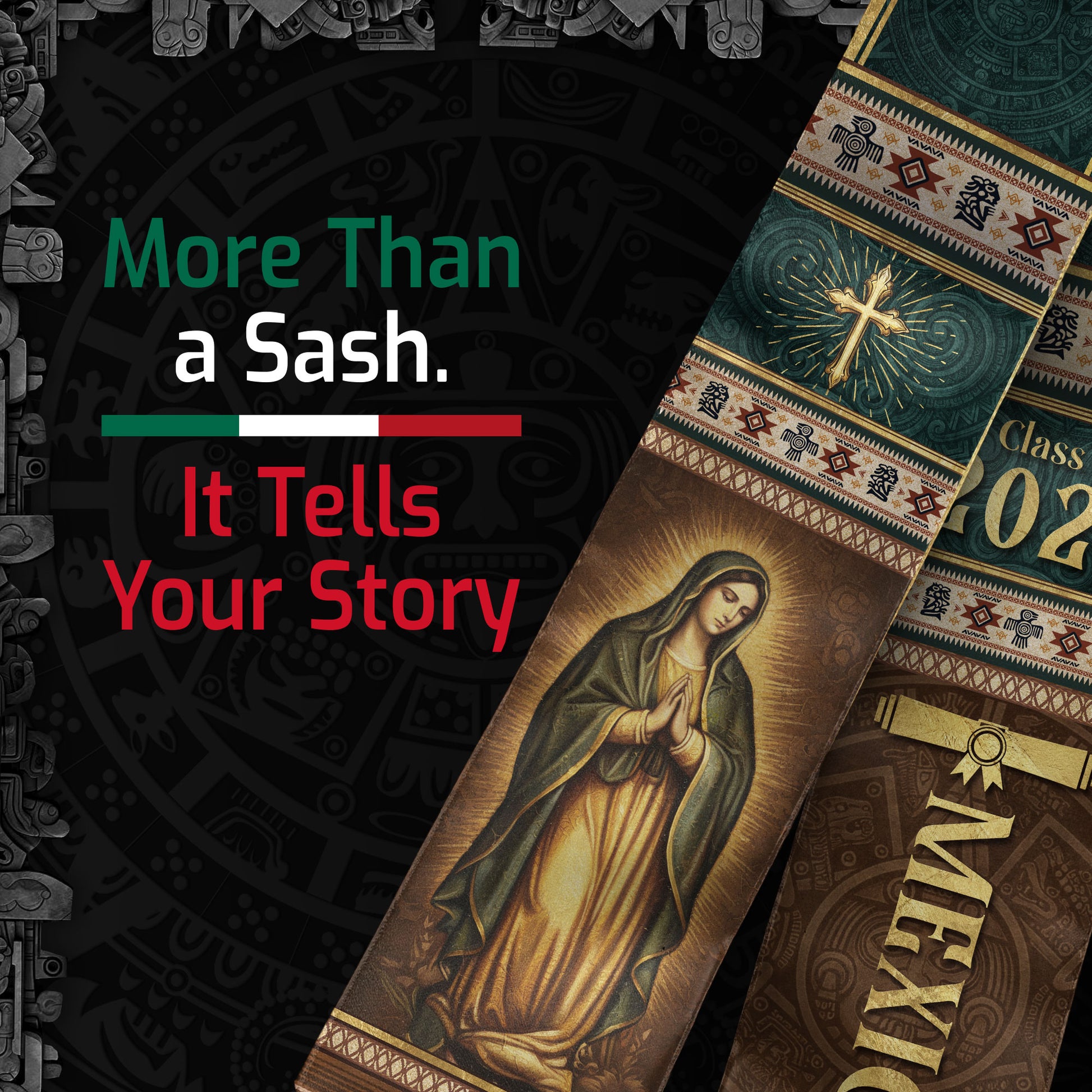 Mexican Graduation Stole Mexico Sash Aztec Pattern Virgin Mary Cross Class 2026