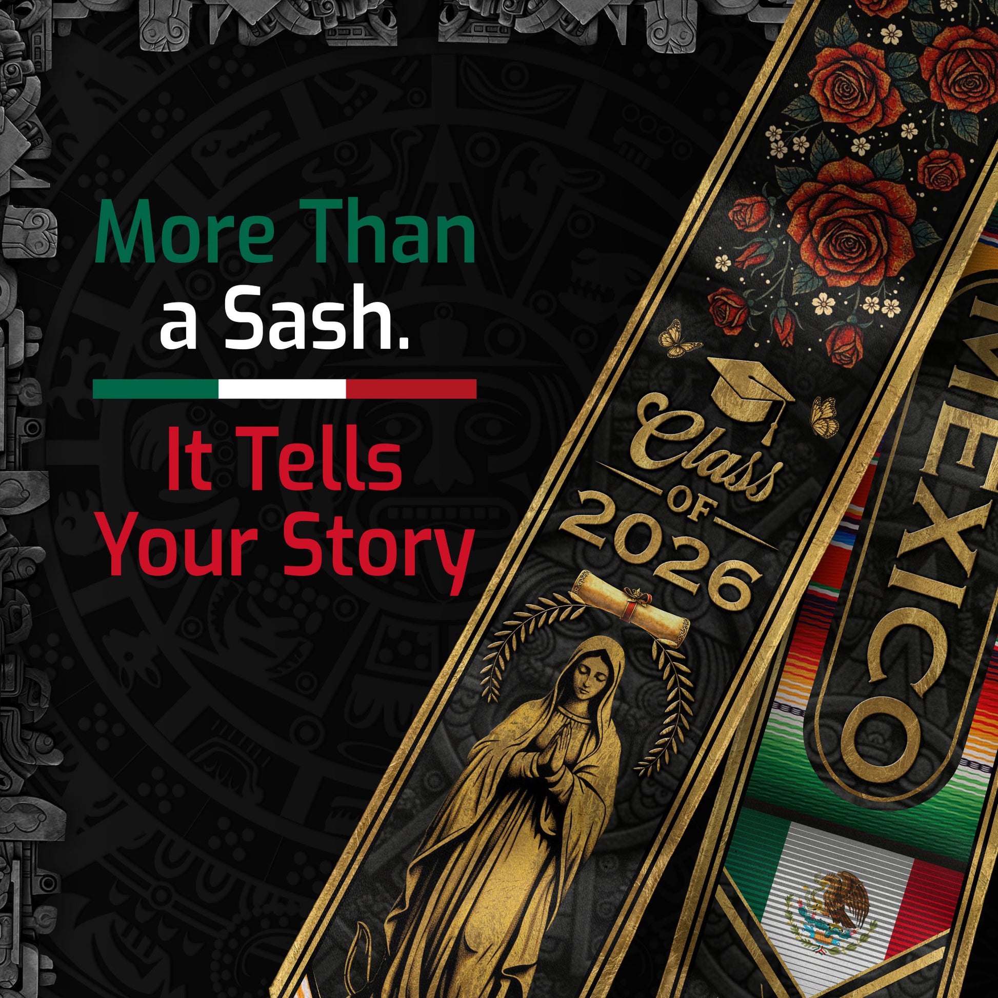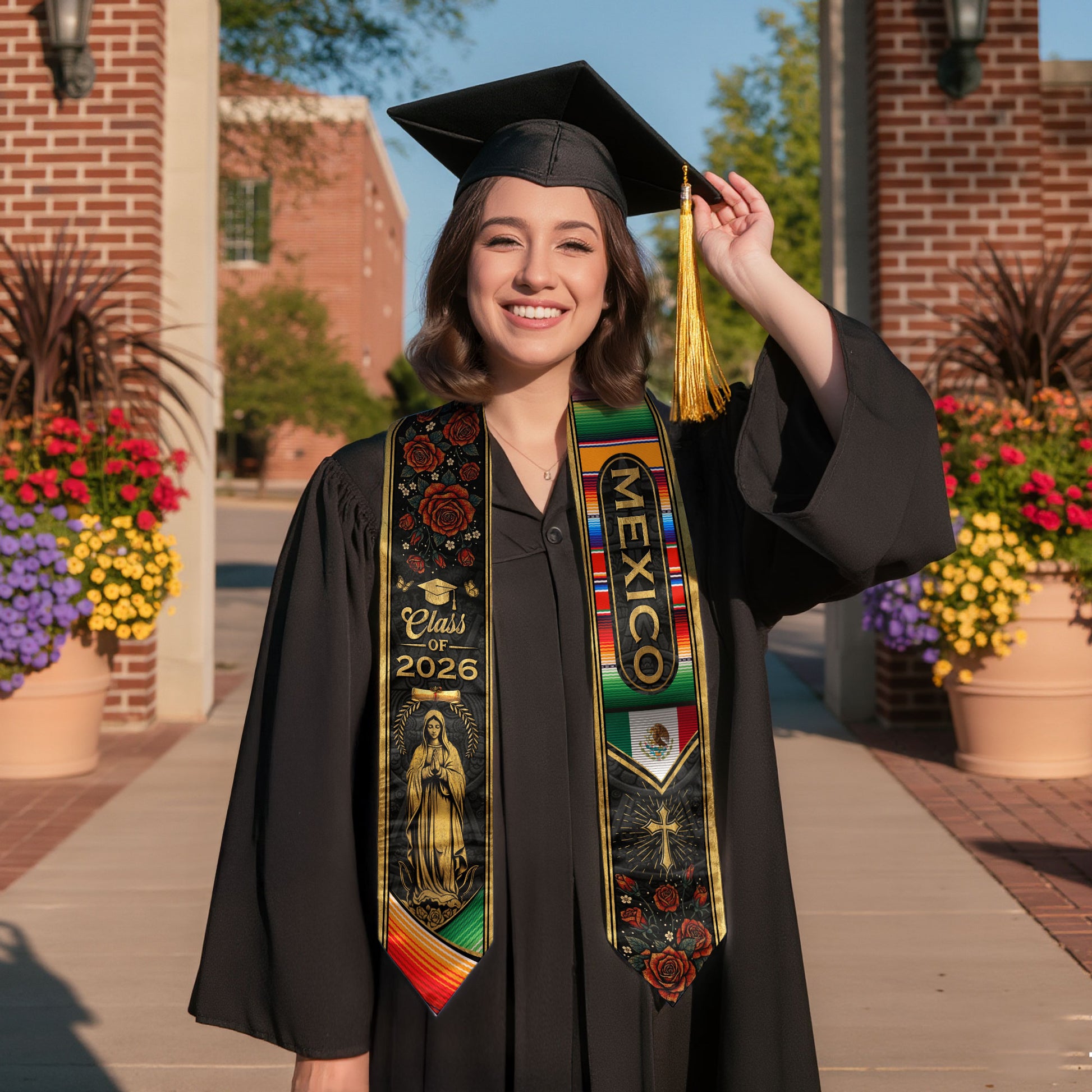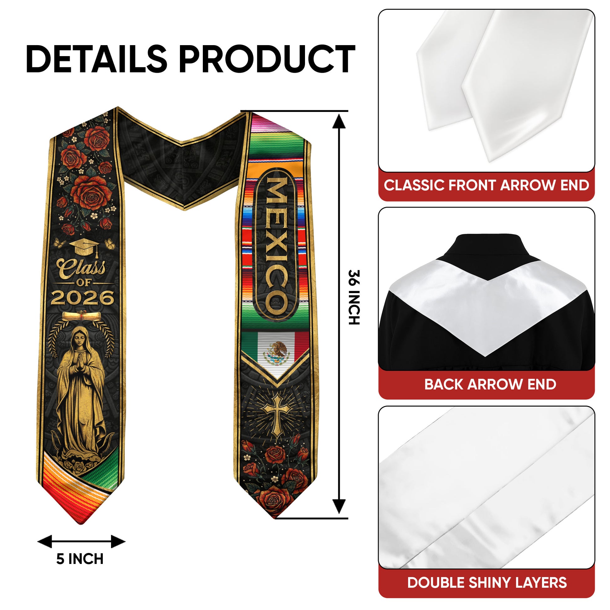 Mexican Graduation Stole Mexico Sash Aztec Roses Virgin Mary Cross Class 2026