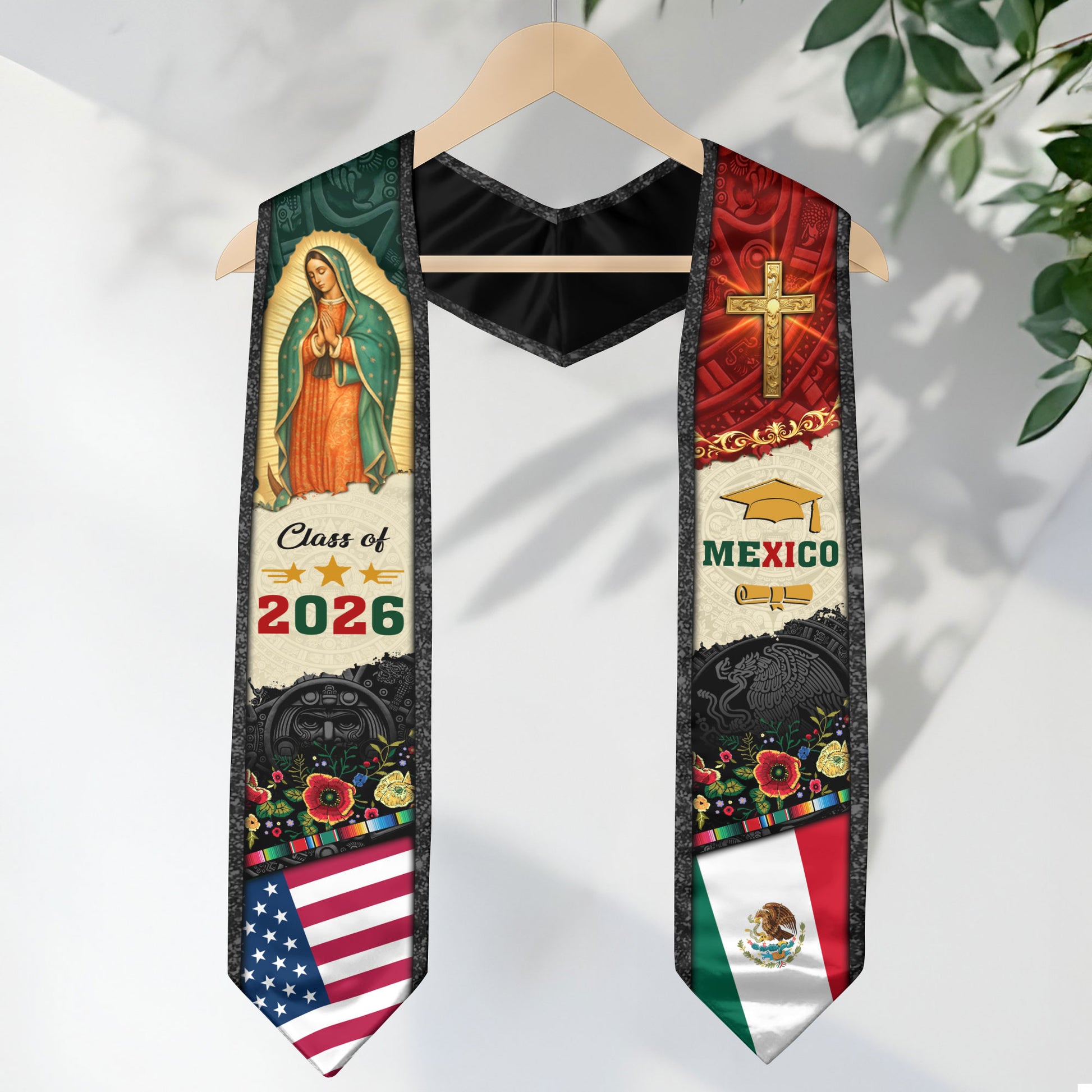Mexican Graduation Stole Mexico USA Flag Aztec Virgin Mary Cross Eagle 2026