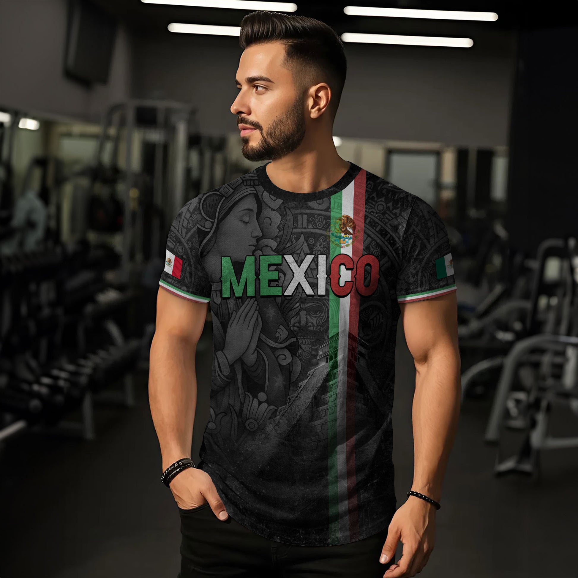 Muestra tus raíces con la playera Guadalupe Azteca con la bandera de México y las Manos en Oración, con gráficos inspirados en la cultura azteca y guadalupana y vibrantes colores de la bandera. Hecha de poliéster suave y duradero, ofrece comodidad duradera y un uso suave para la calle, el día a día o en ocasiones festivas, reflejando el auténtico orgullo mexicano.