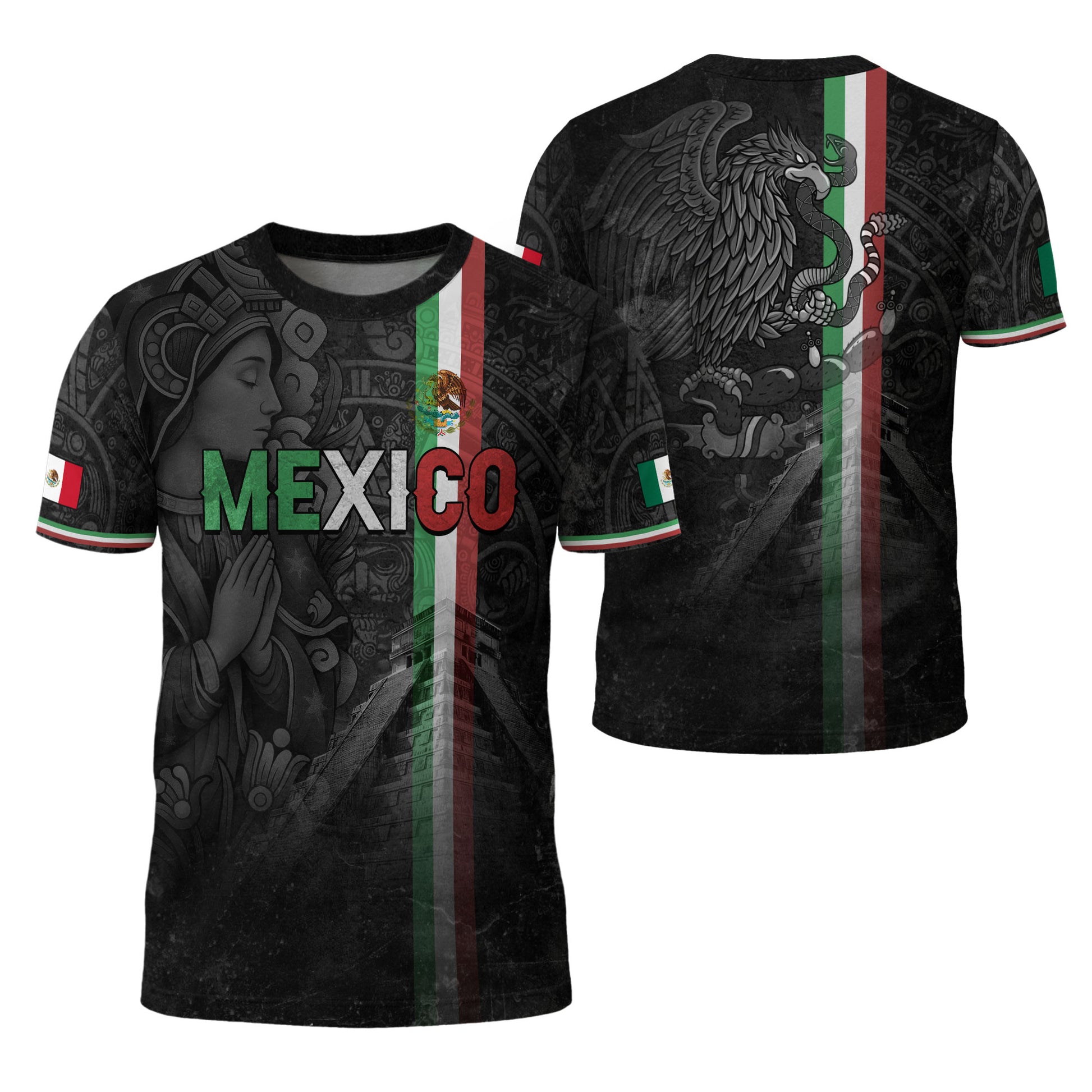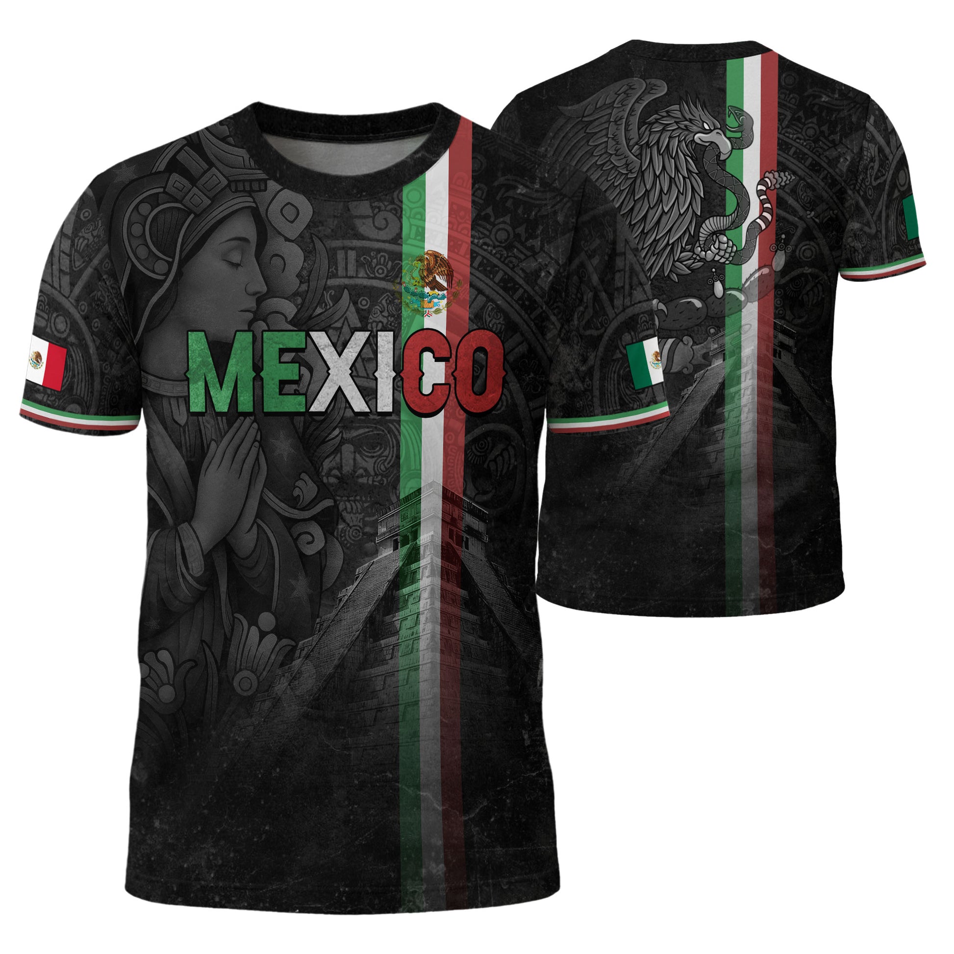 Camiseta de calle con la bandera de México, manos en oración, Guadalupe, legado azteca, orgullo