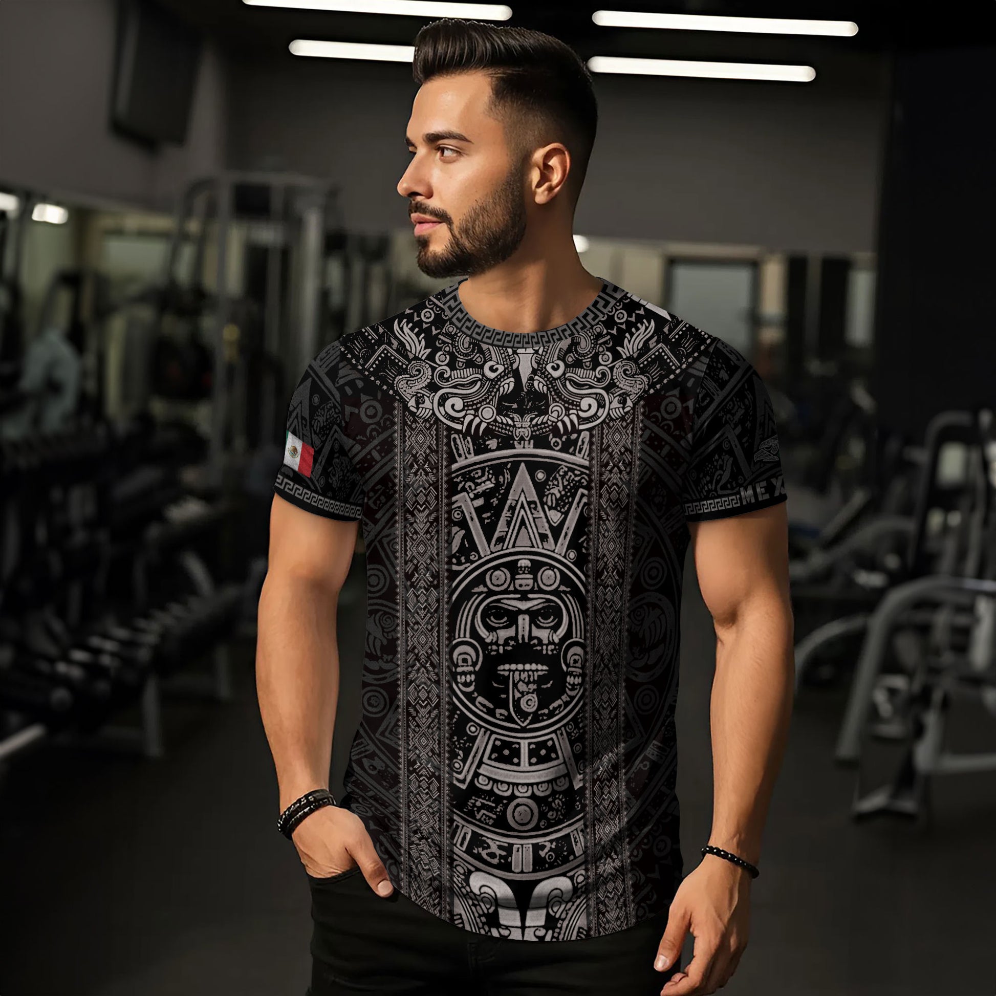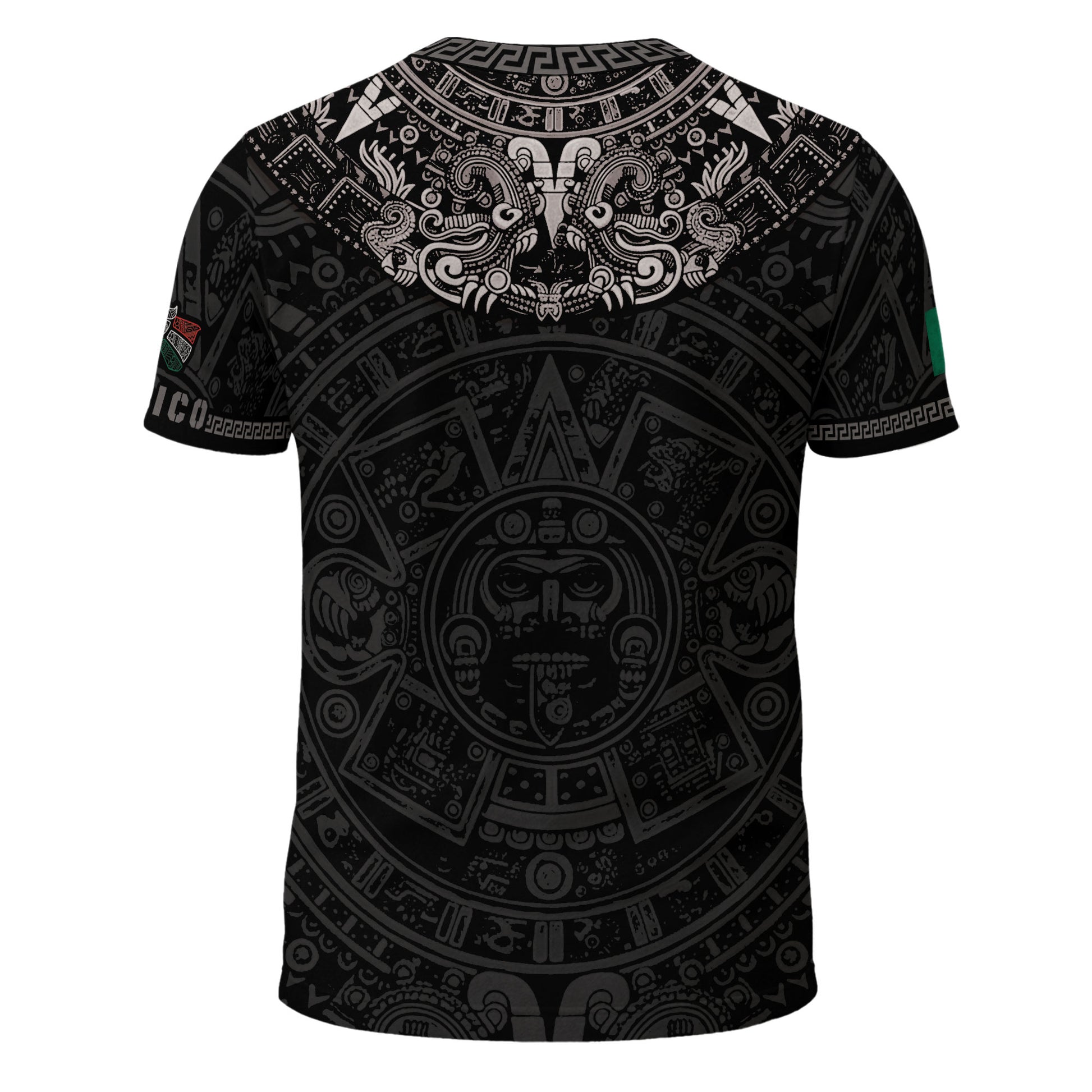 Bold Aztec Sun Stone pattern in metallic black — a tribute to ancient Mexican art and strength.