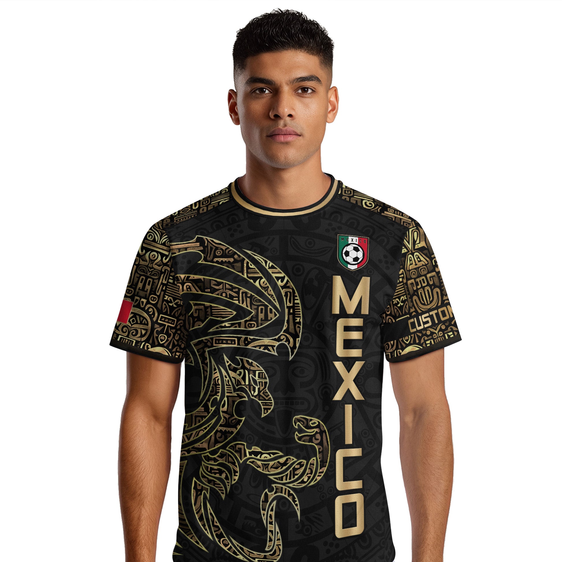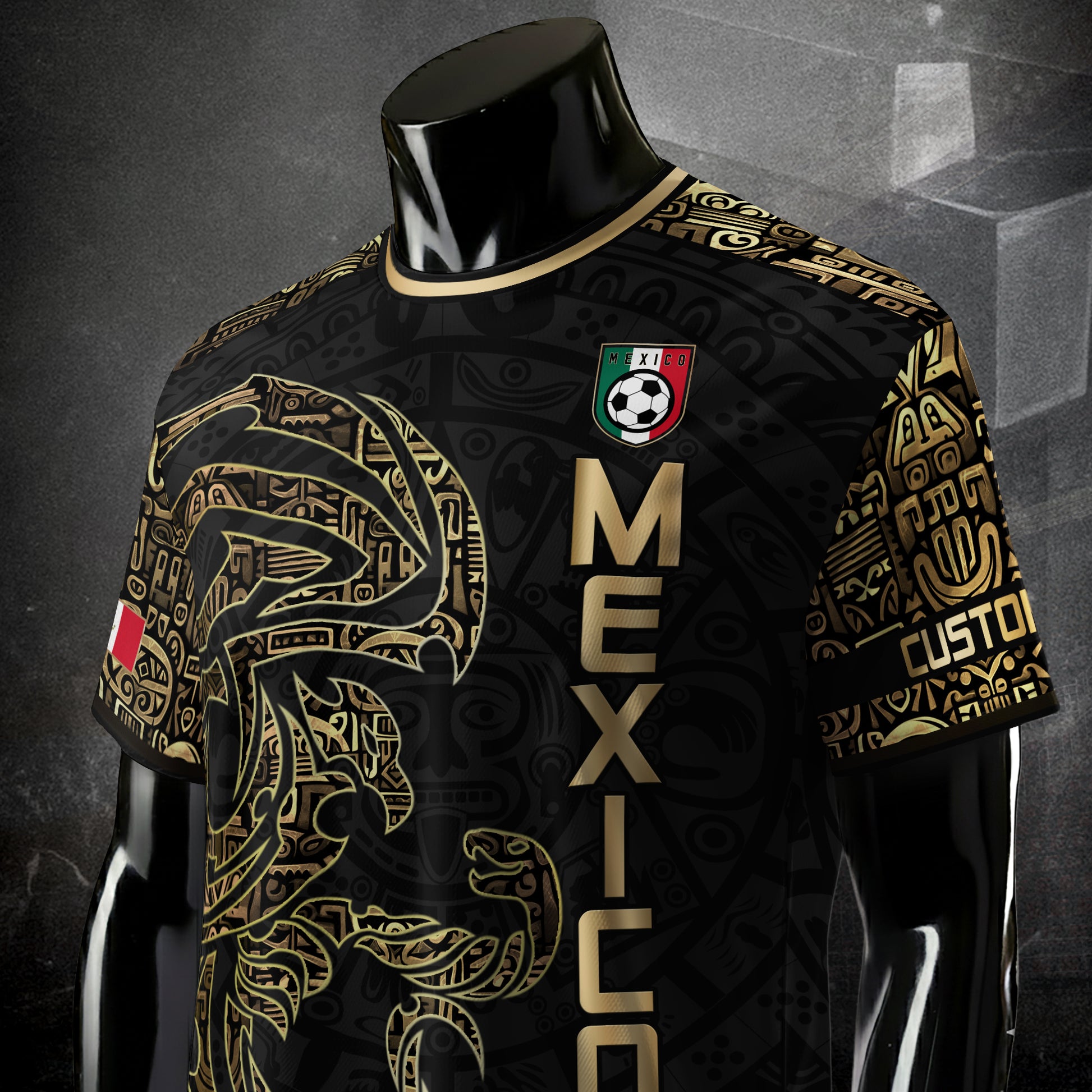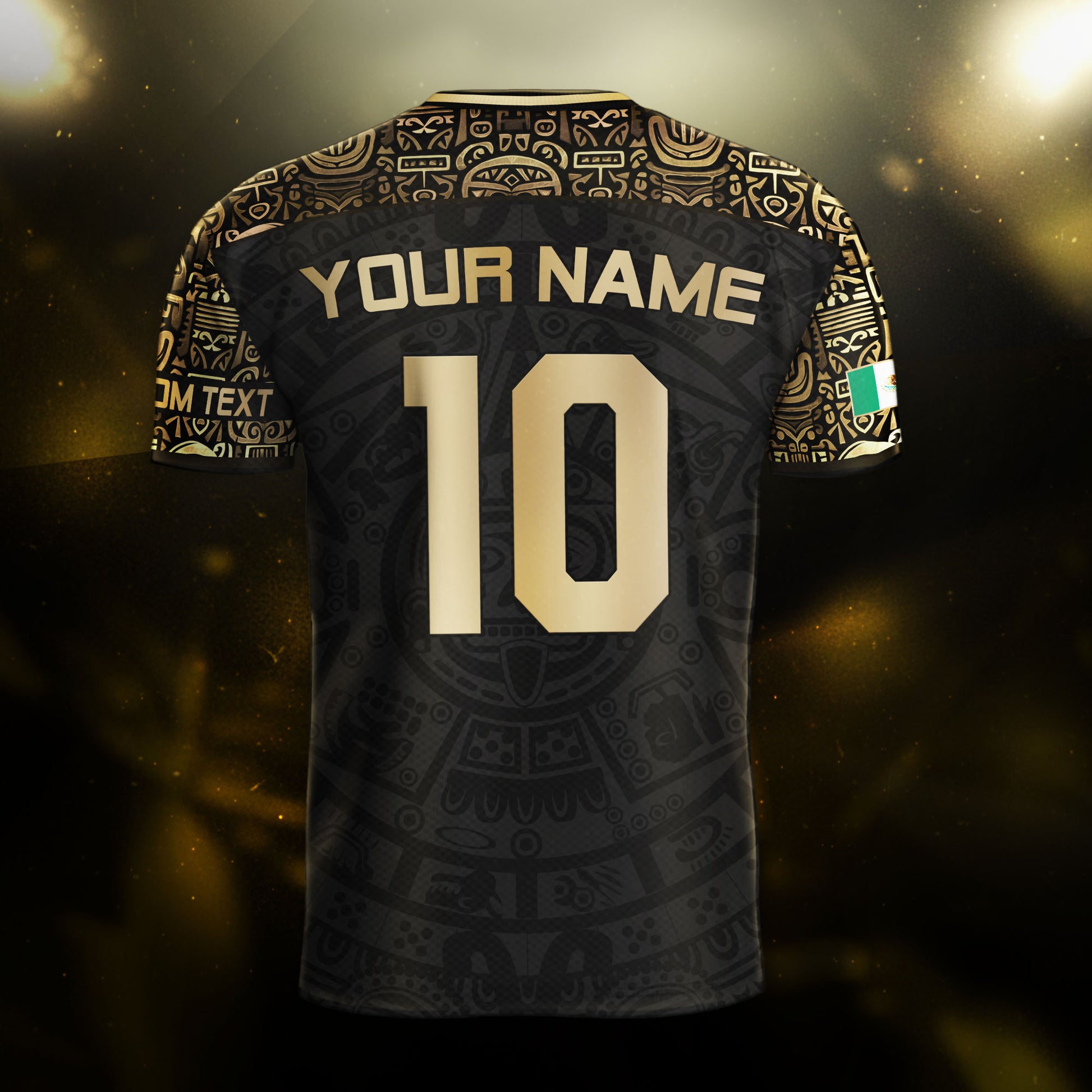 Get a custom black and gold Mexico jersey featuring a unique tribal design. Personalize it with your name and number for a one-of-a-kind look!