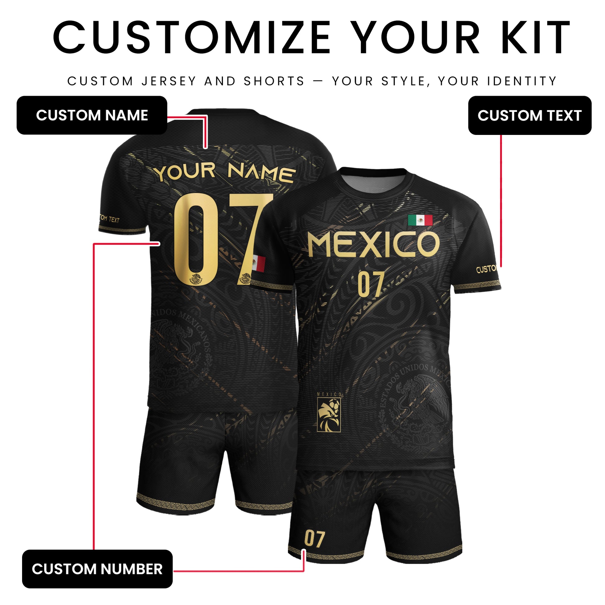 Get a custom black and gold Mexico soccer jersey with an eagle design. Personalize with your name and number for a unique fan experience!