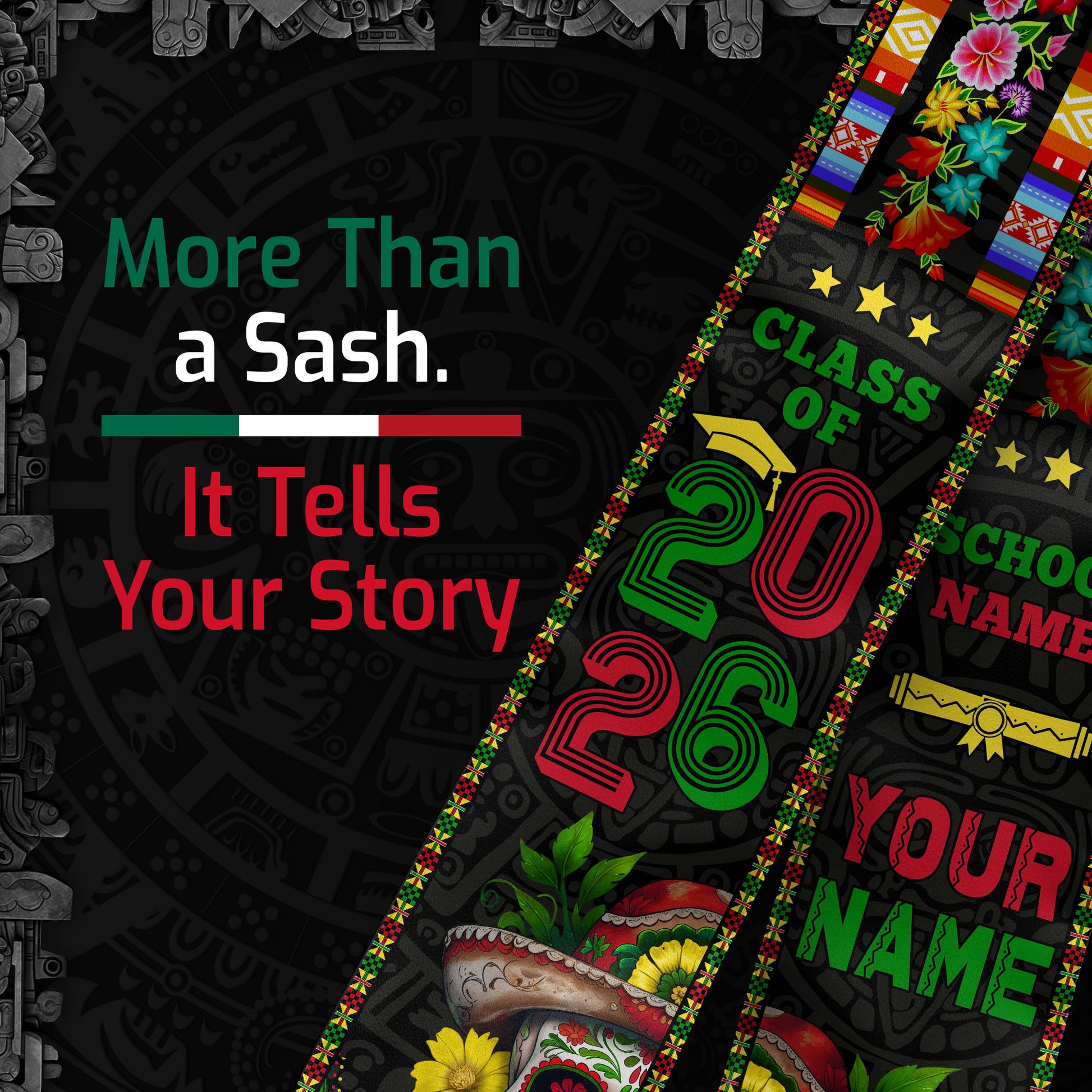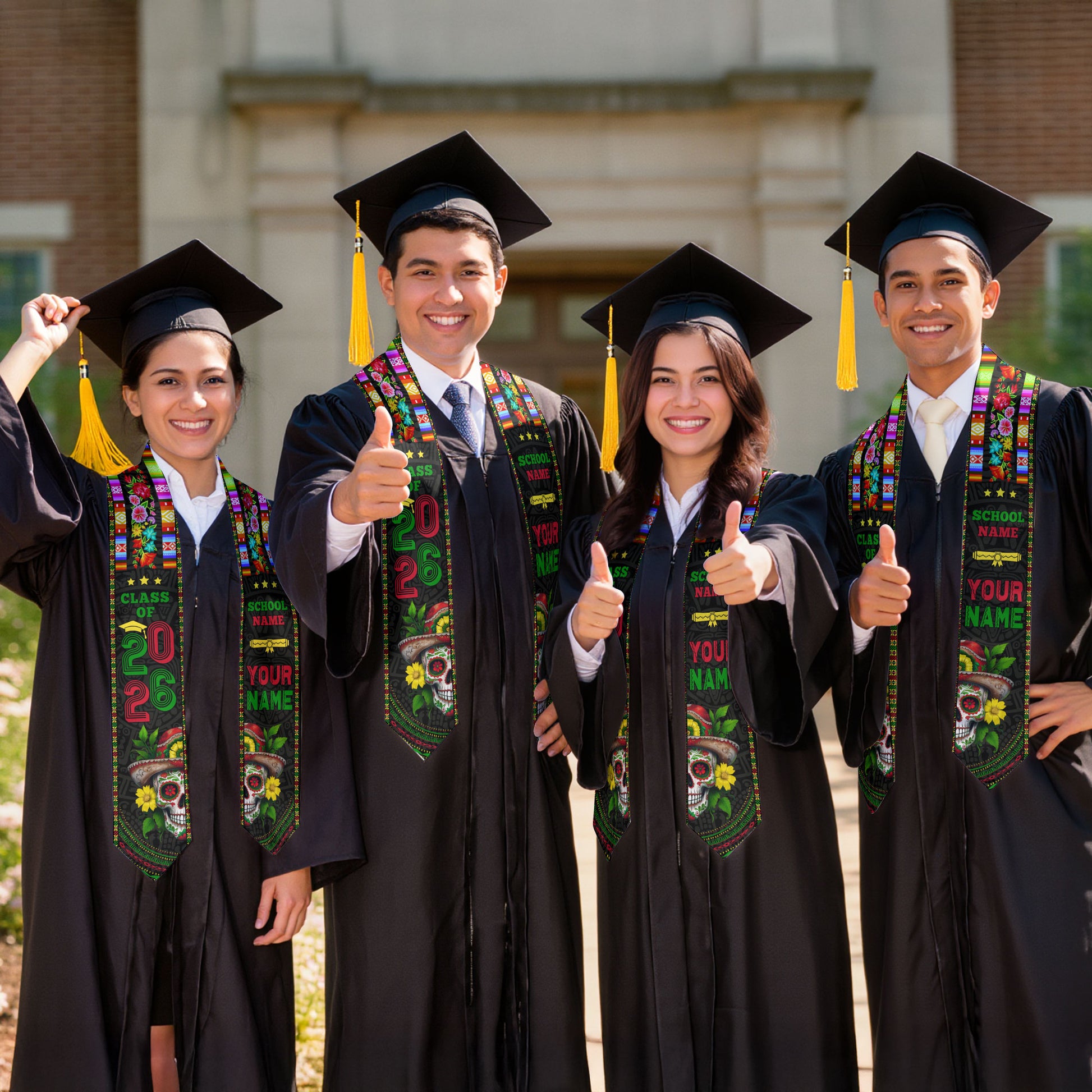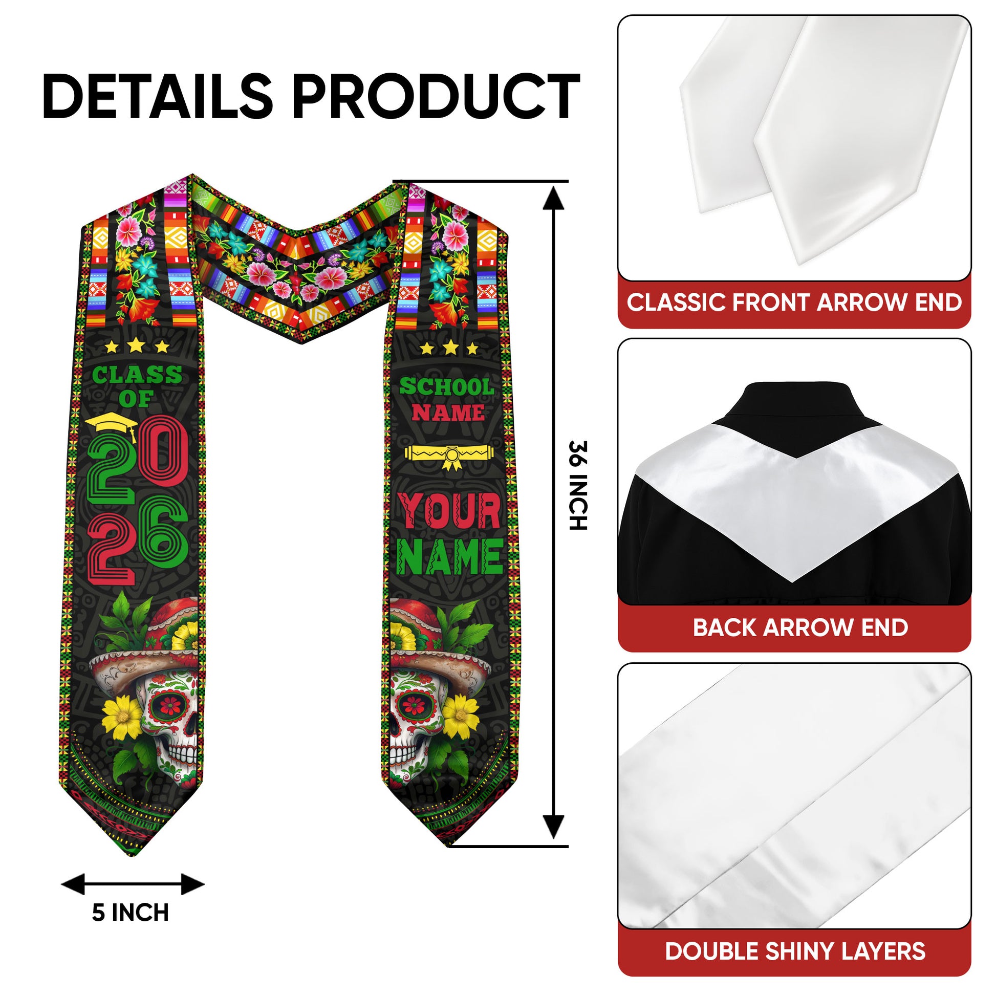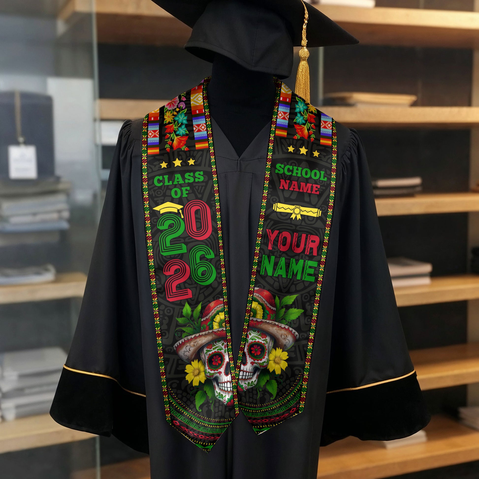 Custom Class of 2026 Graduation Stole – Mexican Serape & Sugar Skull Design, Personalized School and Name Sash