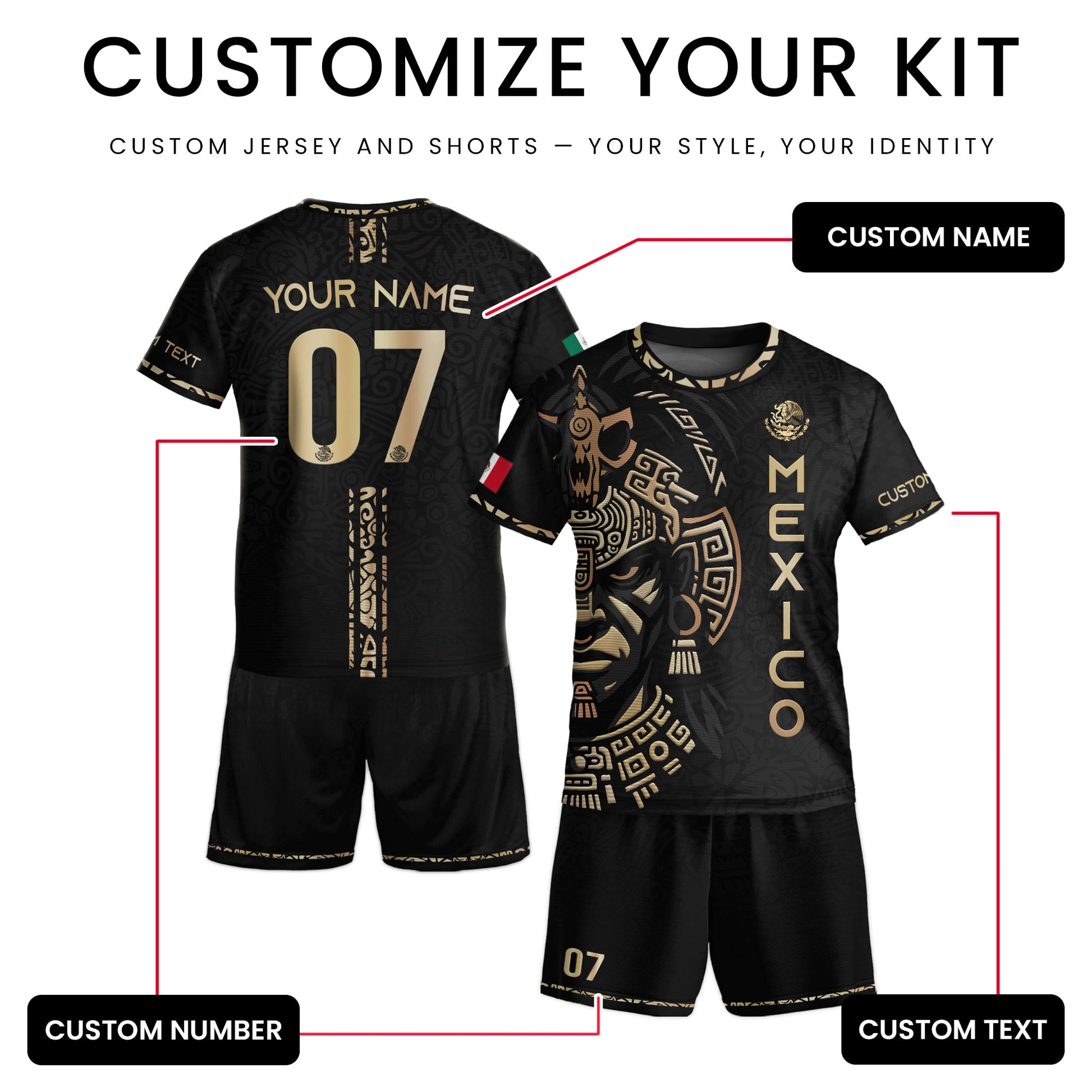 Empower the young warrior with this custom Mexico Aztec soccer jersey — bold black and gold design celebrating heritage, pride, and the fighting spirit of Mexico.