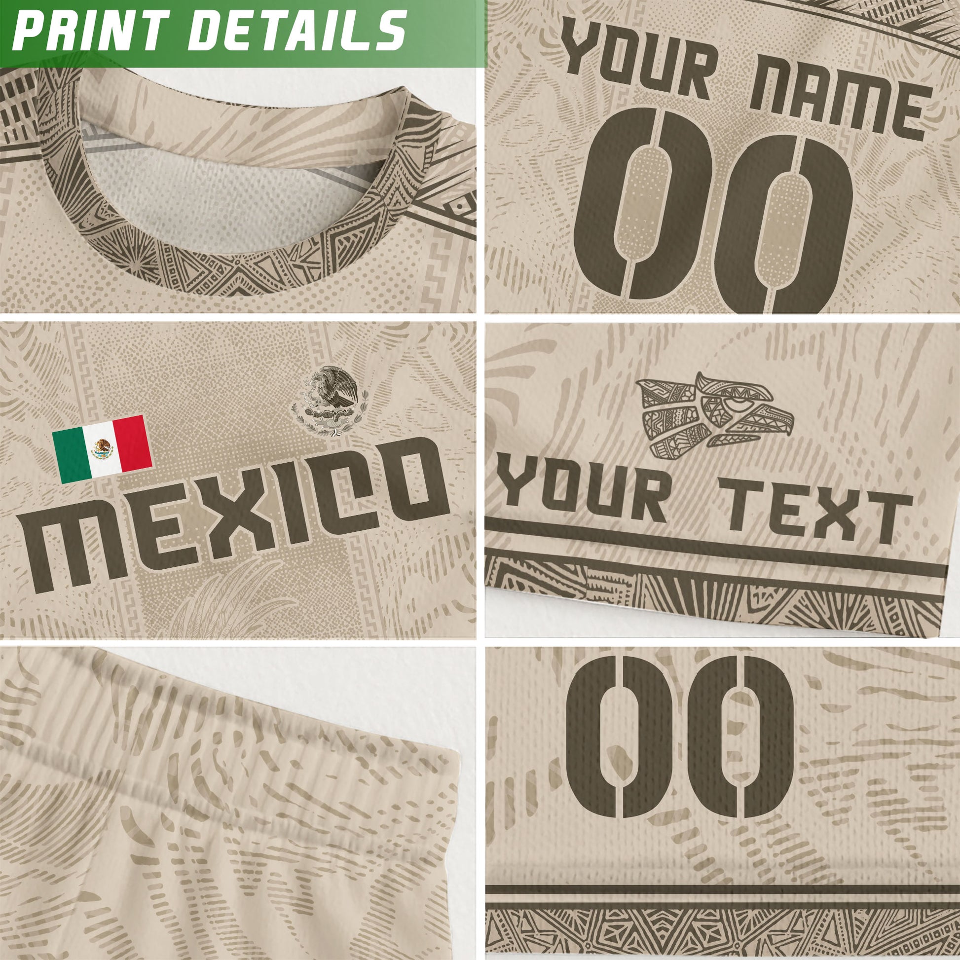Custom kids Mexico soccer jersey in beige Aztec eagle design. Lightweight youth jersey with name and number personalization option.