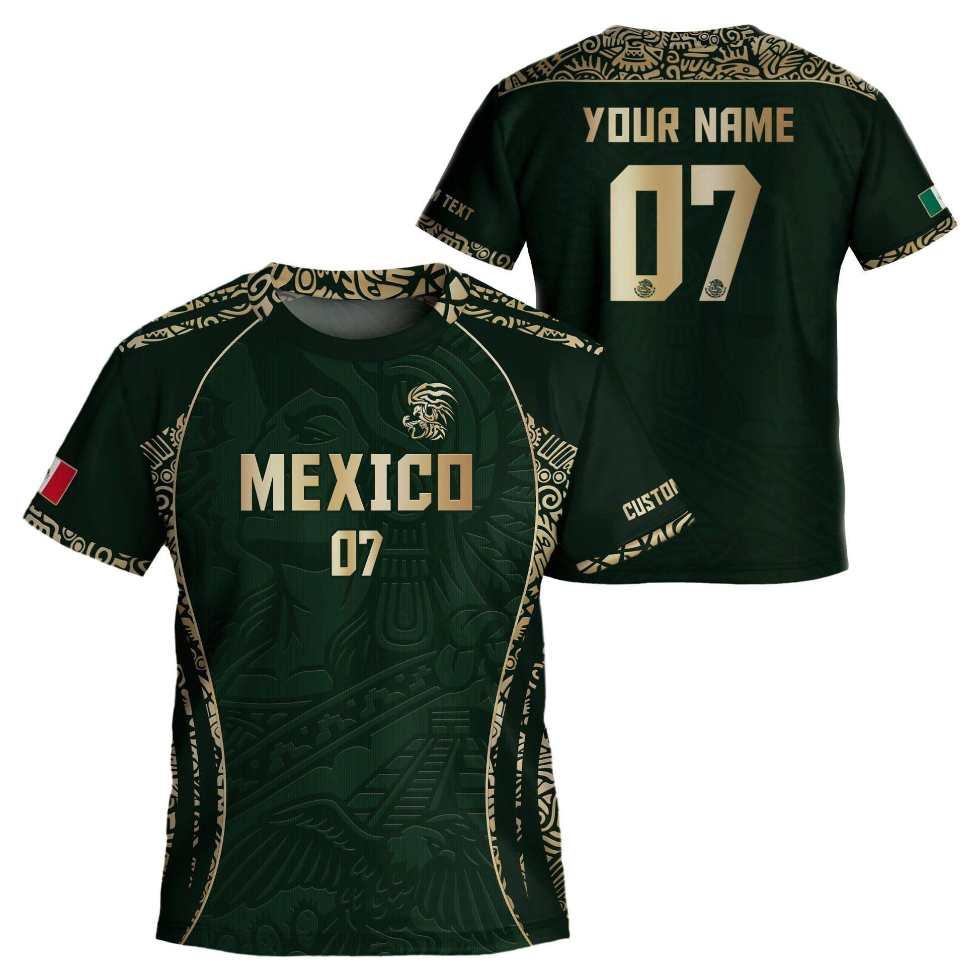 Custom kids Mexico soccer jersey in dark green Aztec eagle design.