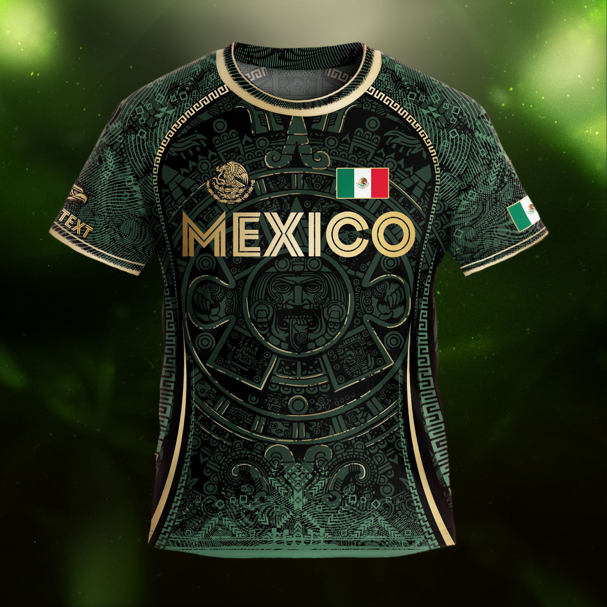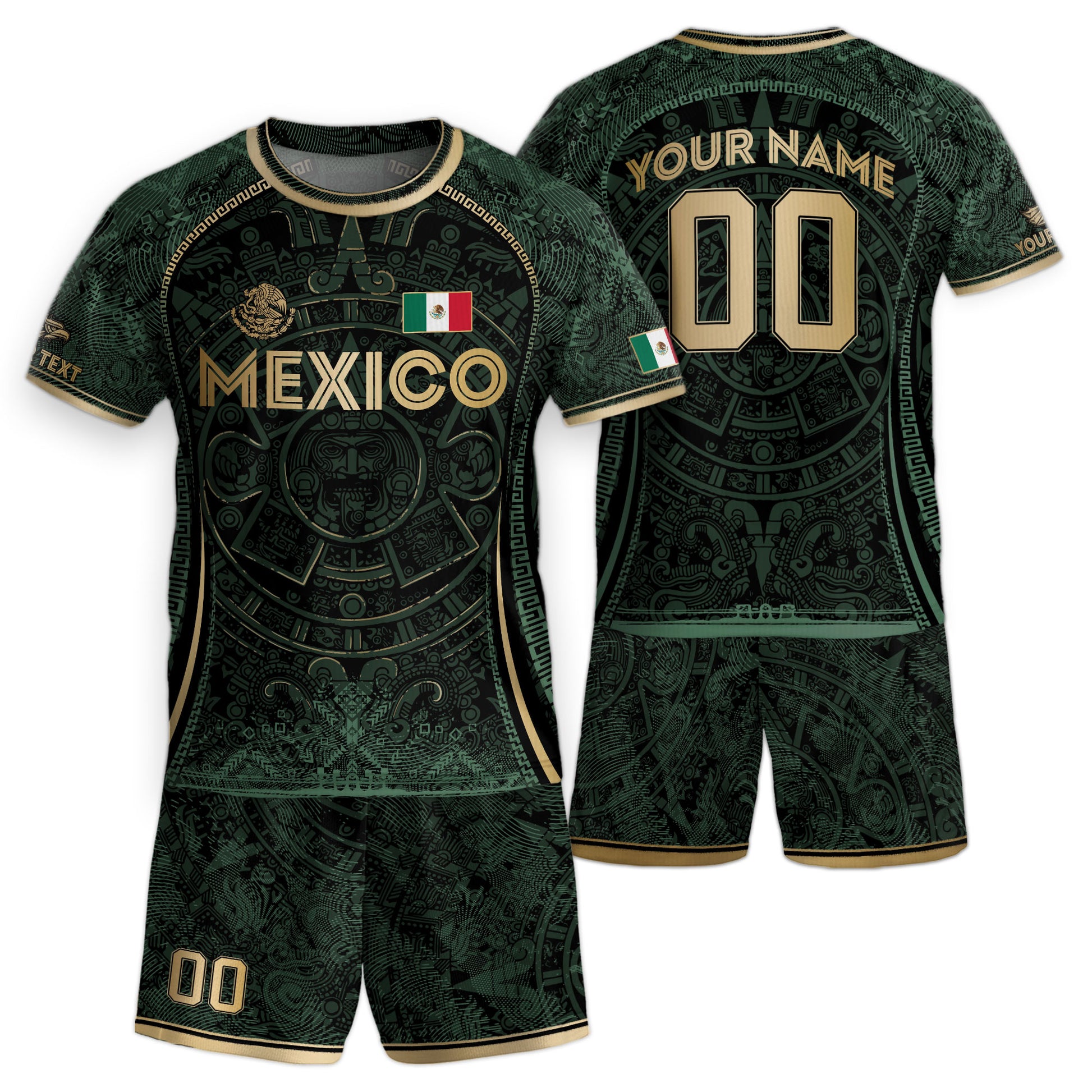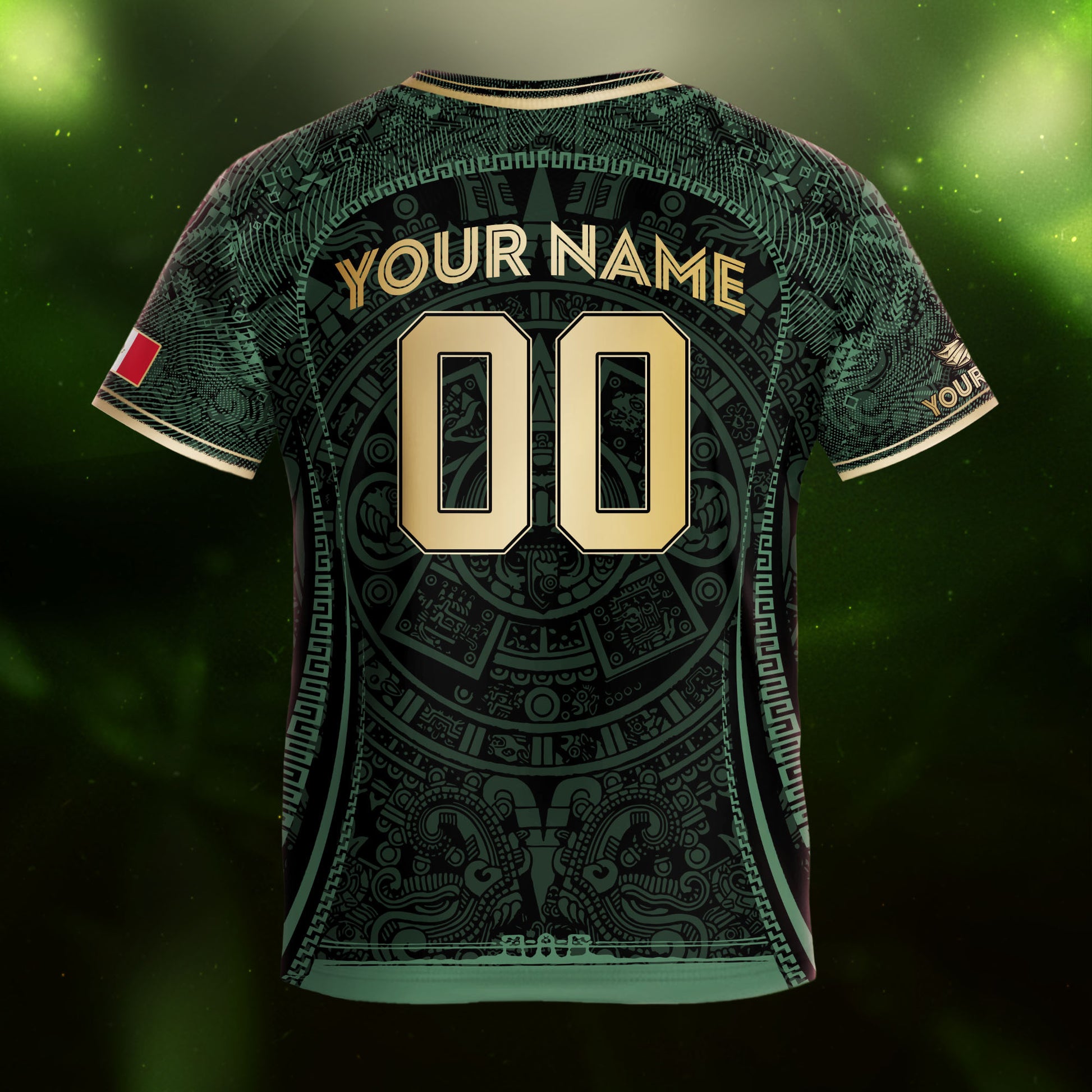 Custom kids Mexico soccer jersey in dark green with gold Aztec calendar design. Youth jersey with name and number personalization option.