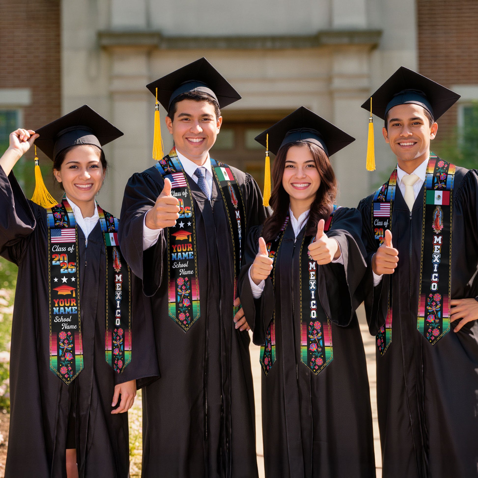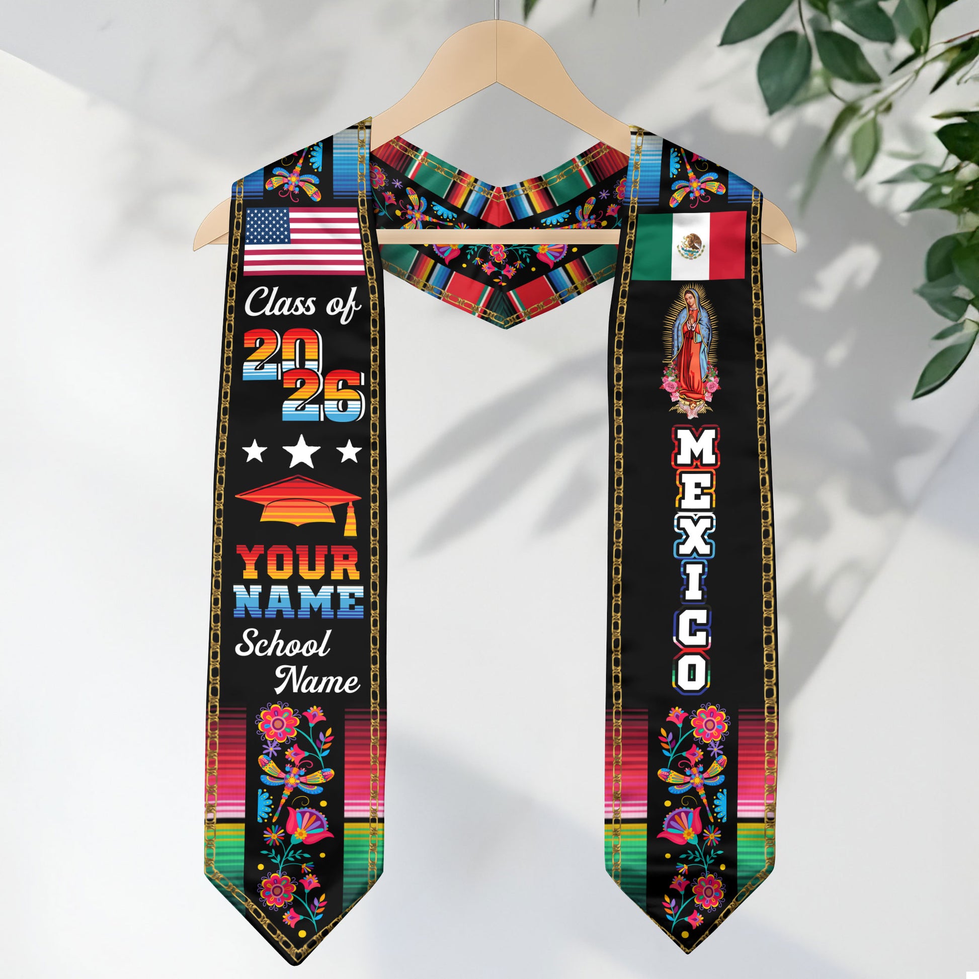 Custom Mexican Graduation Stole 2026 Aztec Floral Butterfly Virgin Mary USA Mexico Flag