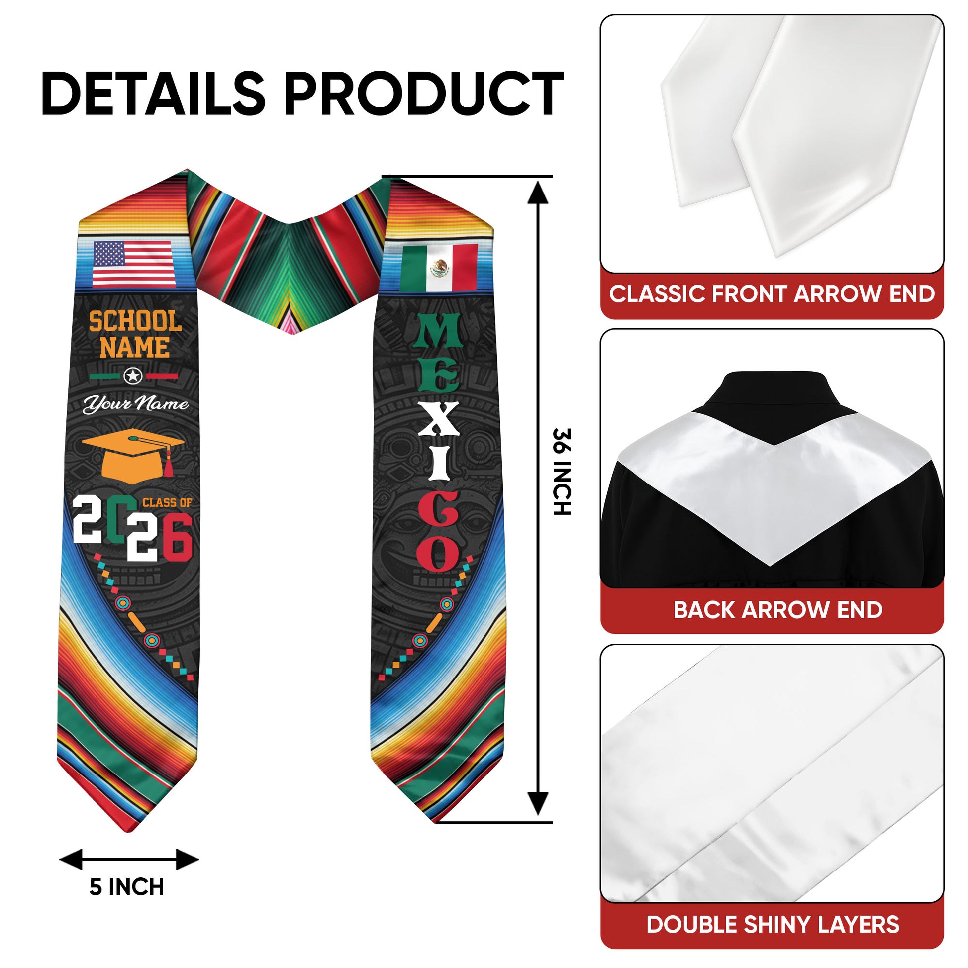 Custom Mexican Graduation Stole Mexico Sash Aztec Pattern Serape USA Flag 2026