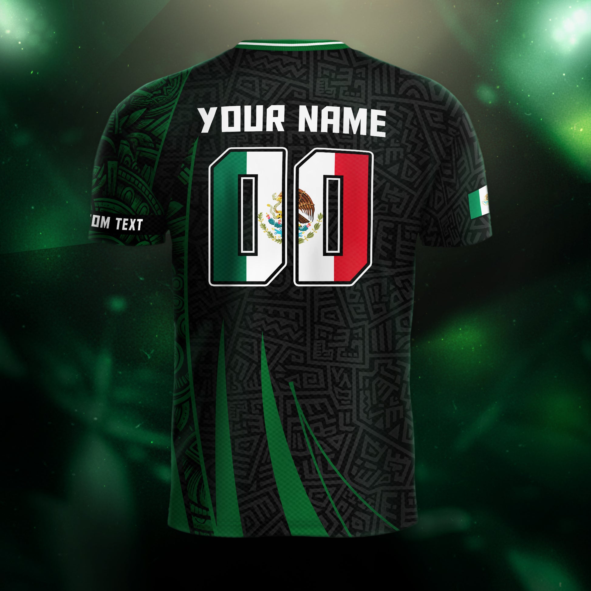 Stand out with this custom Mexico jersey featuring bold green Aztec stripes on black. Add your name and number to show your pride in Mexico’s warrior spirit.