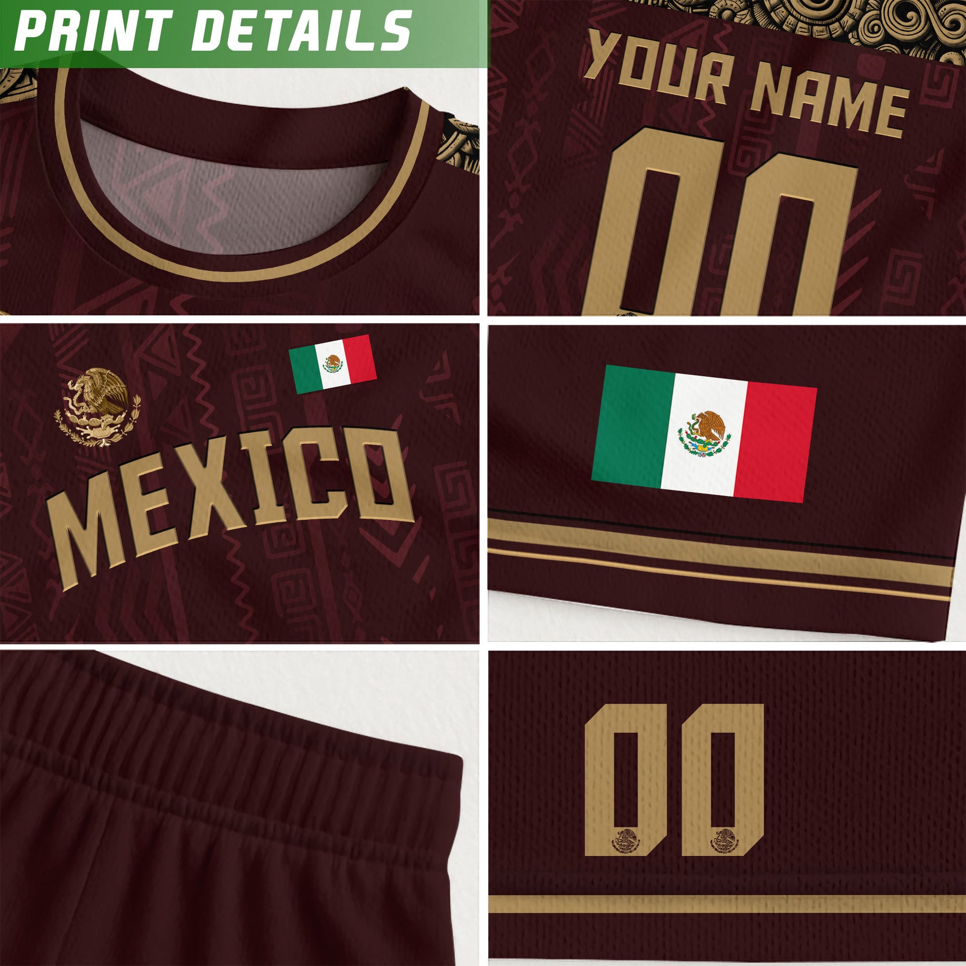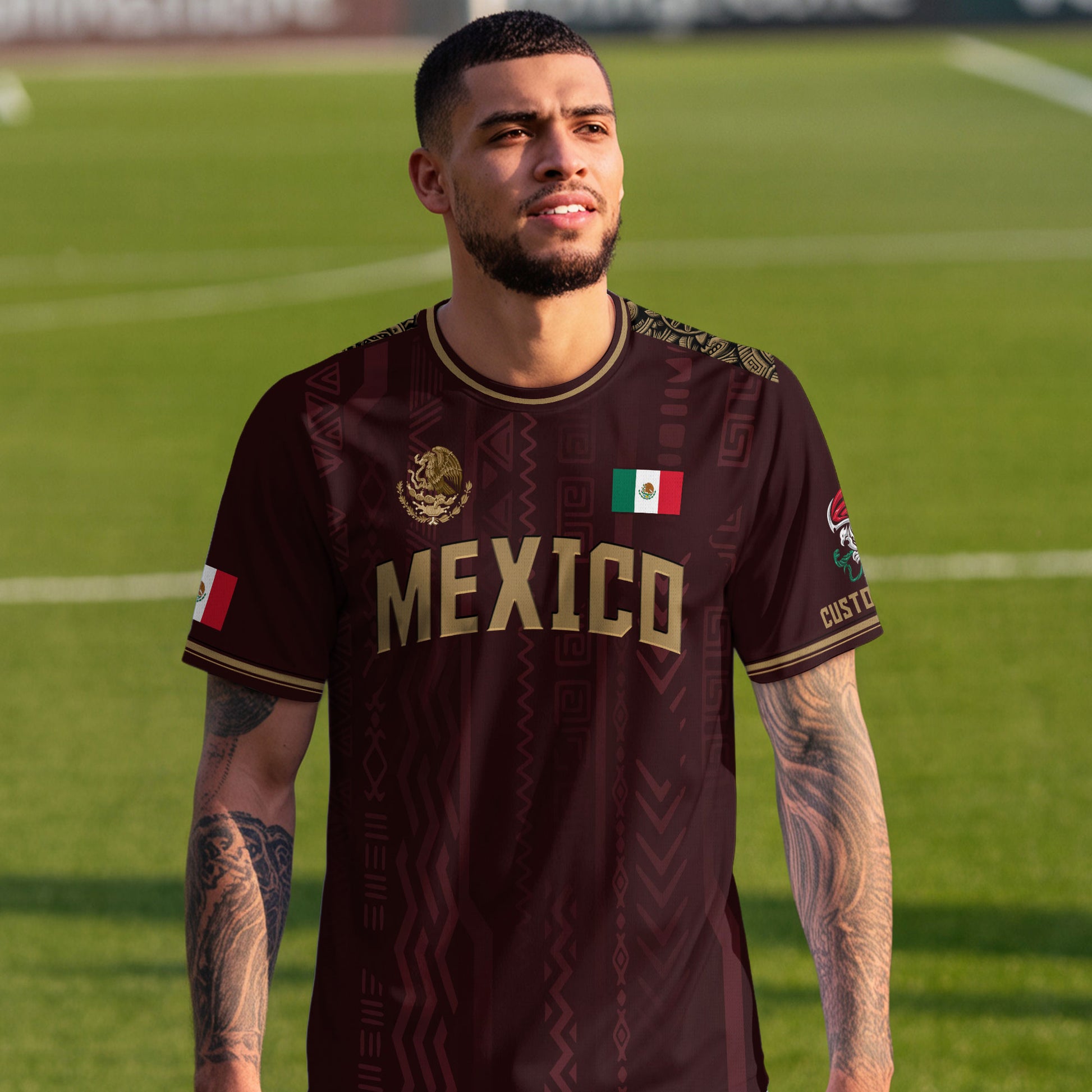 Show your Mexican pride on and off the field with this custom Aztec soccer jersey — bold maroon design, gold details, and a tribute to heritage and strength.