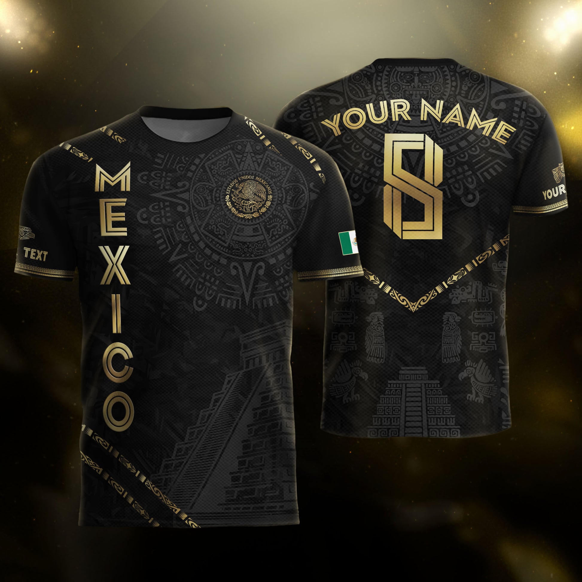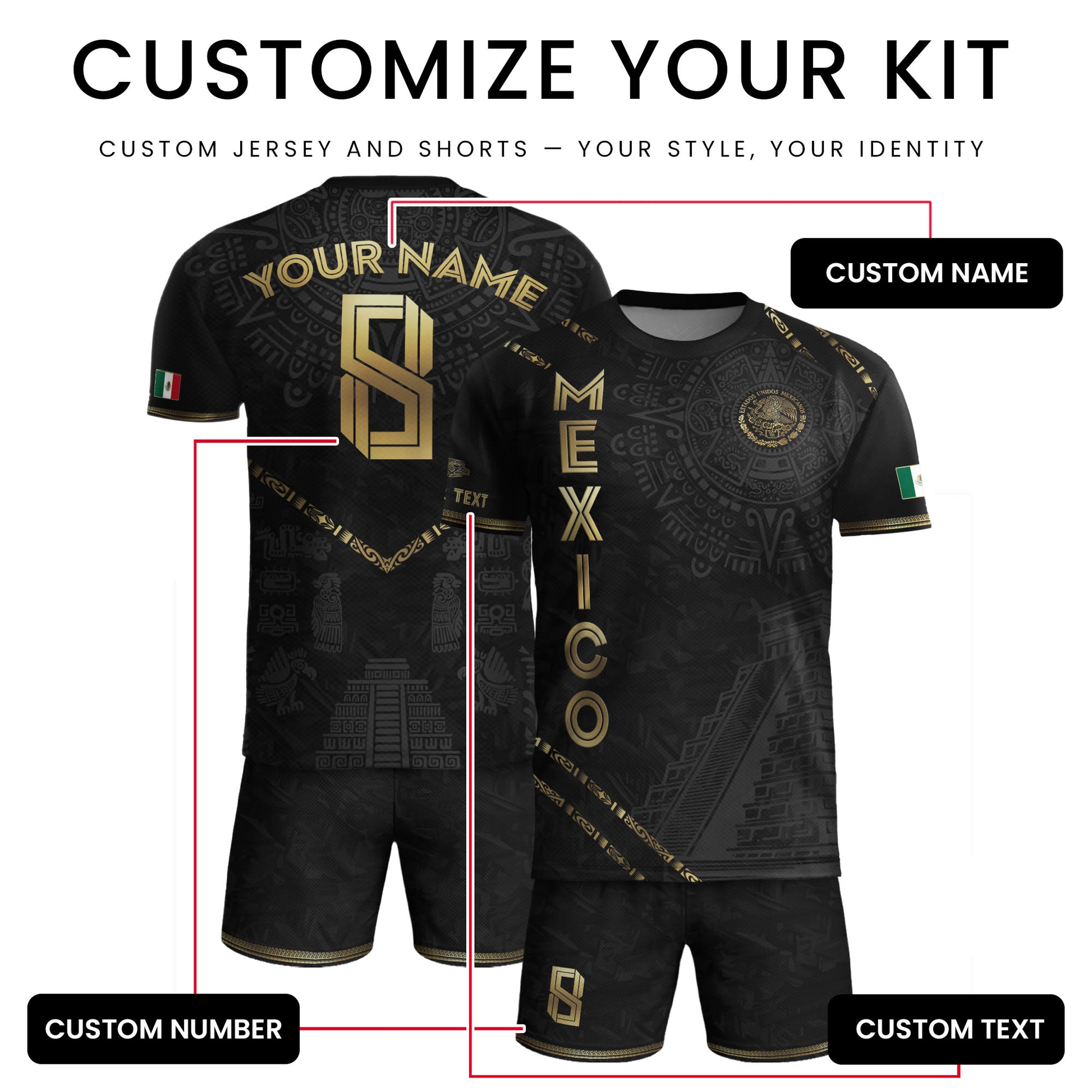 Custom black and gold soccer jersey featuring Aztec calendar and pyramid design with Mexico crest. Personalize with your name and number. Lightweight, breathable, and available as jersey only or full set with shorts.