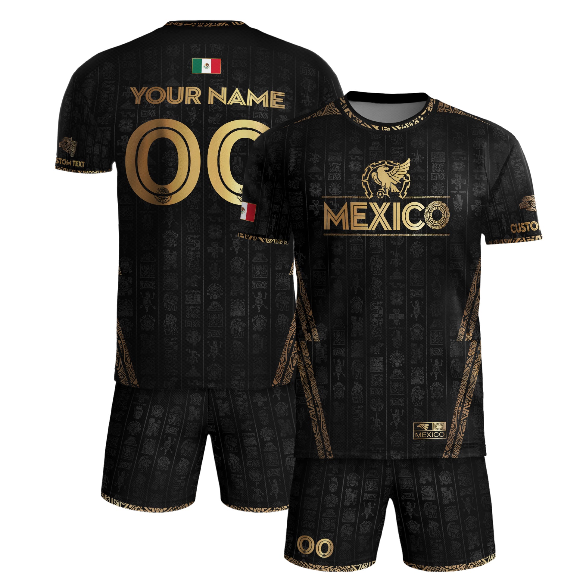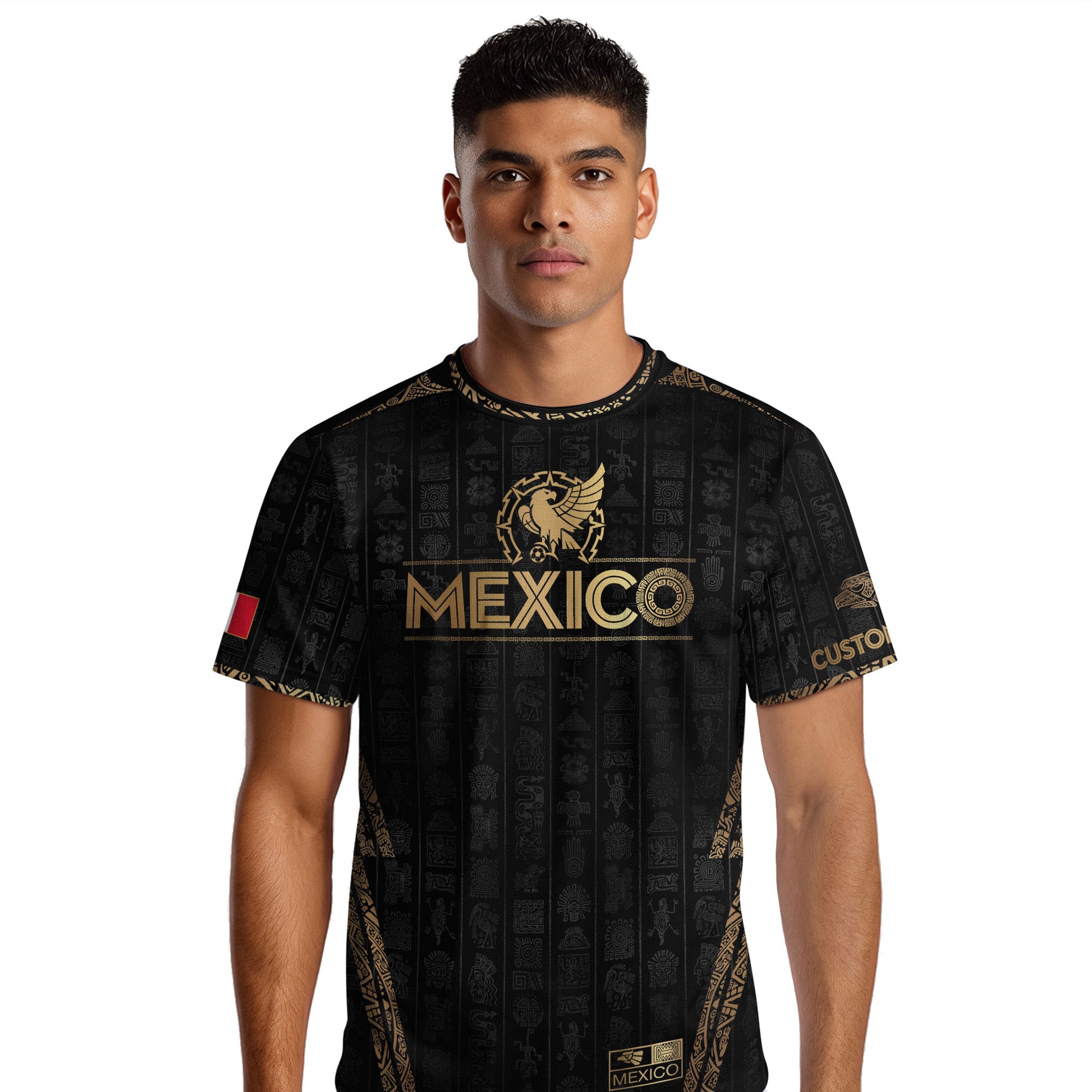 Show your Mexican pride with this custom black and gold jersey, featuring an Aztec eagle design and premium cultural detailing for a bold, elite look.