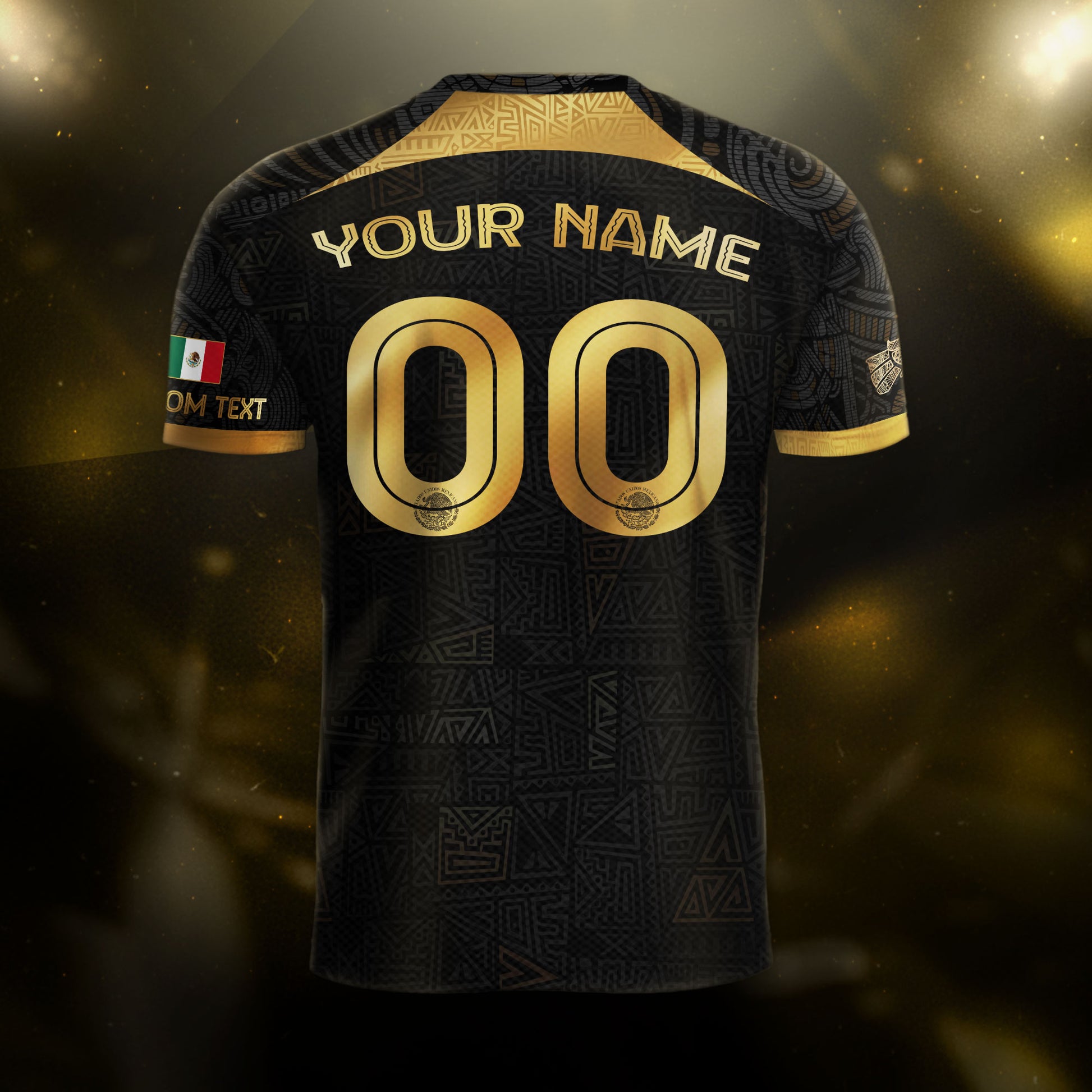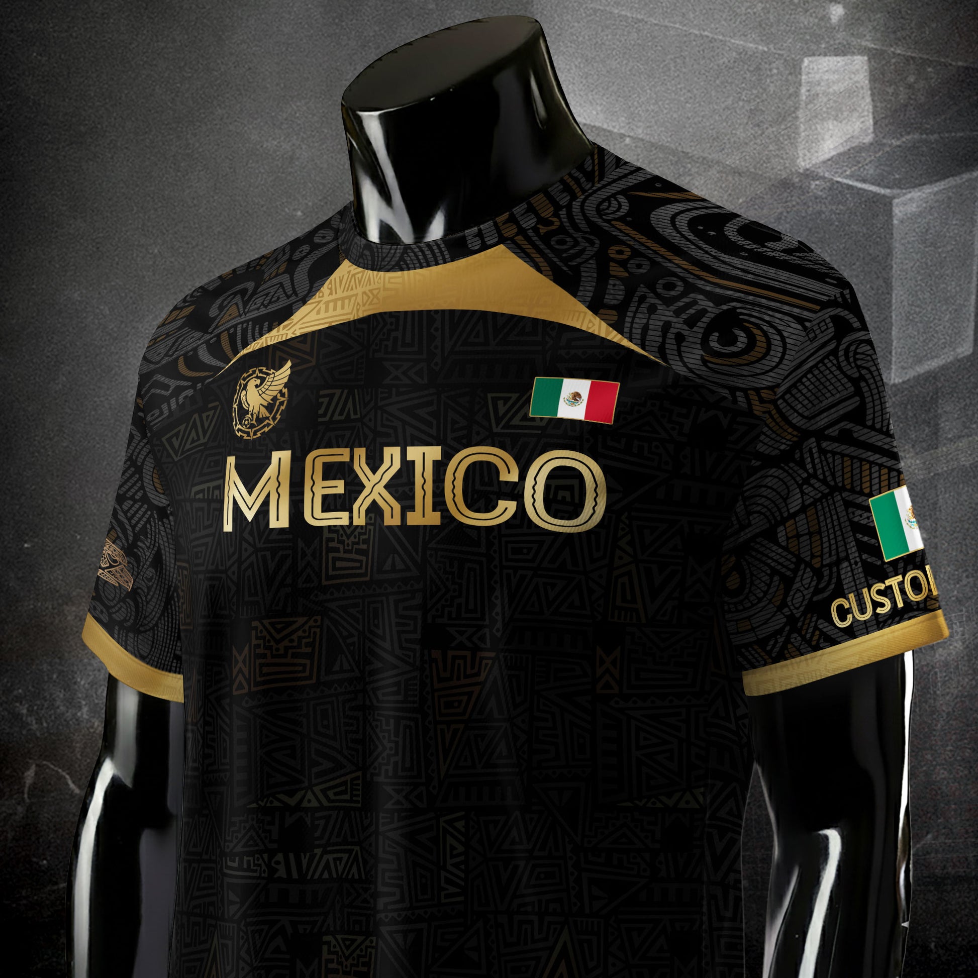 Embrace the Aztec warrior spirit with this custom black and gold Mexico soccer jersey featuring detailed tribal patterns and a bold national emblem.