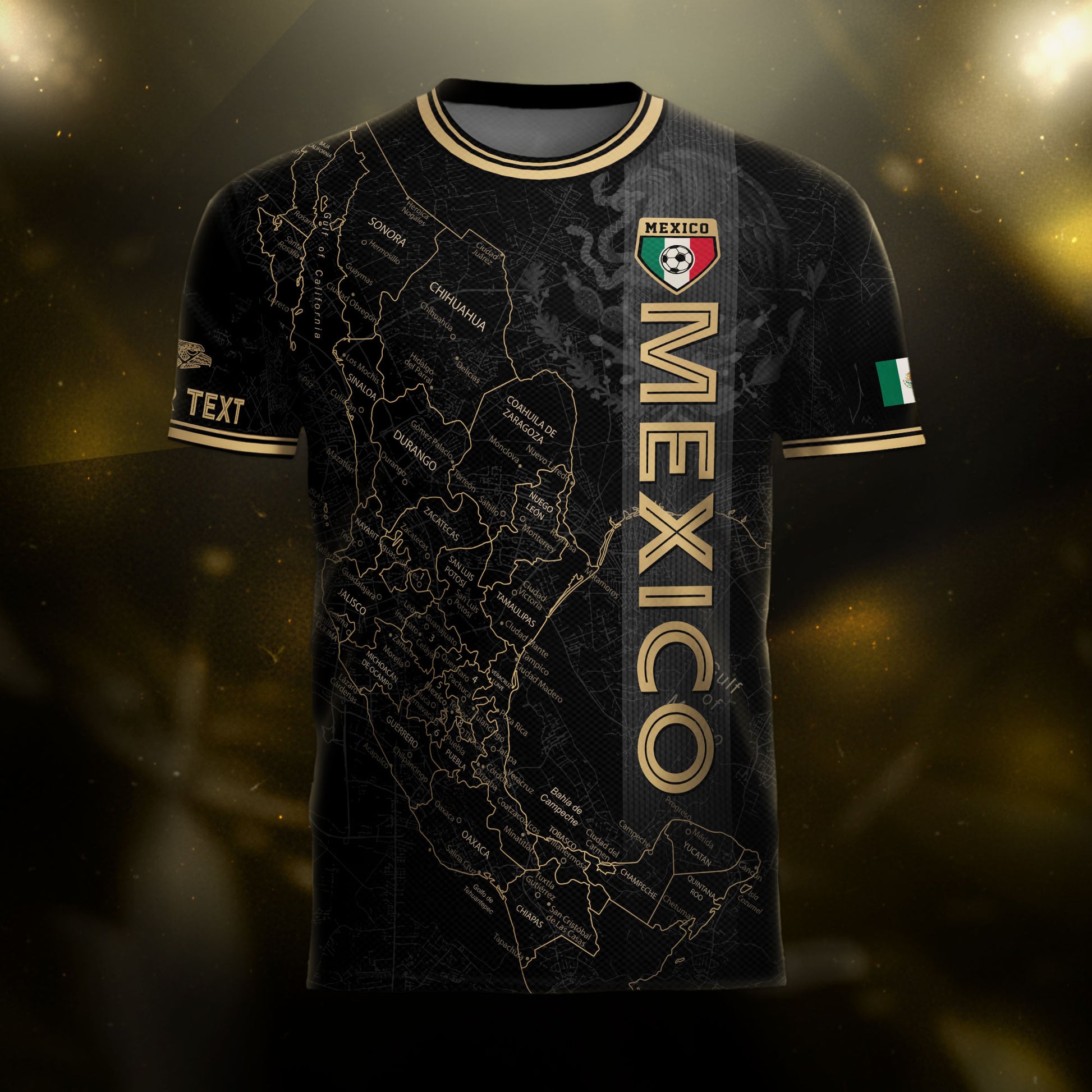Celebrate Mexico’s legacy in style with this custom black and gold soccer jersey featuring a sleek heritage map and premium metallic details.