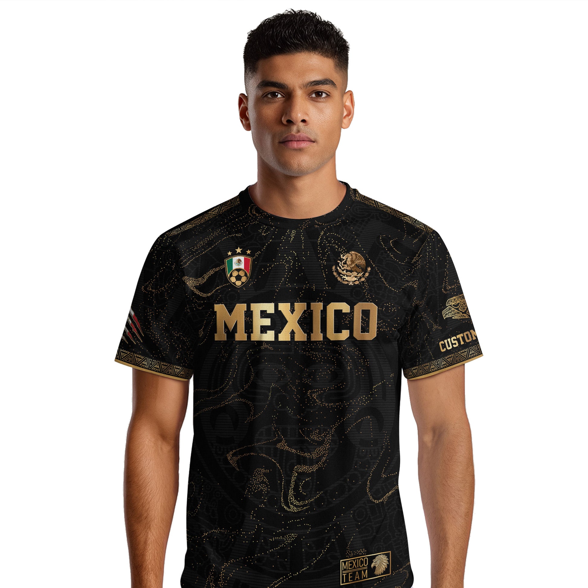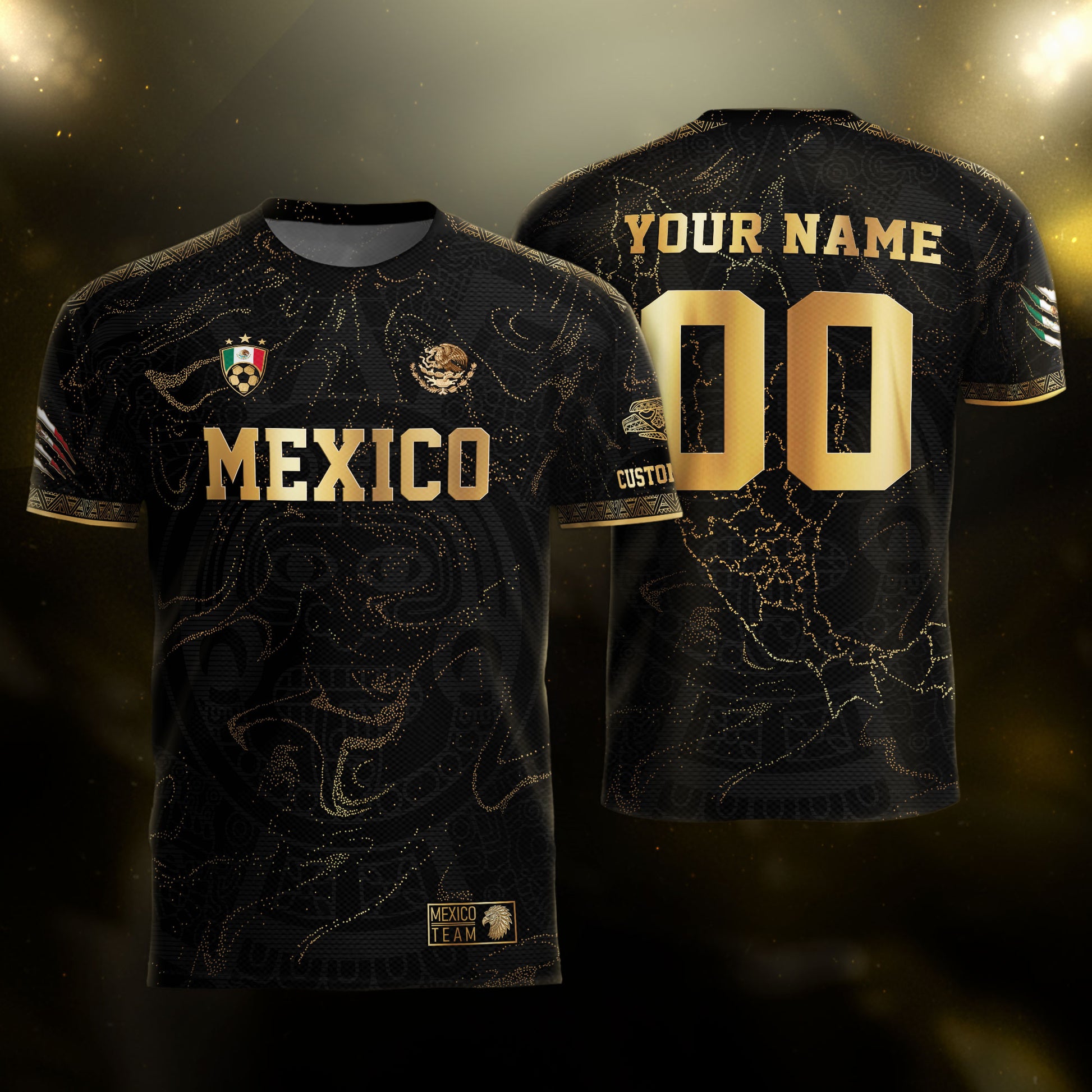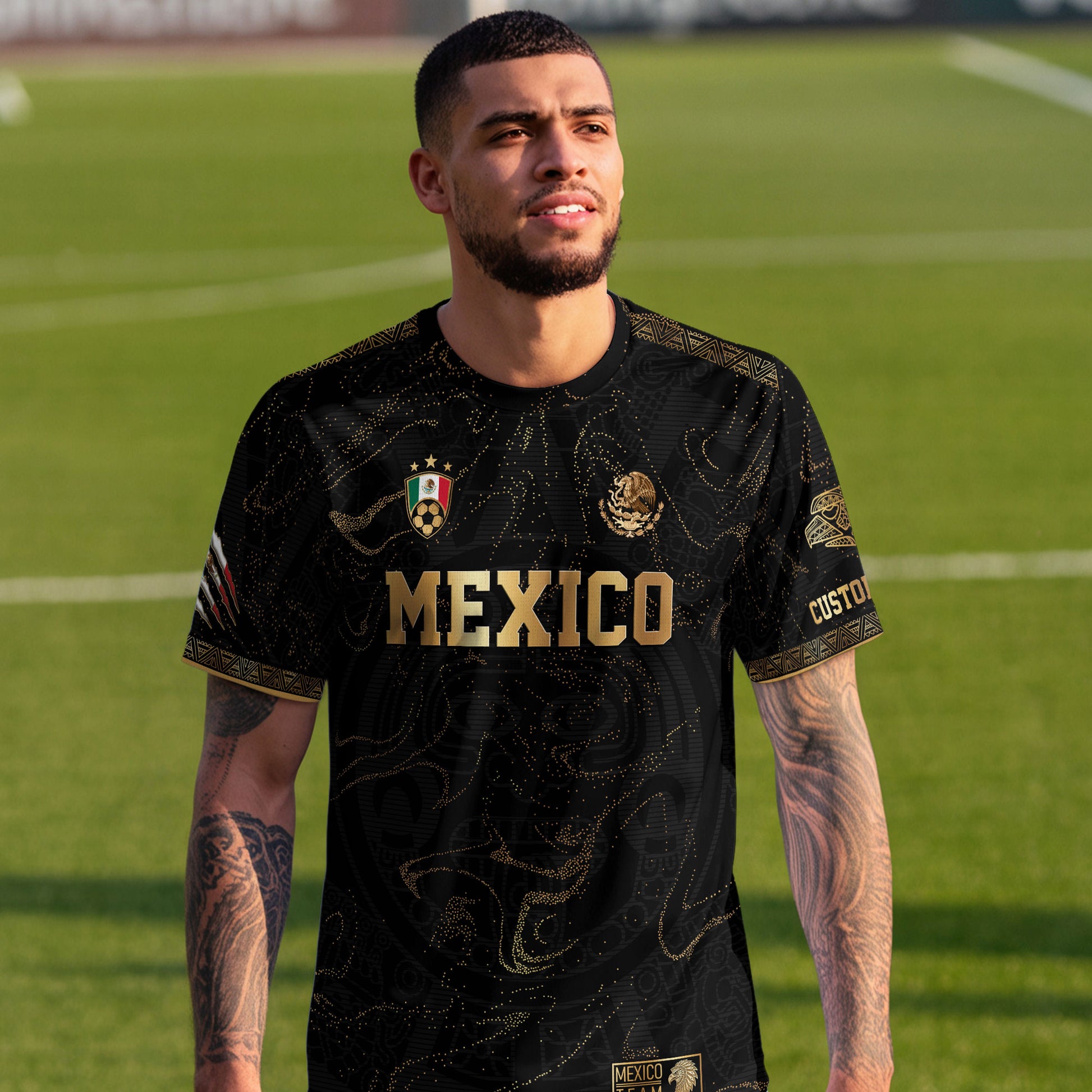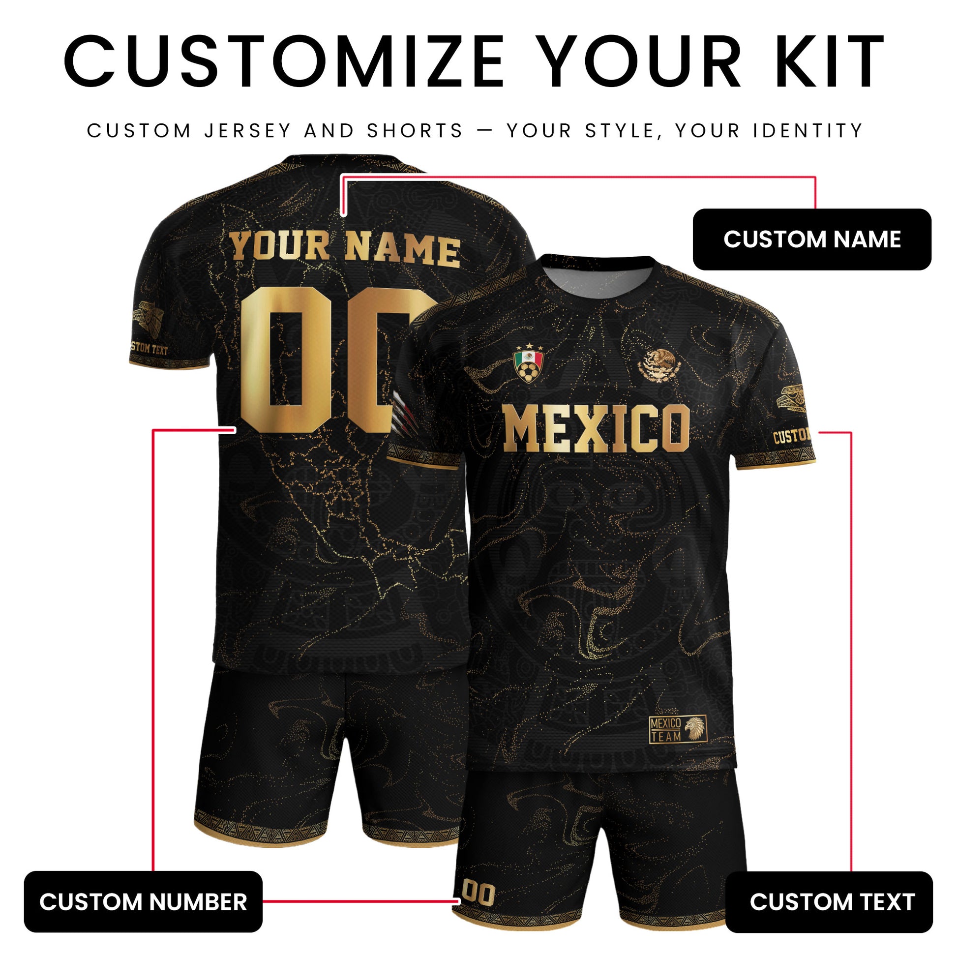 Stand out with this custom black and gold Mexico soccer jersey featuring a detailed heritage map and Aztec-inspired pattern that honors national pride and legacy.