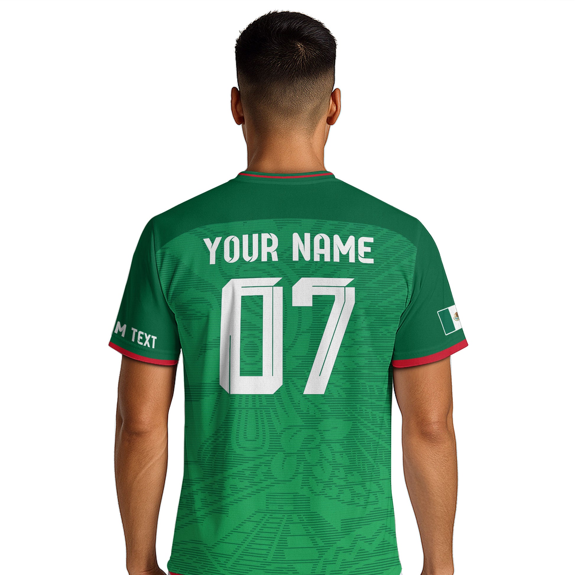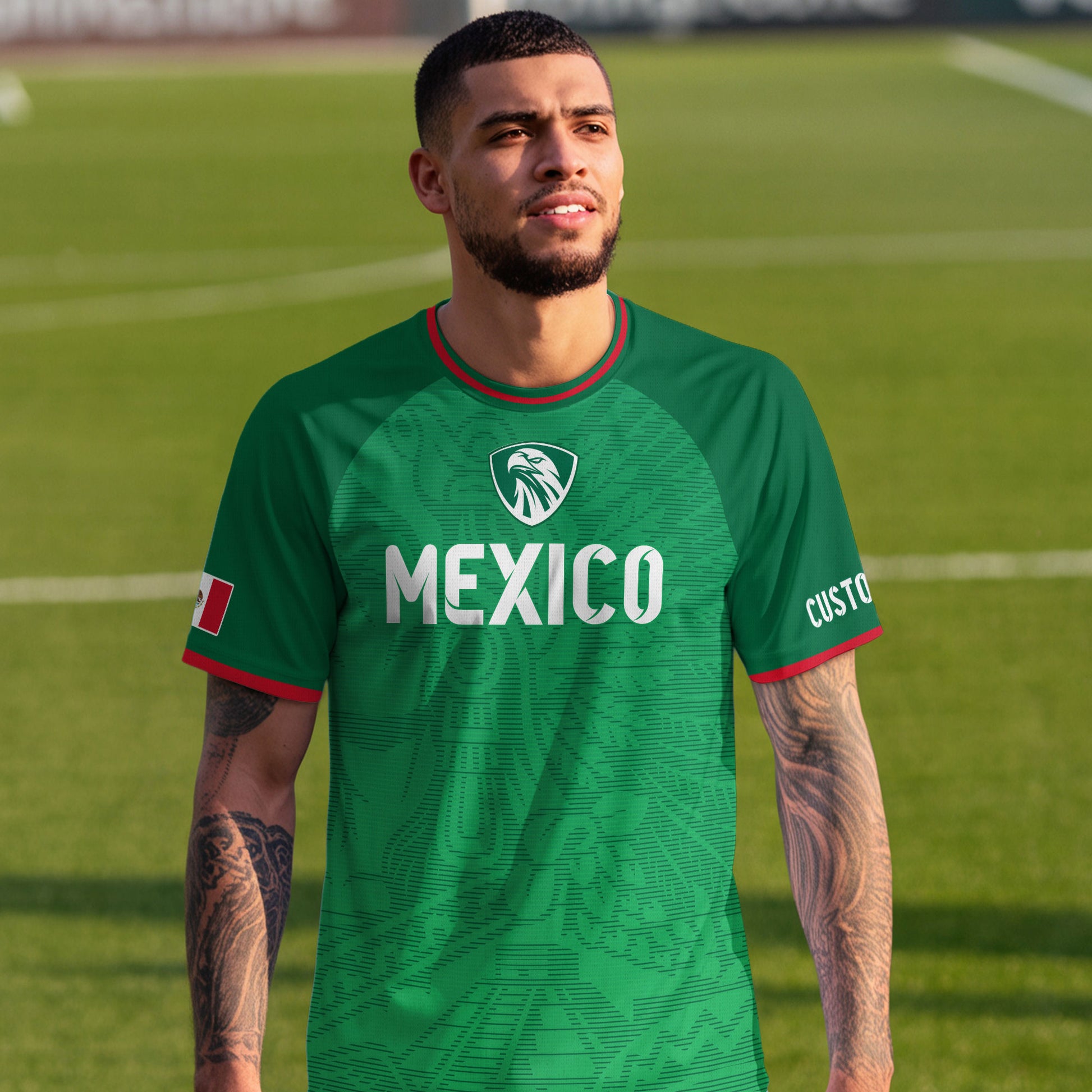Custom green soccer jersey with Aztec-inspired pattern and Mexico crest. Personalize with your name and number. Lightweight, breathable, and available as jersey only or full set with shorts.