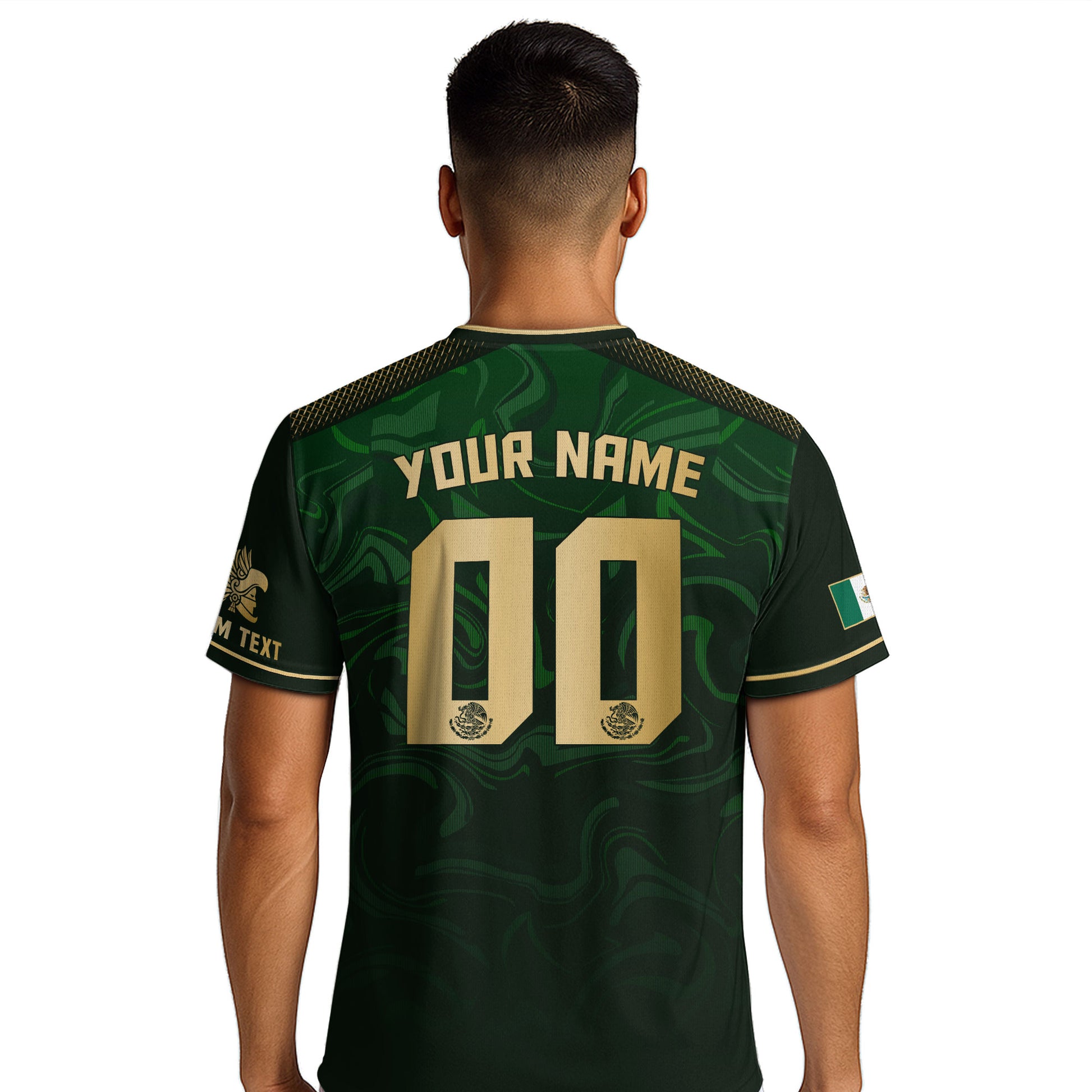 Level up your game with this modern Mexico jersey, featuring a bold eagle crest and subtle green patterns. Personalize with your name and number in gold for a premium look.
