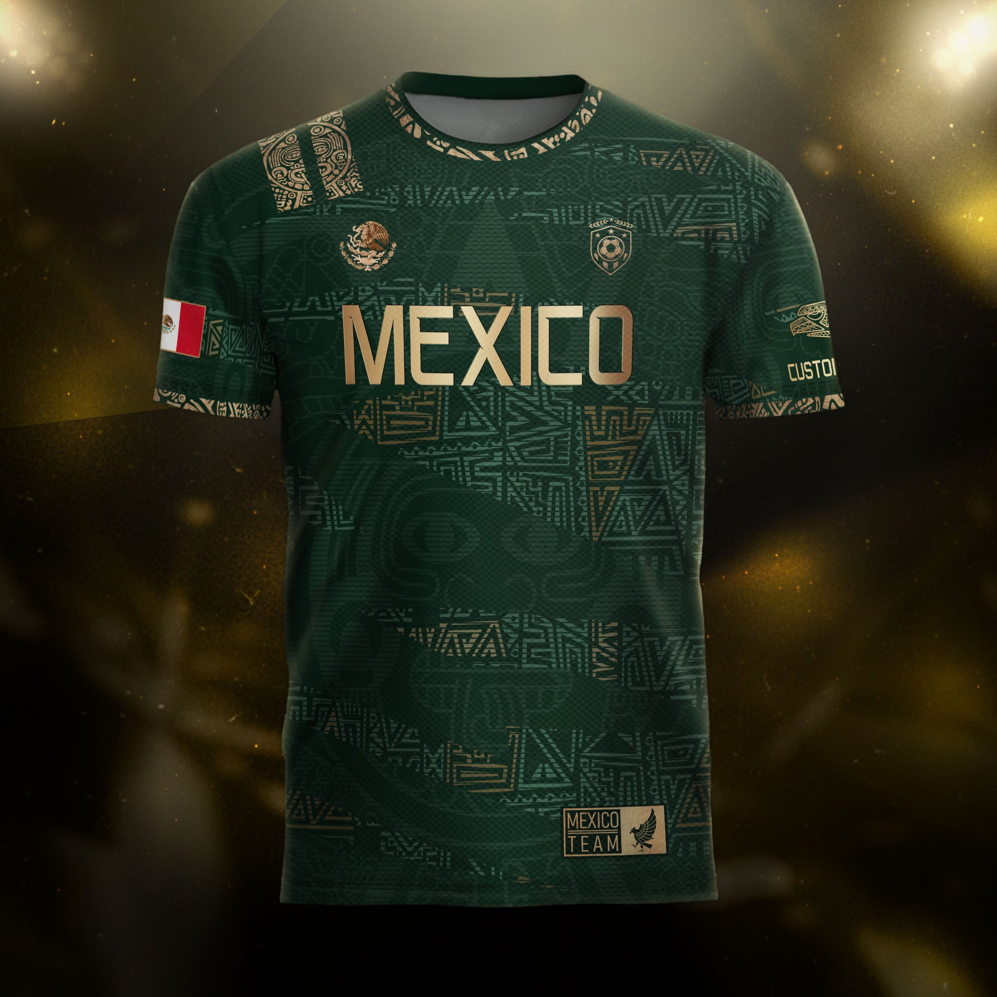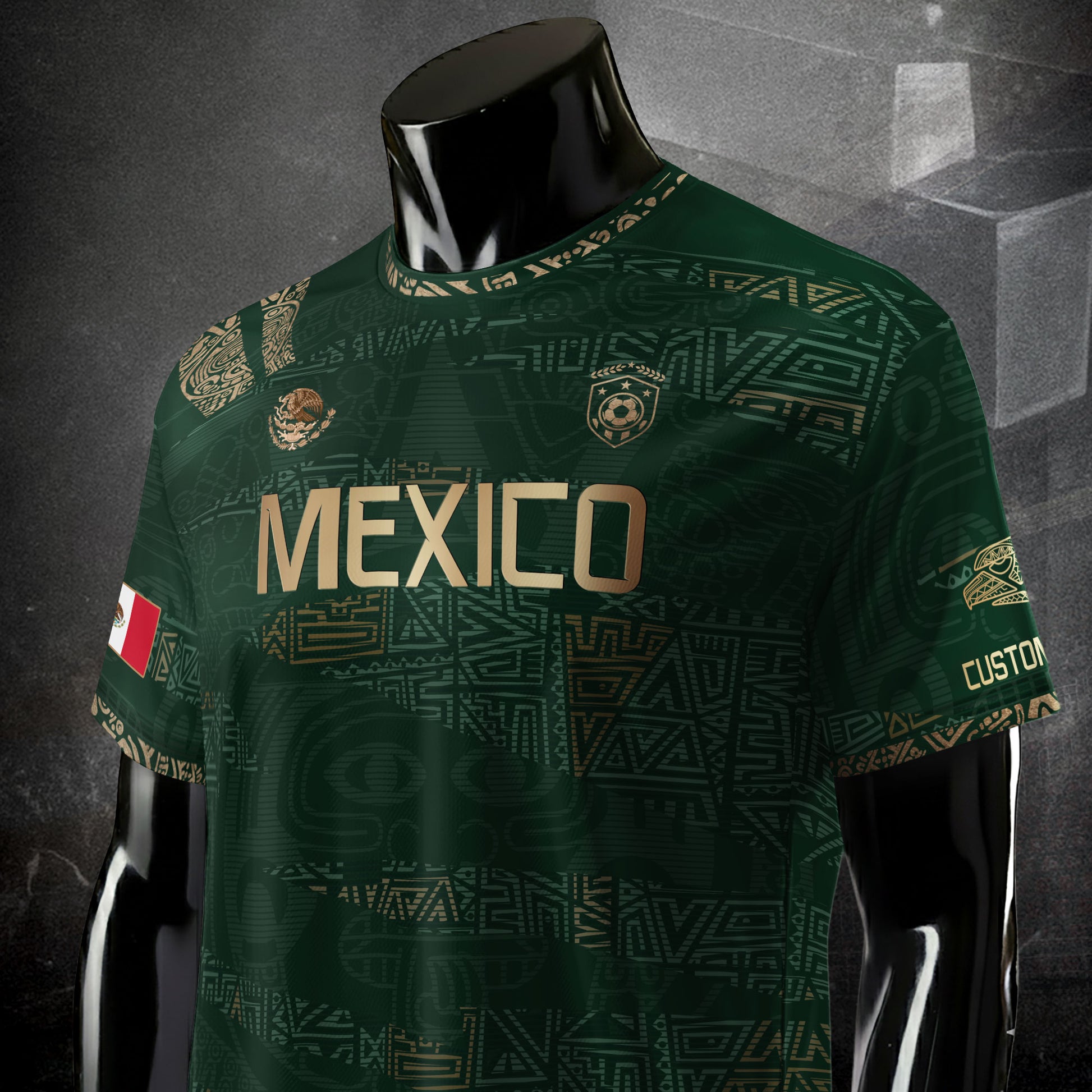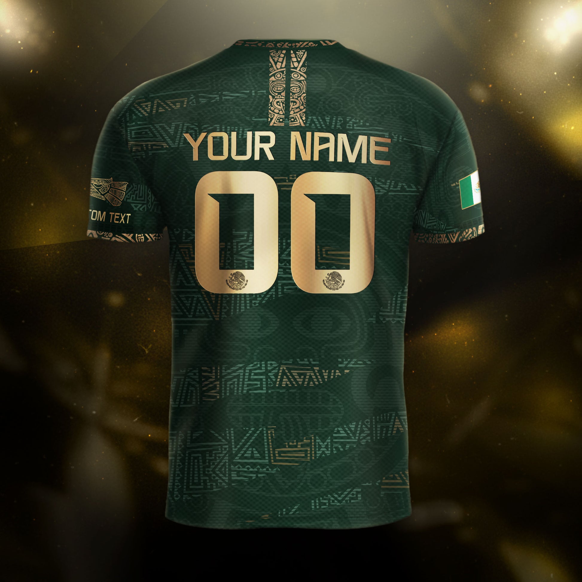 A timeless Aztec-inspired soccer jersey in green and gold — personalize it with your name and show your Mexican pride.