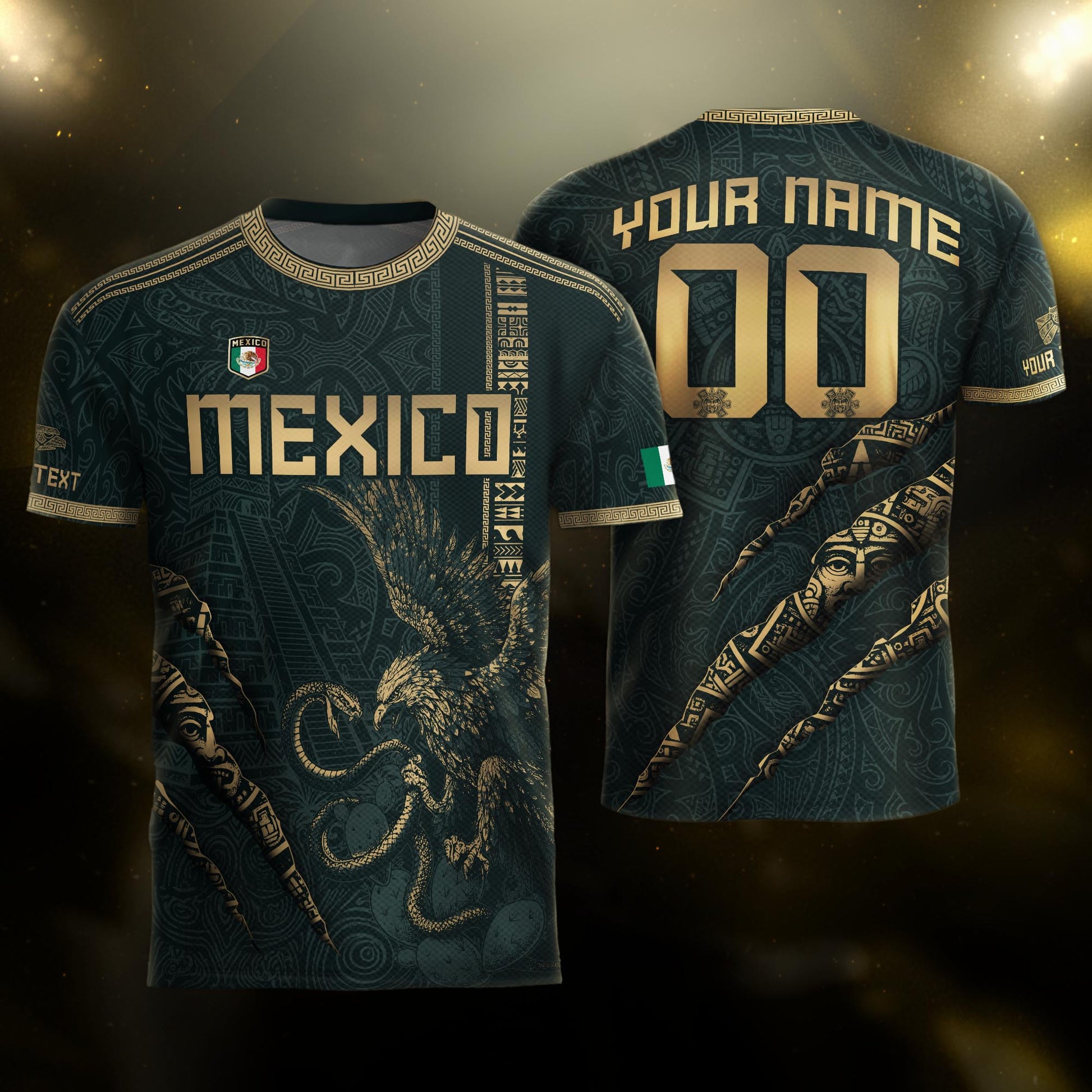 Show your warrior spirit with this green and gold jersey featuring the Aztec eagle and claw marks — strength, pride, and Mexican power united.
