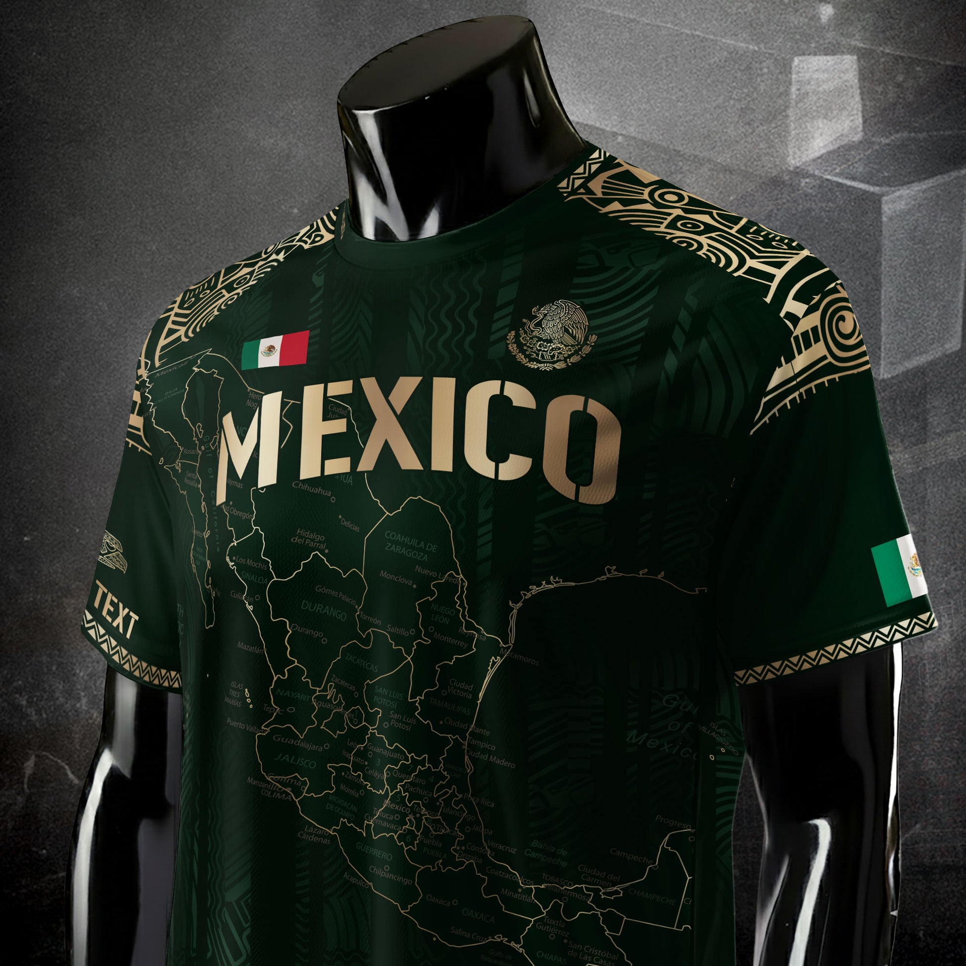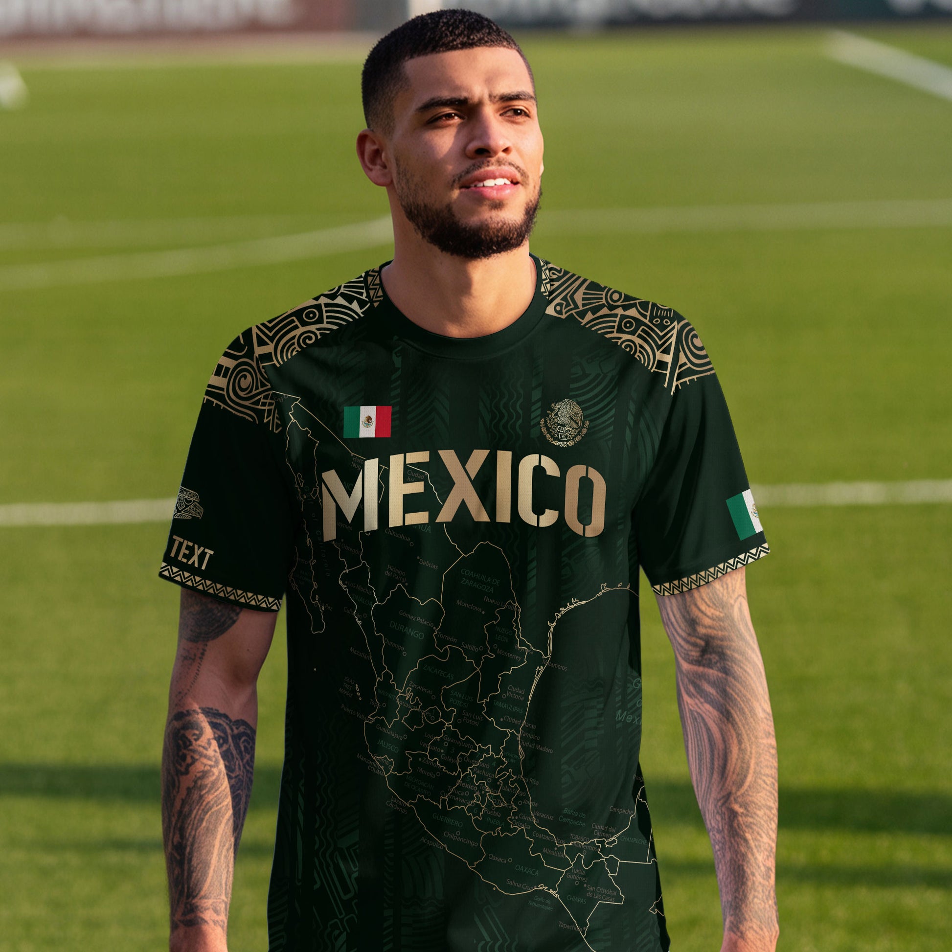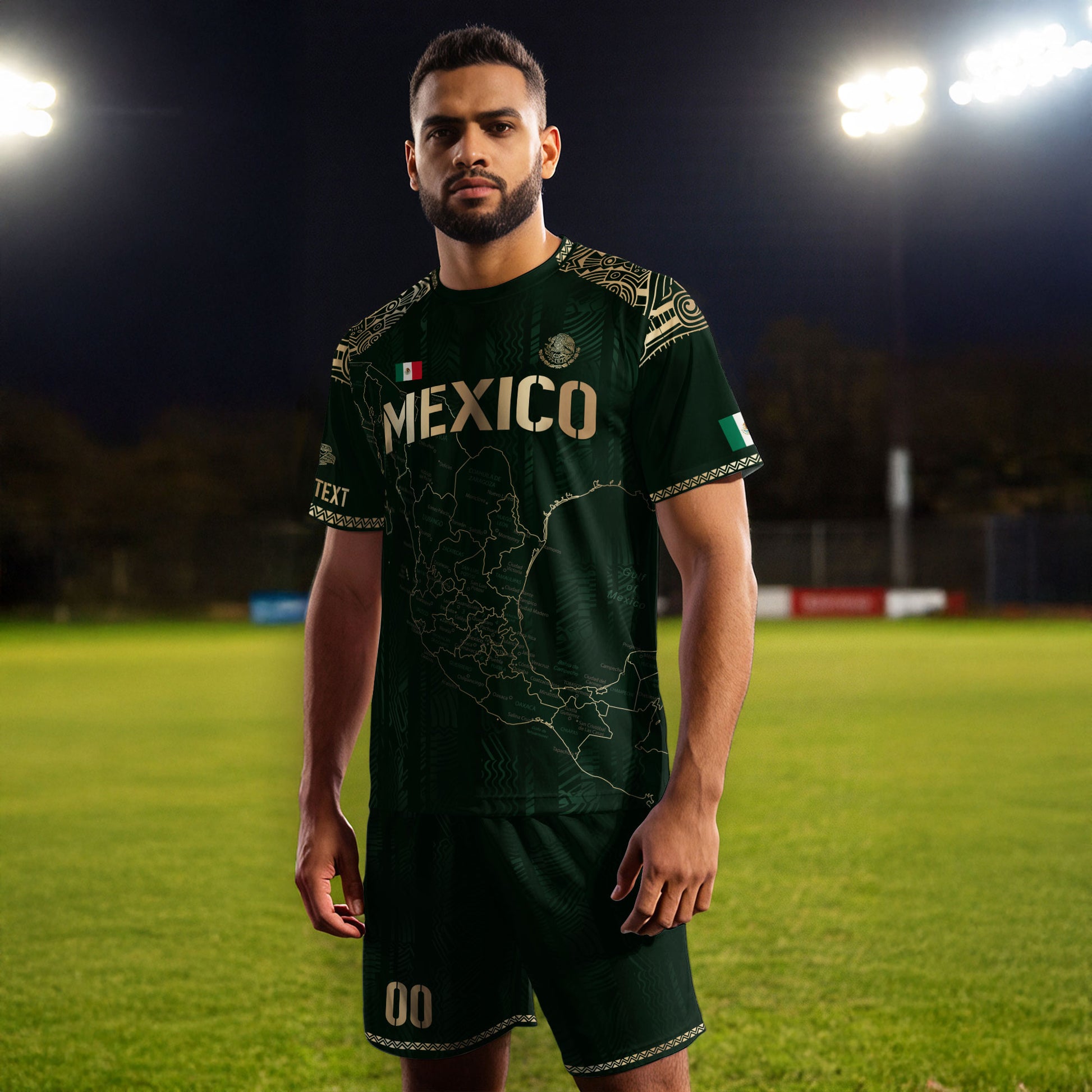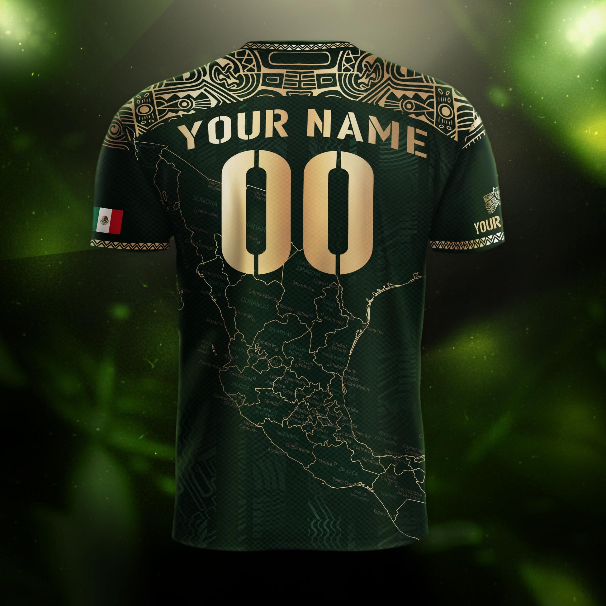 Personalize your pride with this green and gold jersey featuring Mexico’s map and Aztec-inspired patterns — tradition made unique.