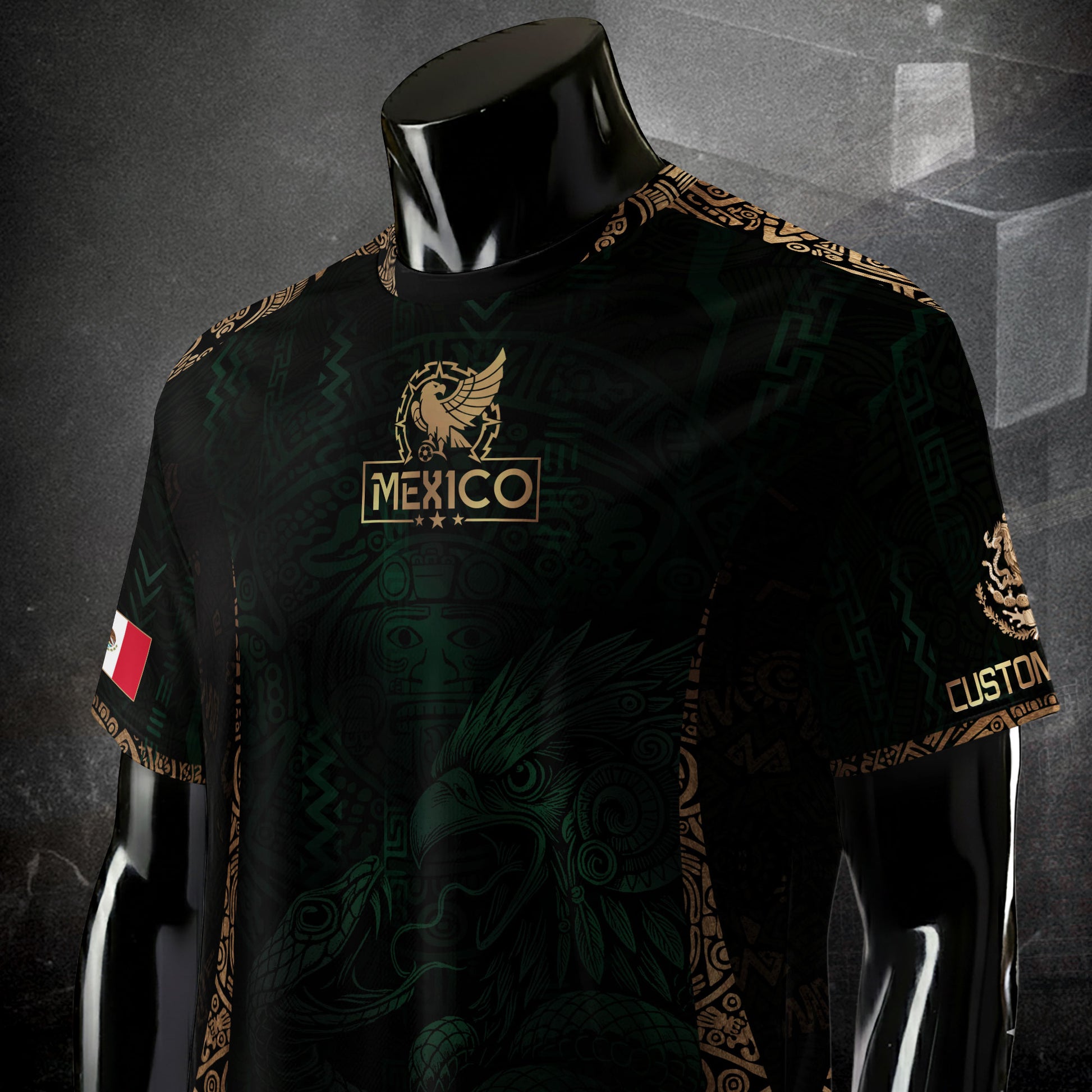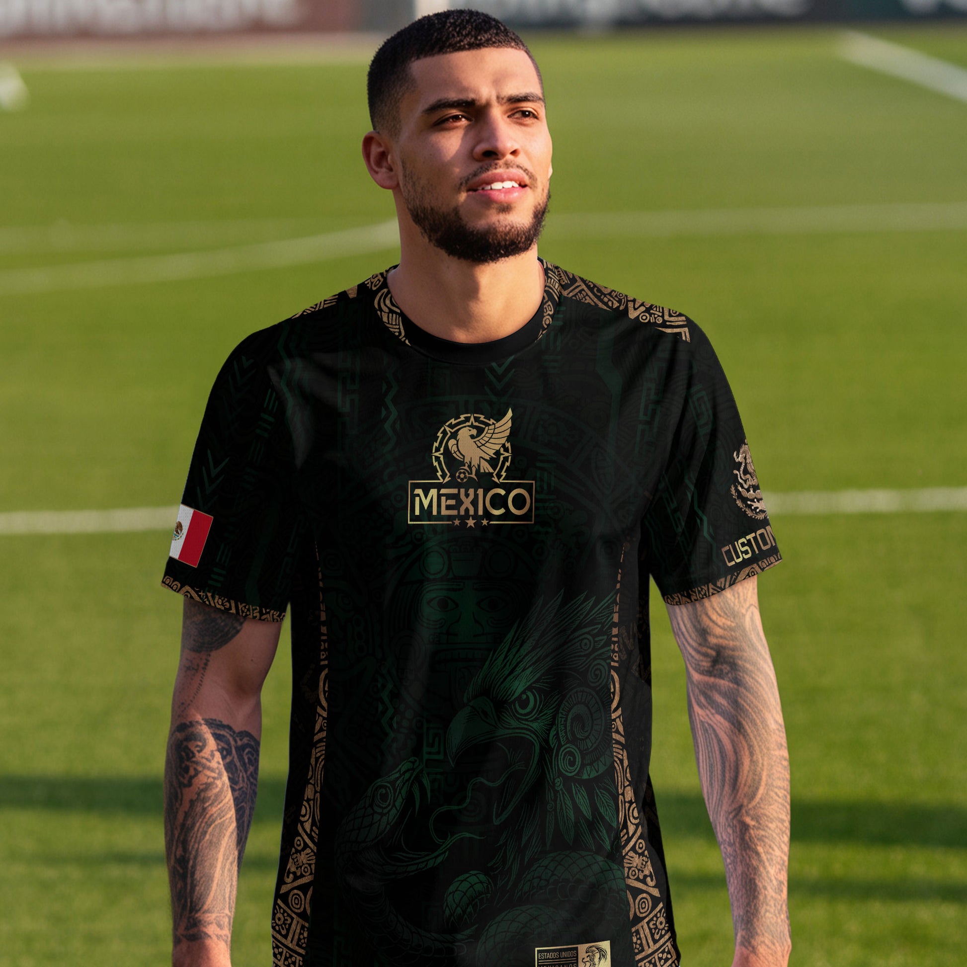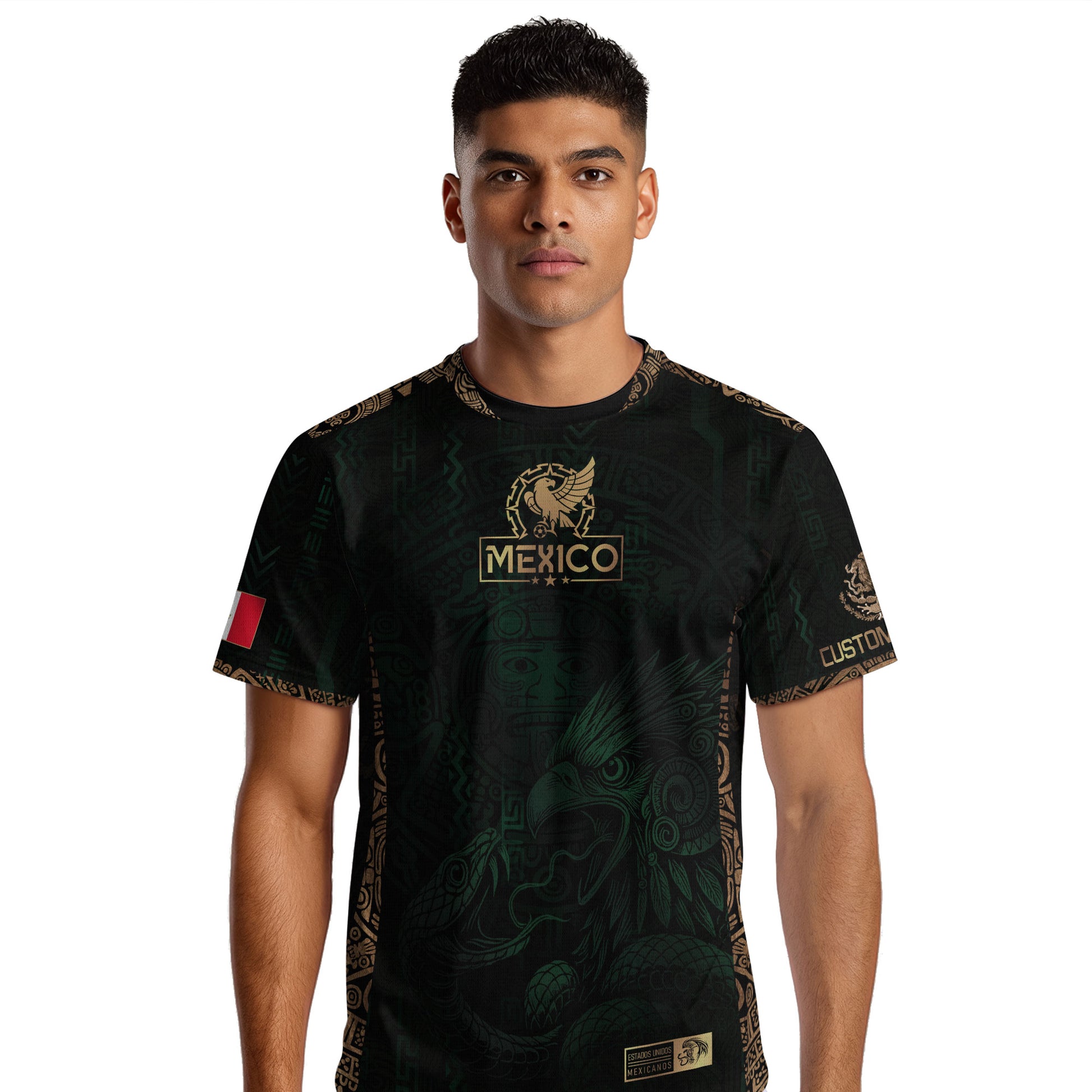Honor Mexico’s warrior spirit with this custom green and gold soccer jersey, featuring an intricate Aztec eagle design that symbolizes courage and heritage.