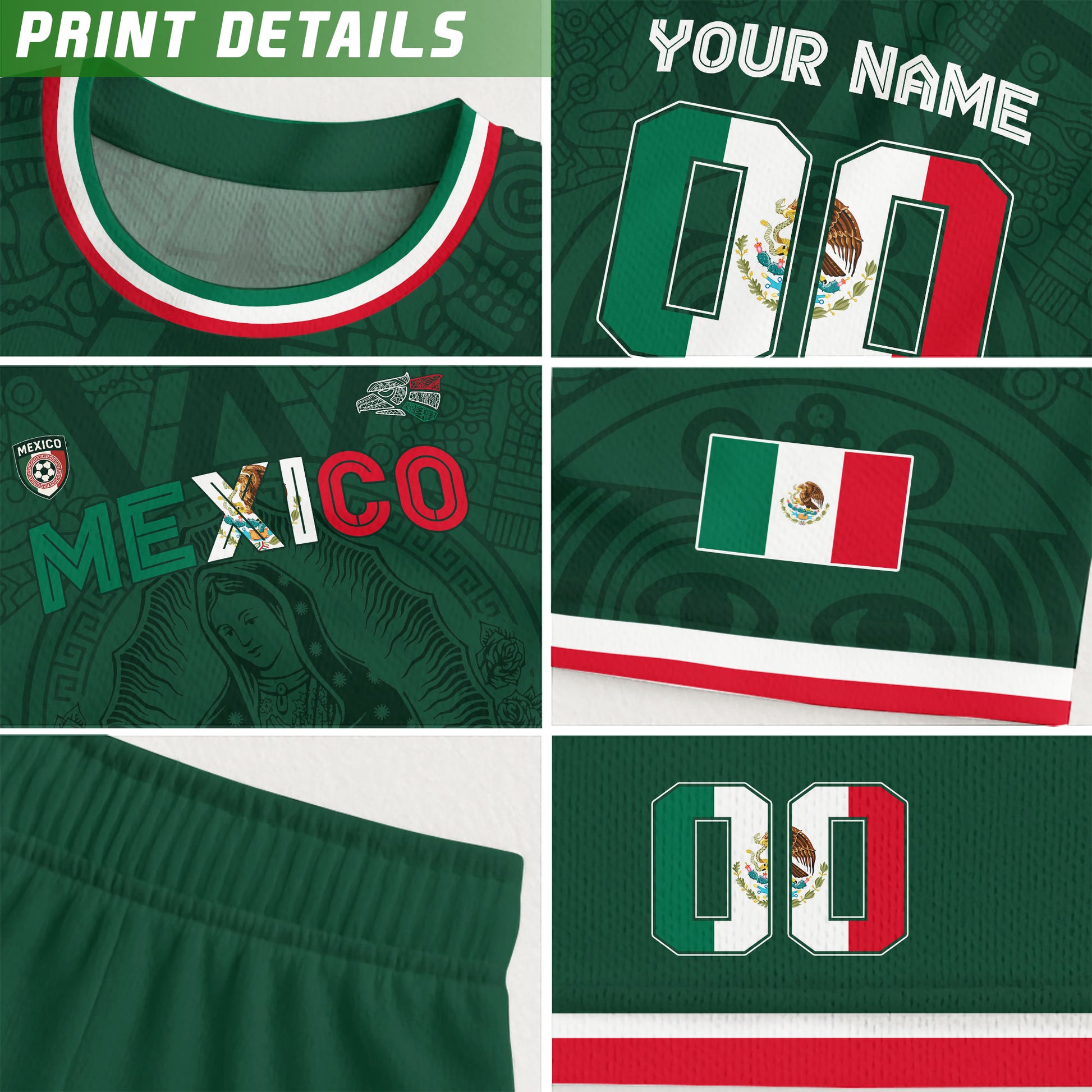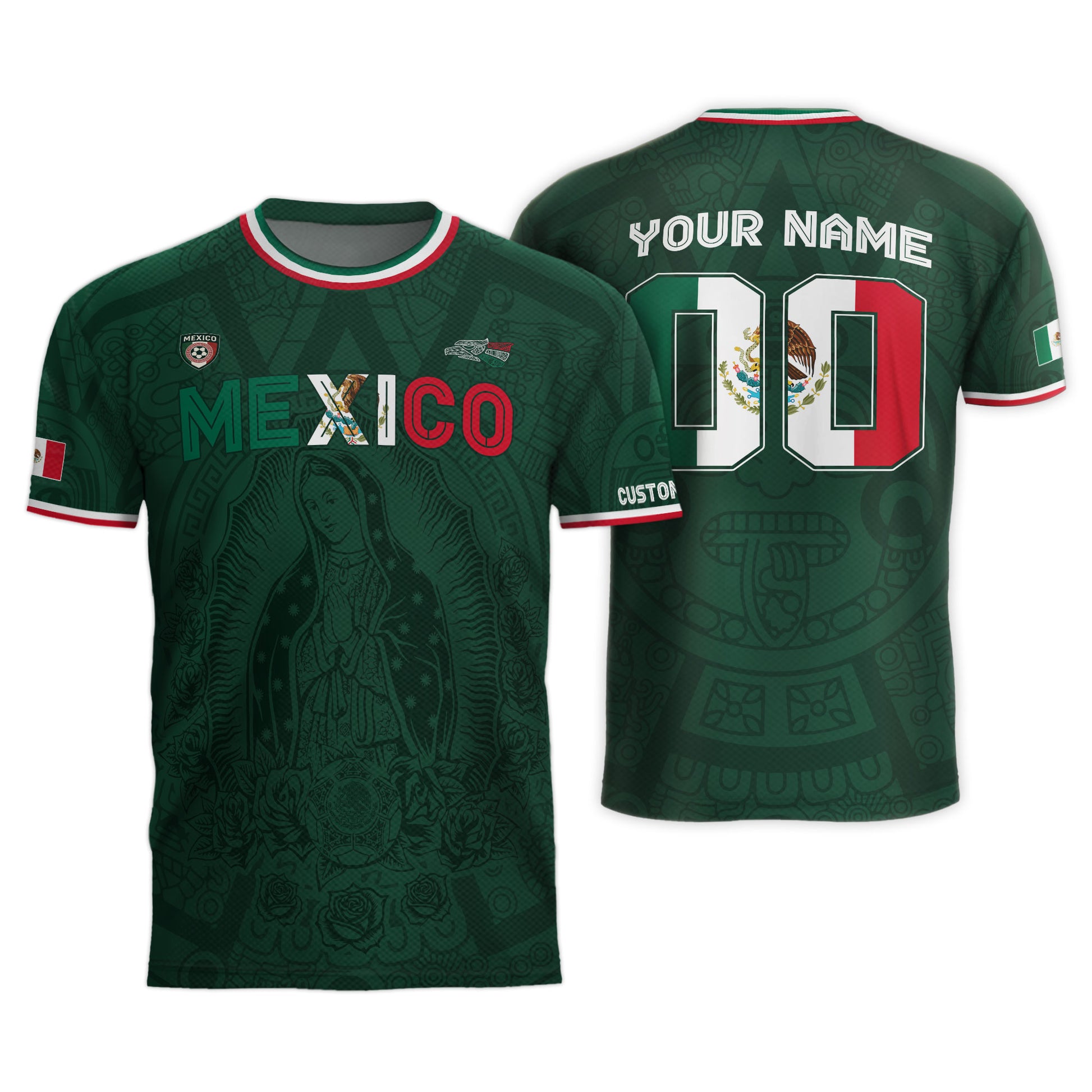 Celebrate faith and football with this Mexico green jersey featuring the Virgin of Guadalupe. Customize it with your name and number for a truly personal expression of pride and devotion.