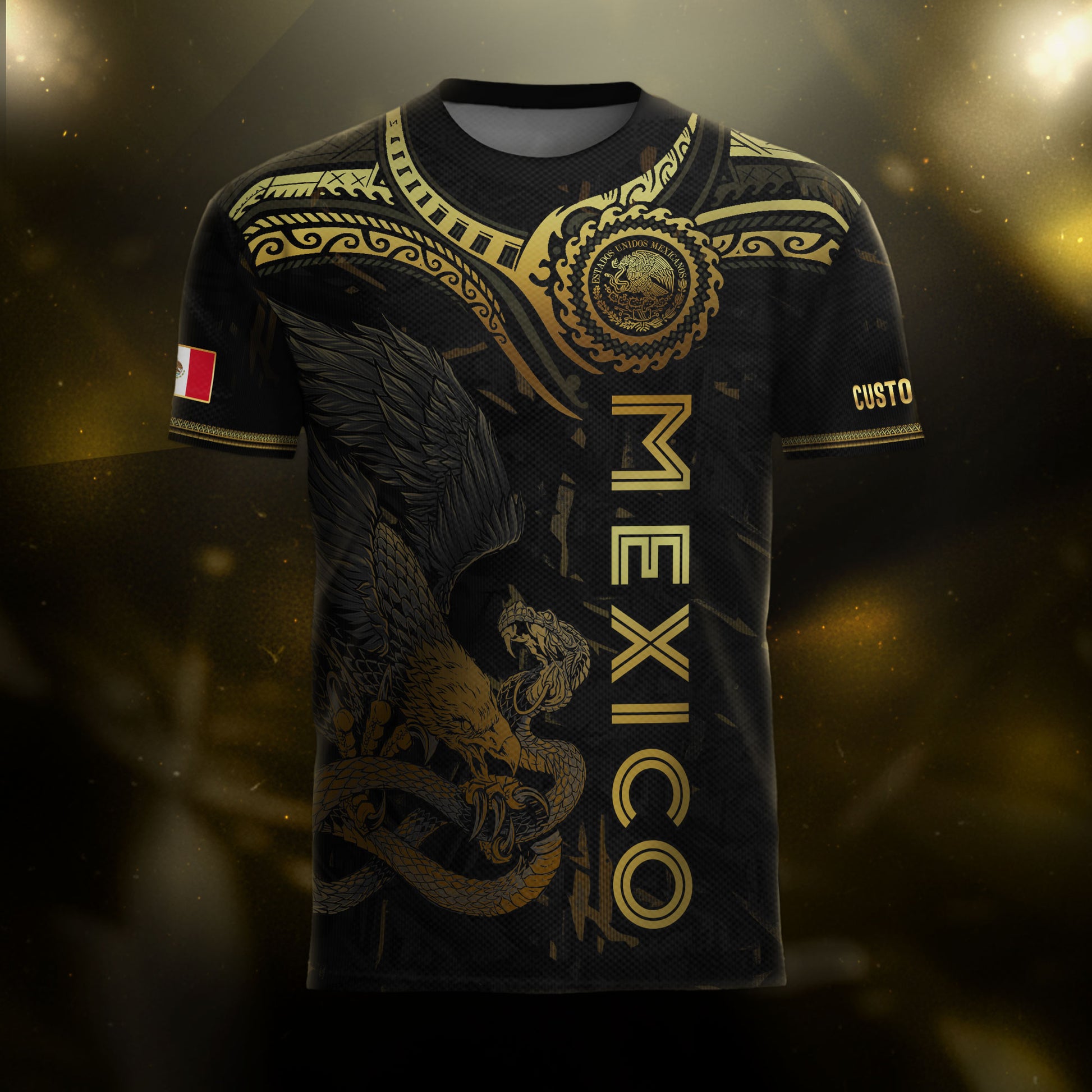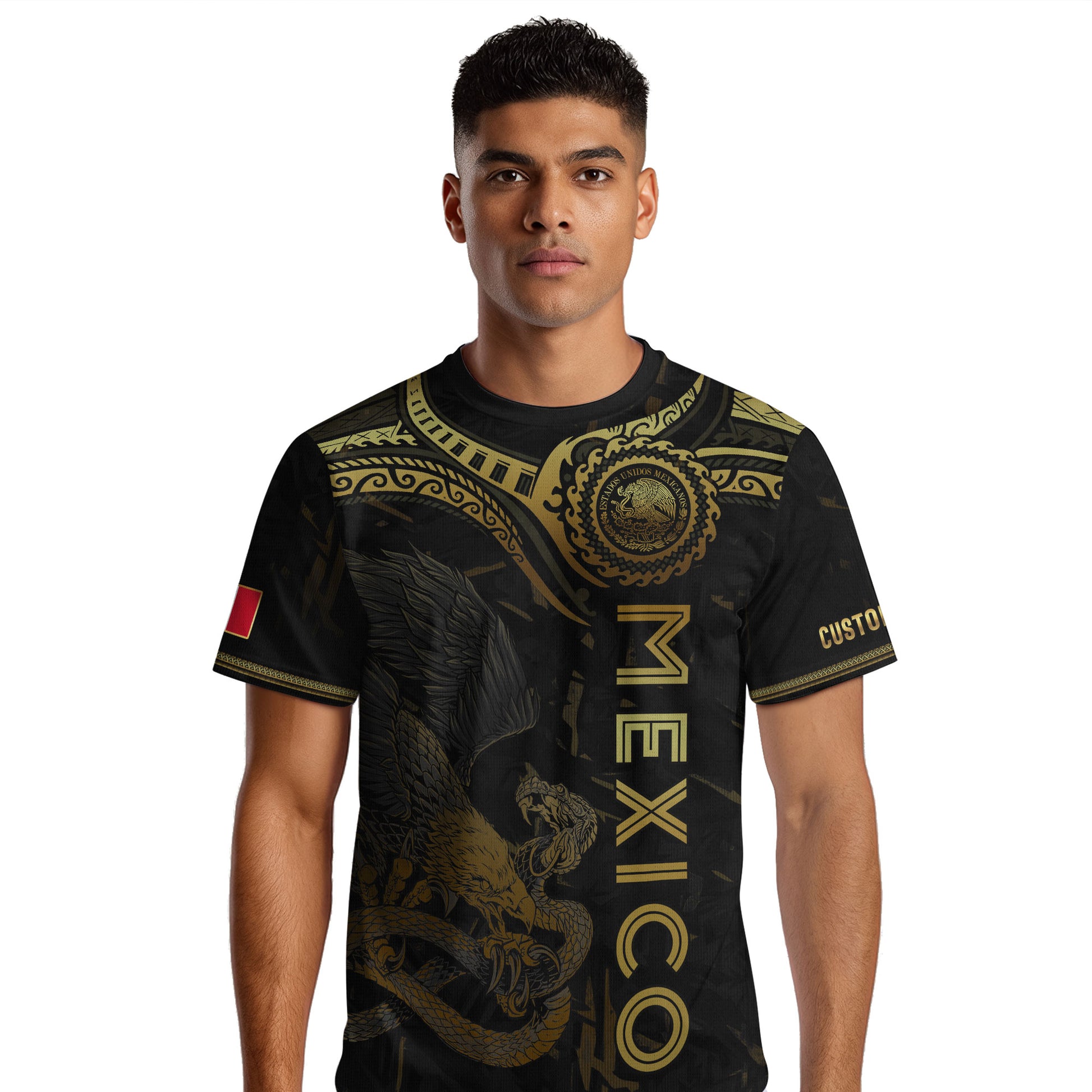 Personalized Mexico jersey in black and gold featuring eagle, serpent, and Aztec symbols. Add your name and number for a bold warrior look.