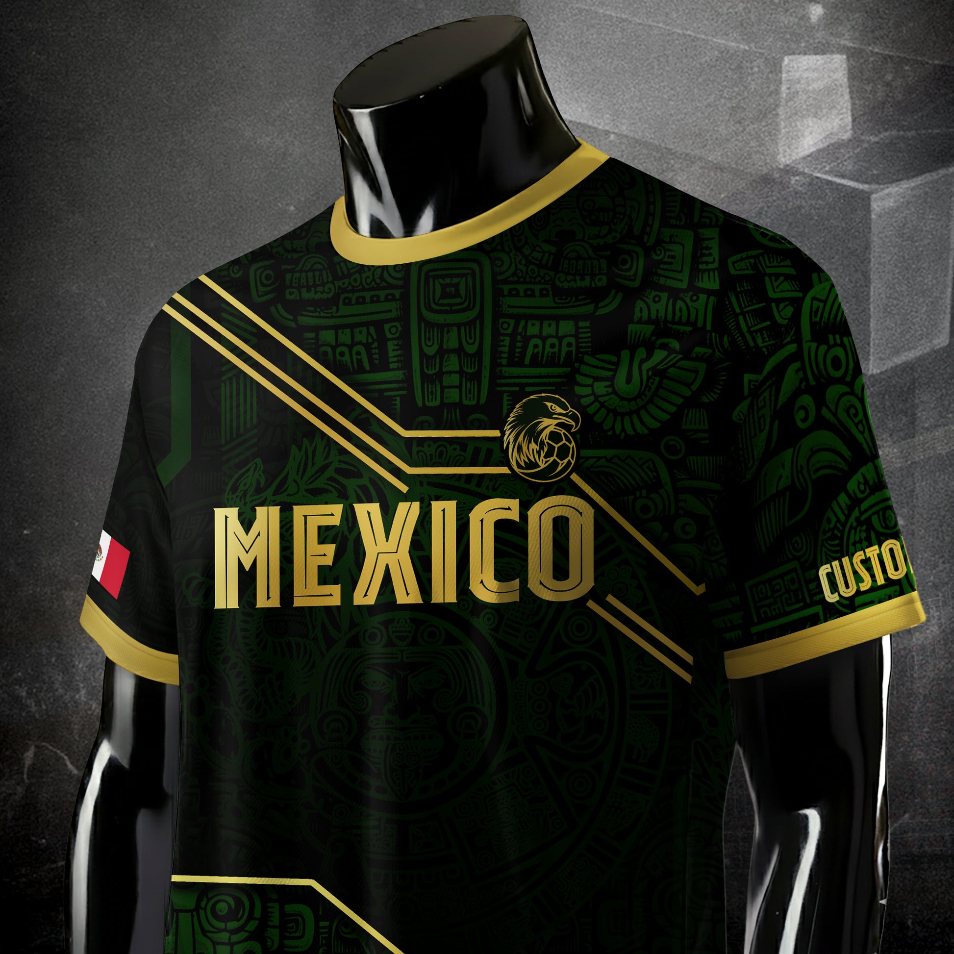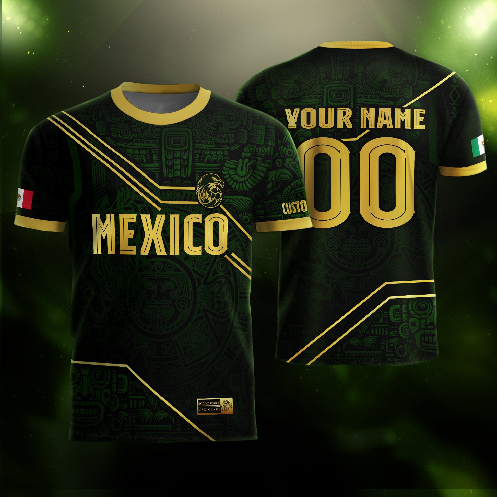 Personalized Mexico jersey in black green gold with Aztec patterns and national eagle emblem. Add your name and number for a unique cultural look.