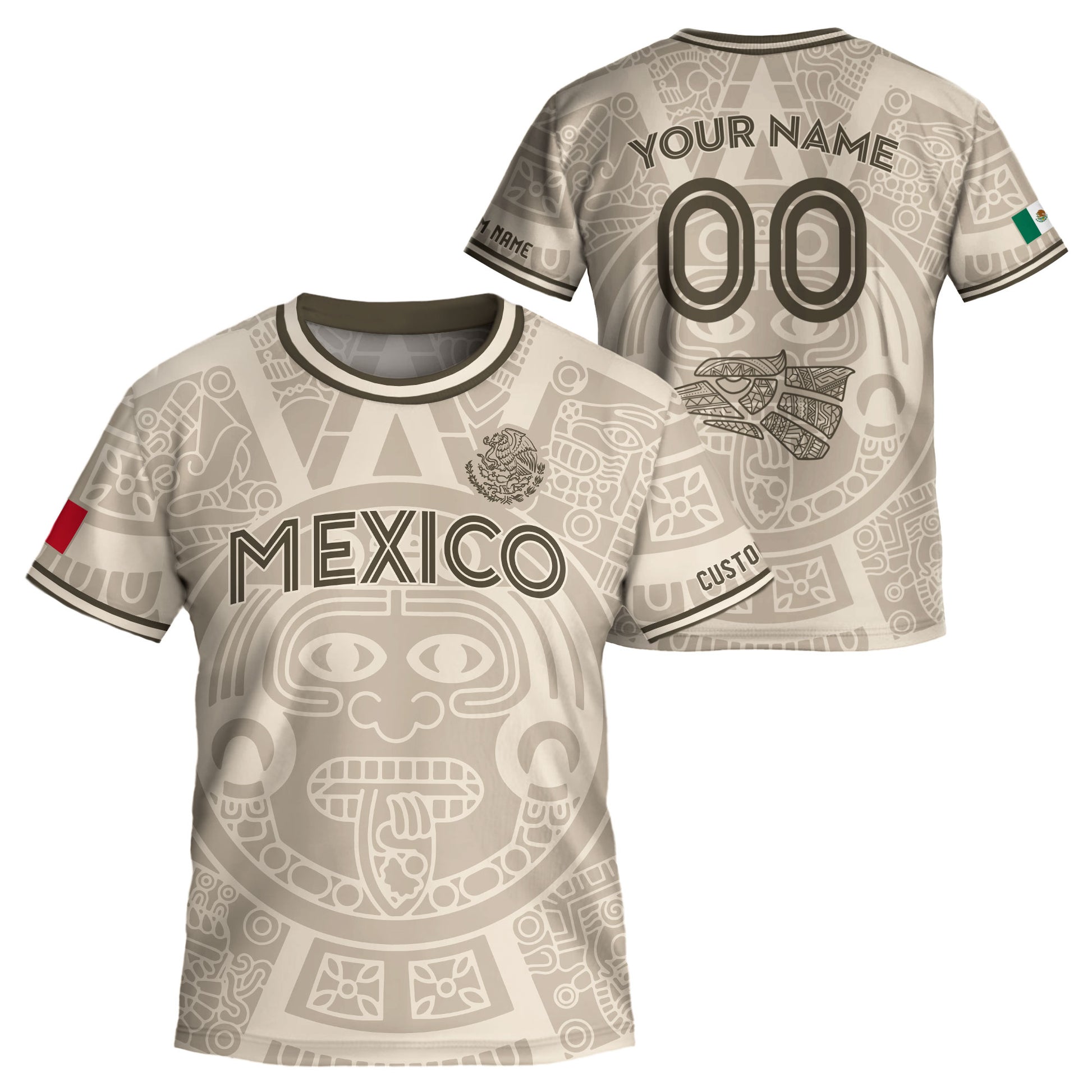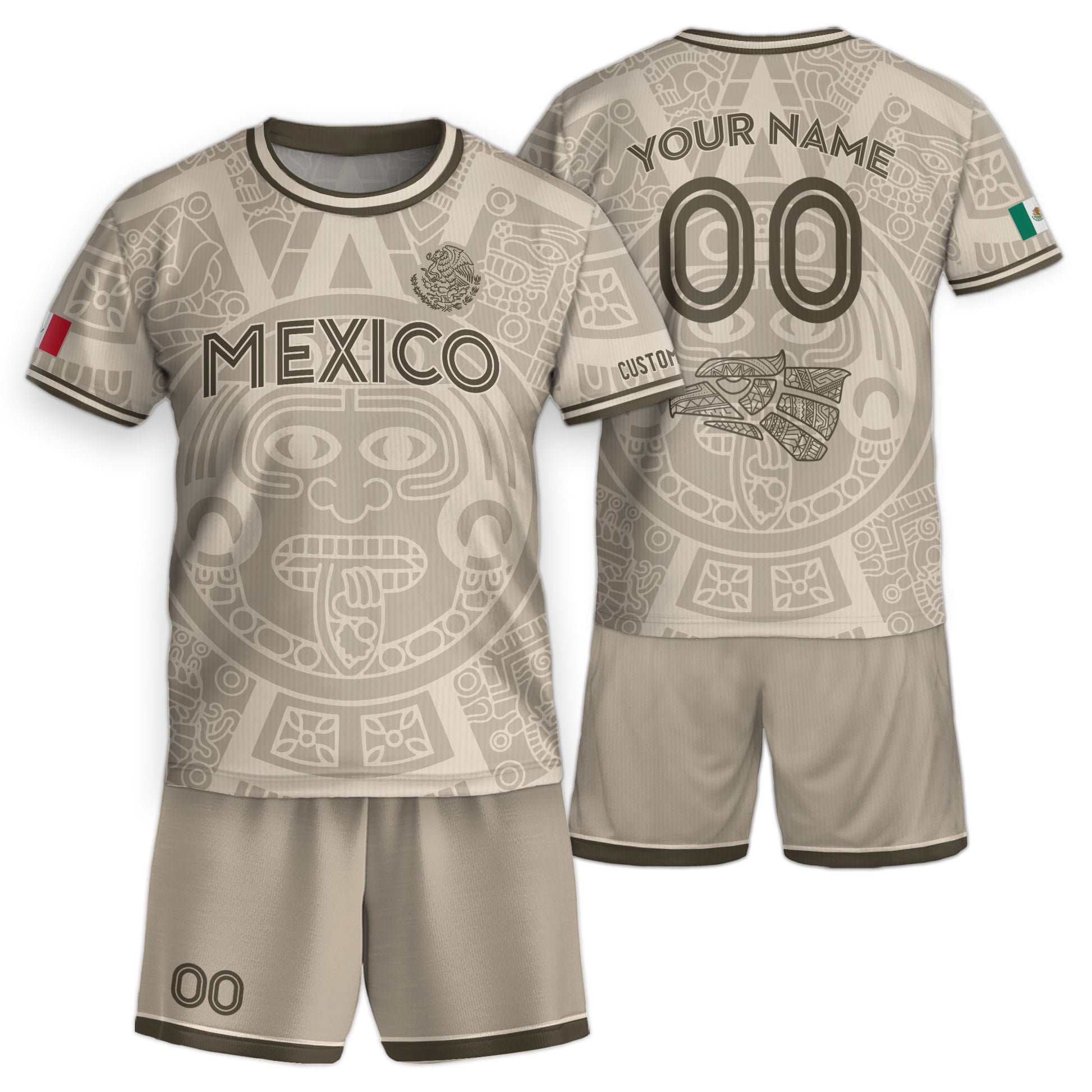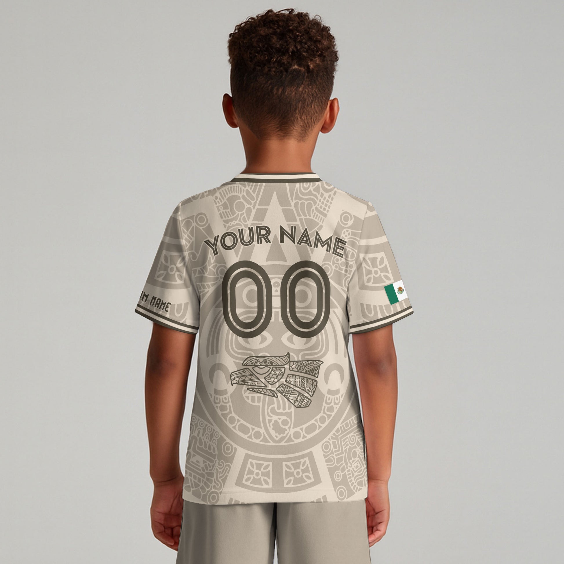 Design your Custom Mexico Kids Soccer Jersey in light beige with Aztec Calendar artwork. Add your child’s name & number and celebrate rich Mexican heritage.