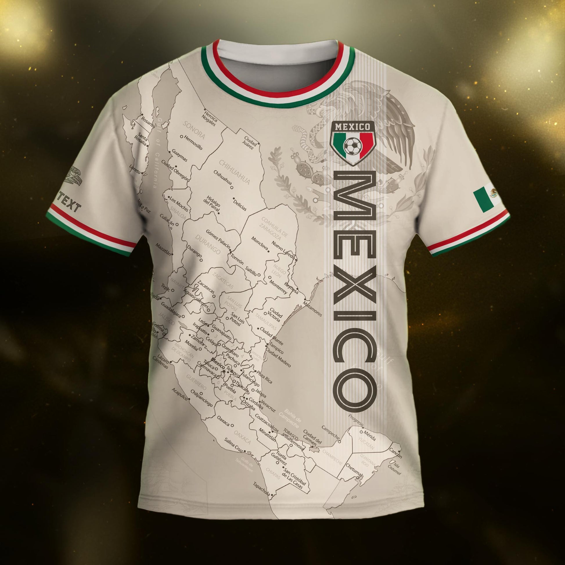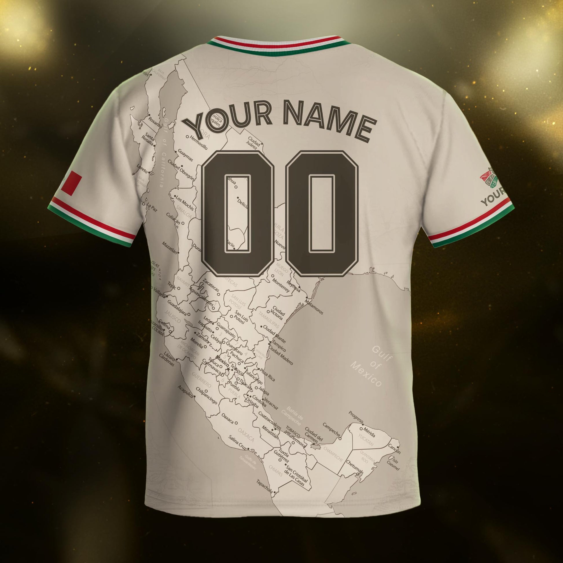 Custom Mexico Kids Soccer Jersey in beige heritage map design. Add kid name and number. Celebrate Mexican roots and national pride in style.