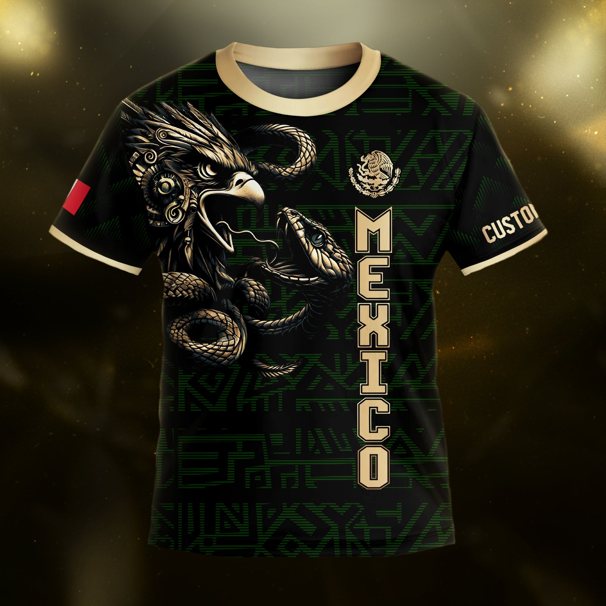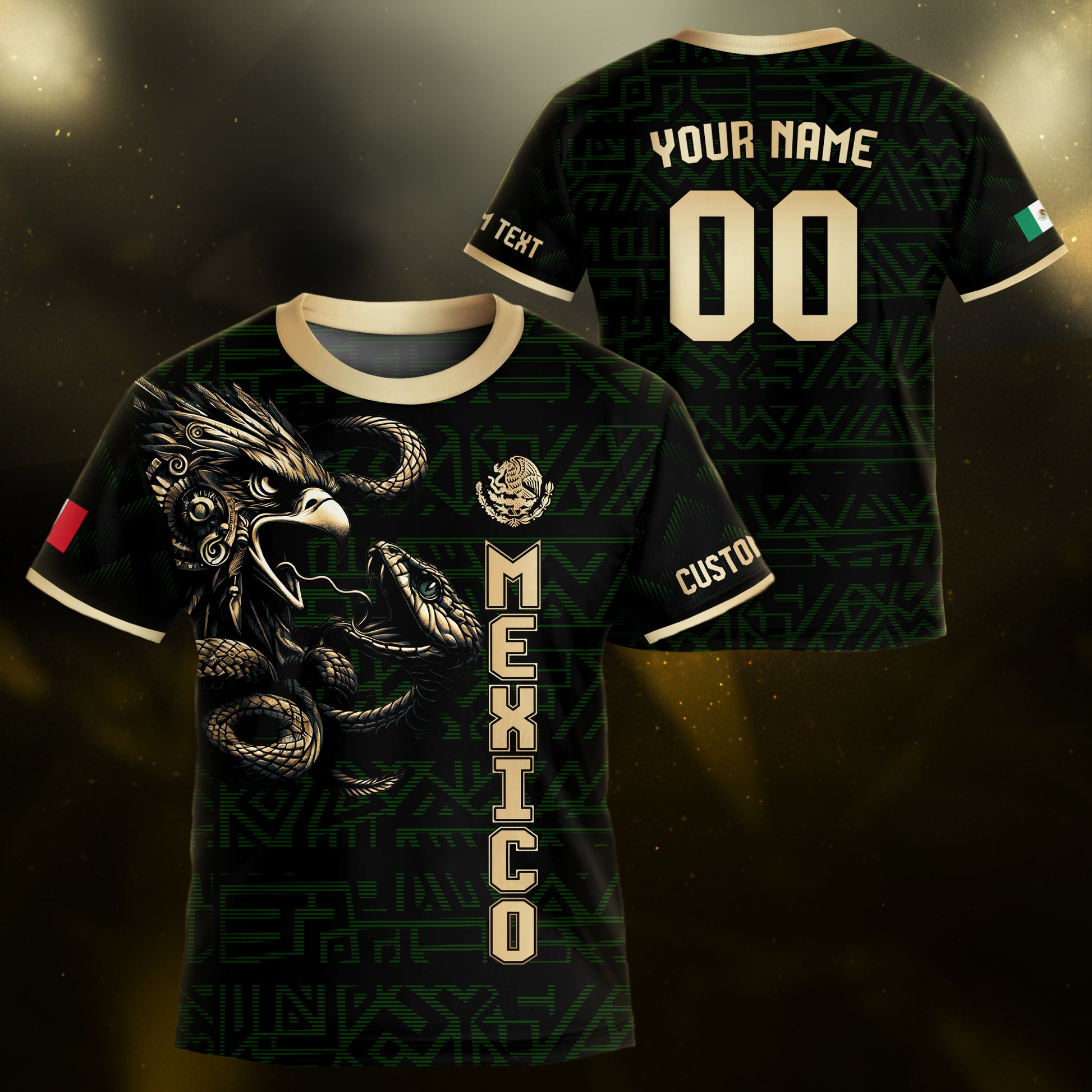 Create your own Custom Mexico Kids Soccer Jersey featuring a stunning Aztec Eagle & Serpent design in black and gold. Add your kid’s name and number today!