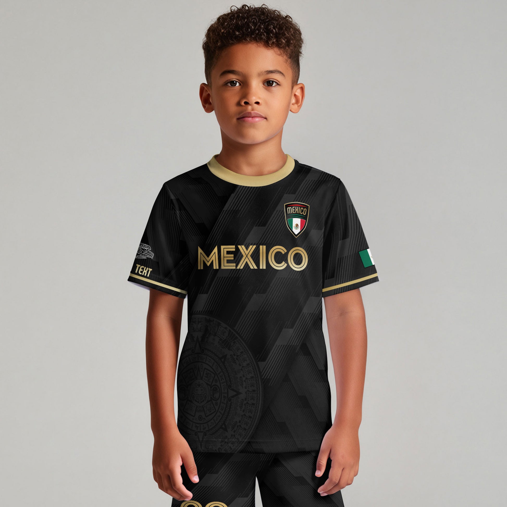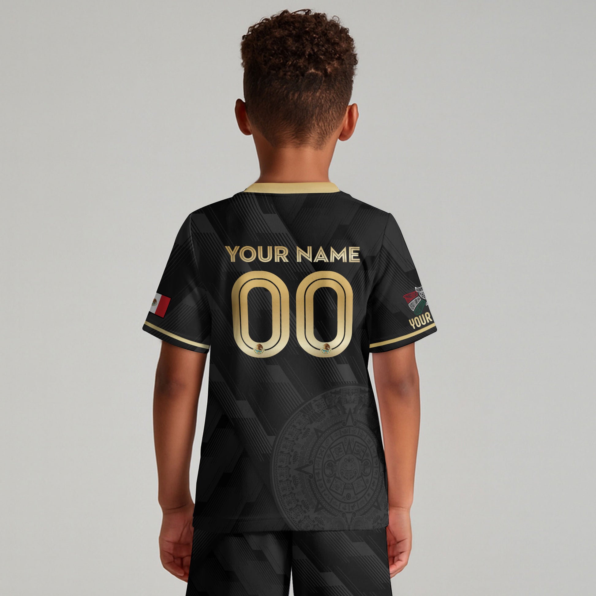 Custom Mexico Kids Soccer Jersey in black gold classic design. Add kid name and number. Perfect for young fans of Mexican football culture.