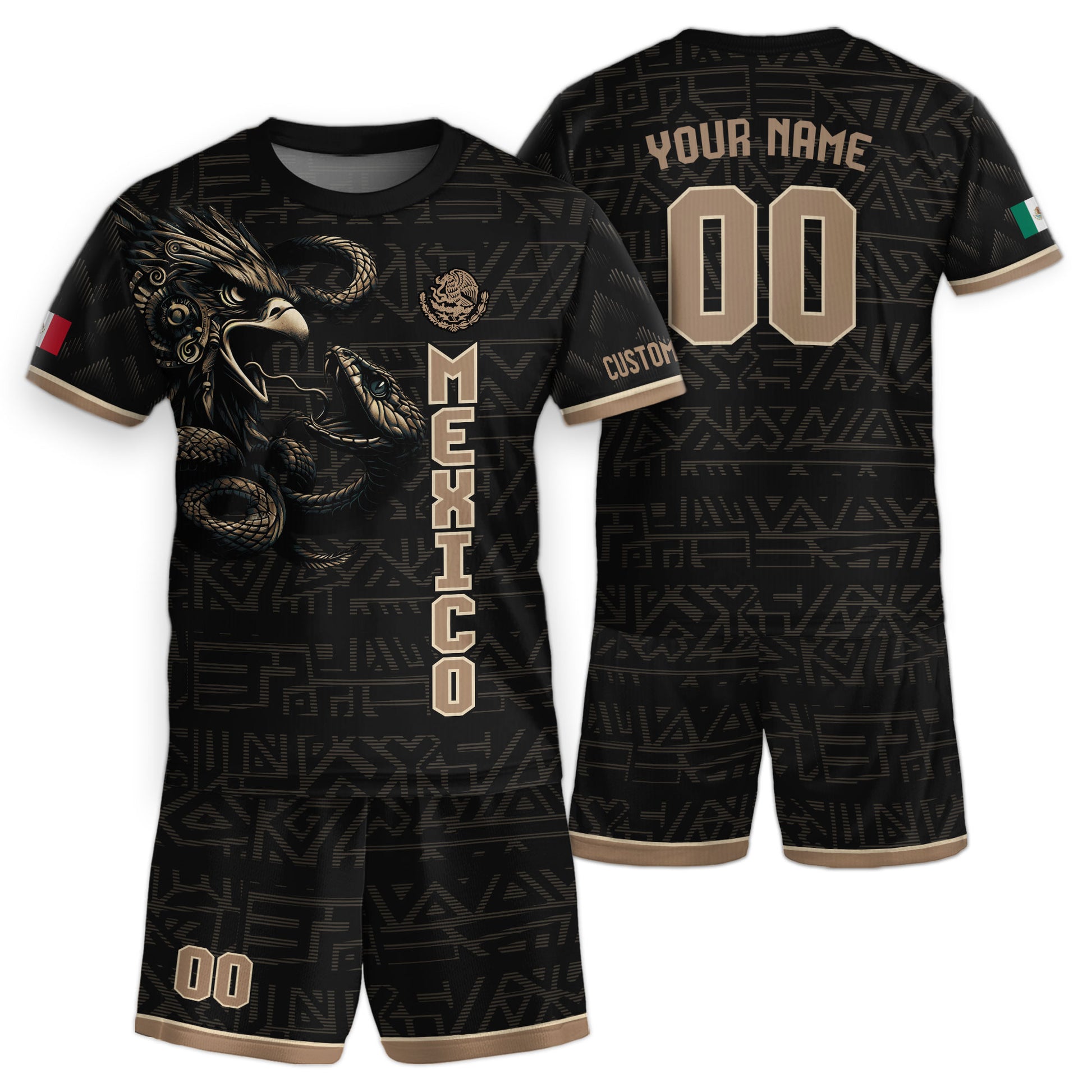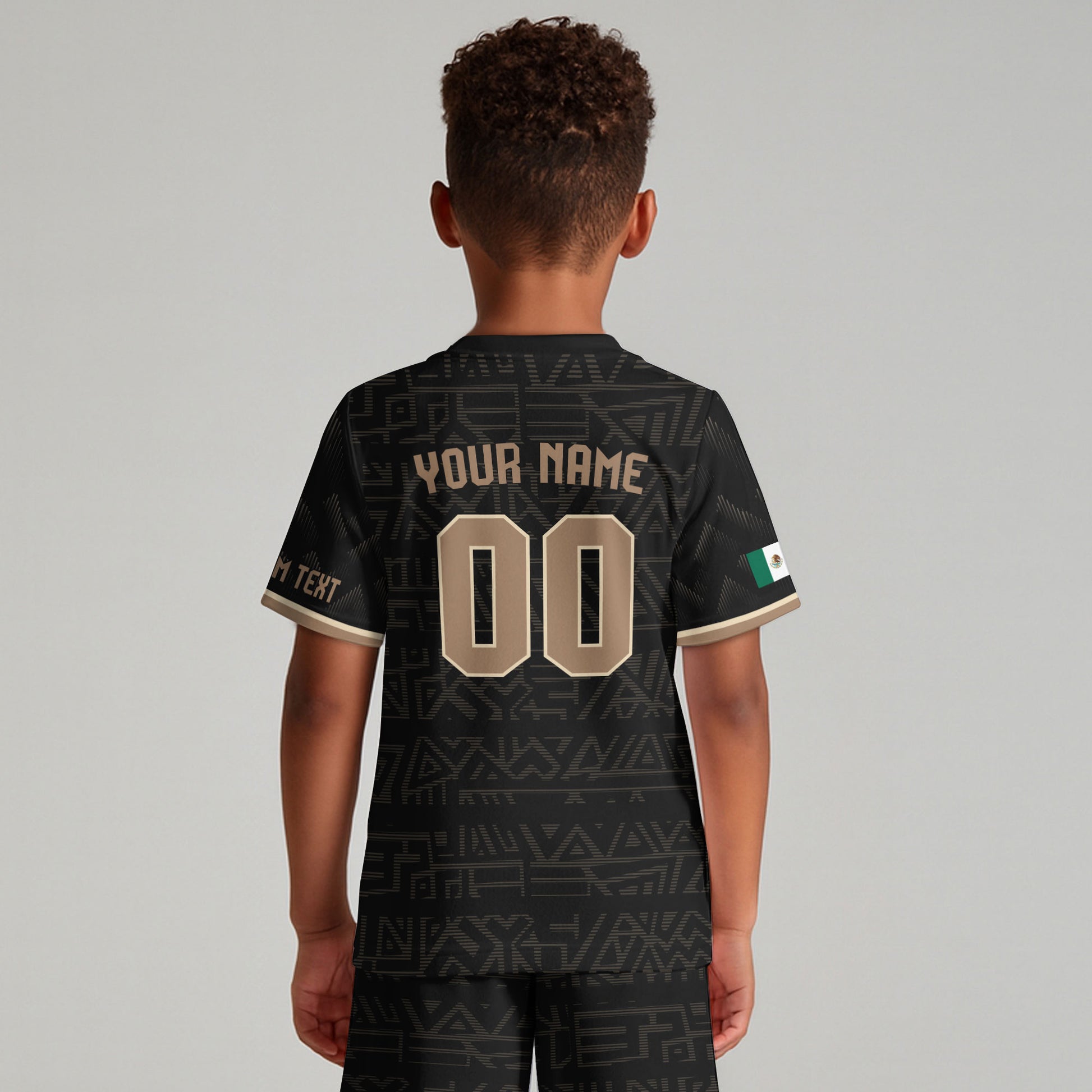 Mexico kids soccer jersey and shorts in black, detailed with Aztec-inspired graphics, tricolor Mexico lettering, and customizable name and number.