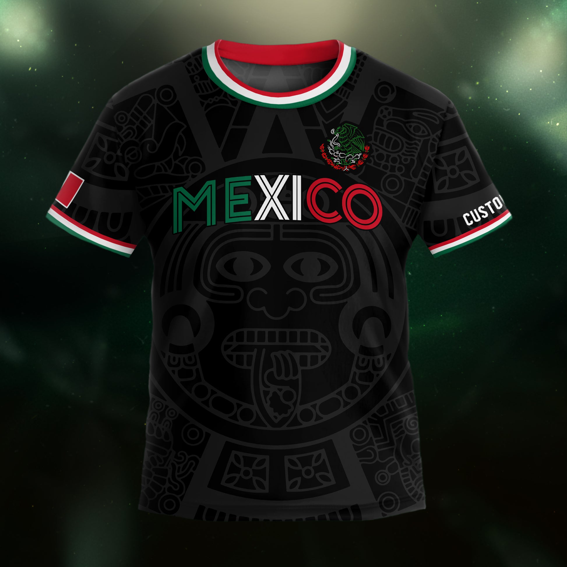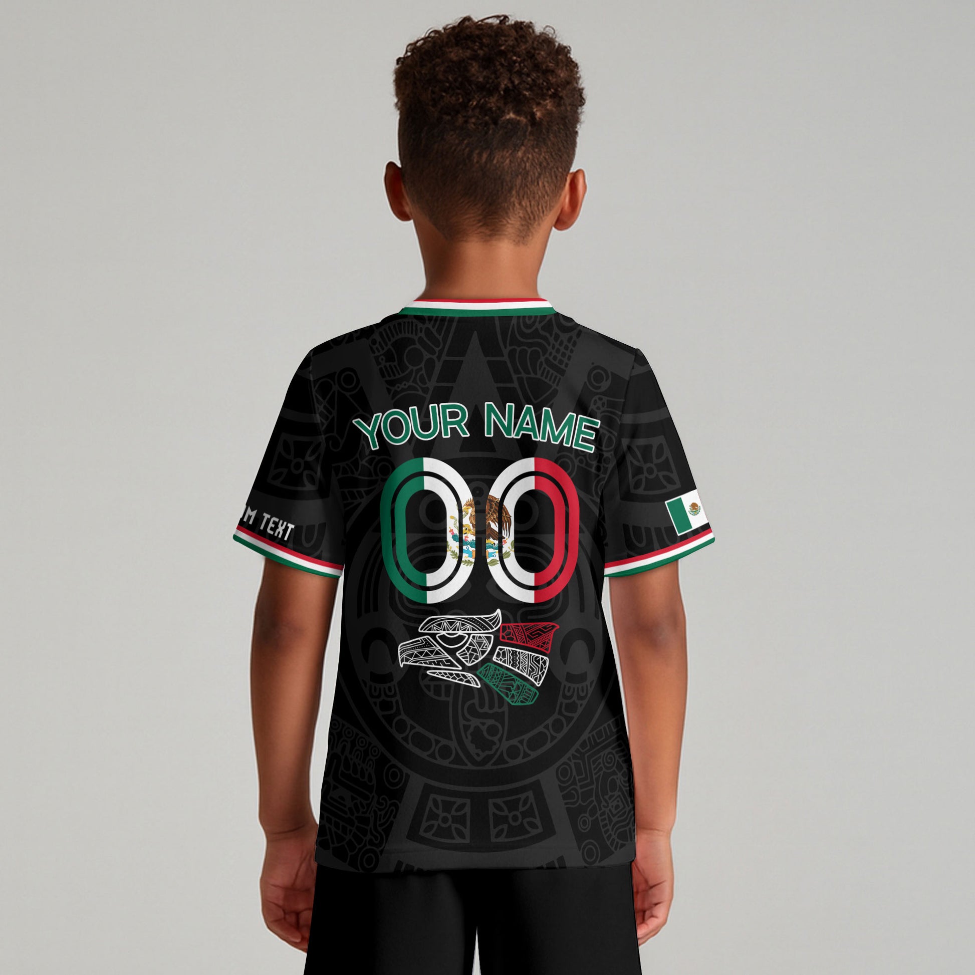 Mexico kids soccer jersey and shorts in black with Aztec-inspired motifs, tricolor Mexico lettering, and customizable name and number.