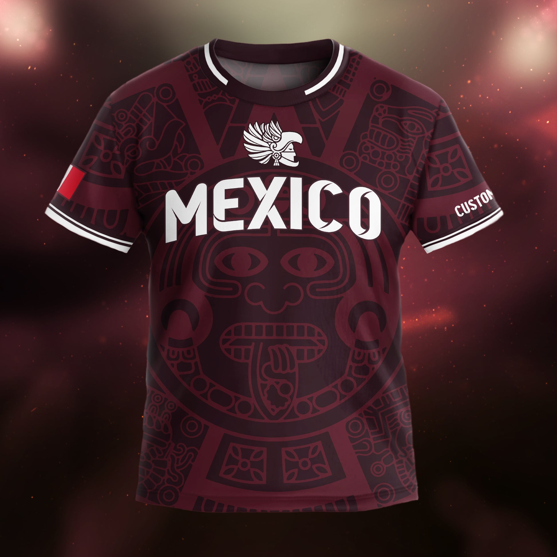 Custom Mexico Kids Soccer Jersey in burgundy heritage flag aztec pattern design. Add kid name and number. Celebrate Mexican roots and cultural pride.