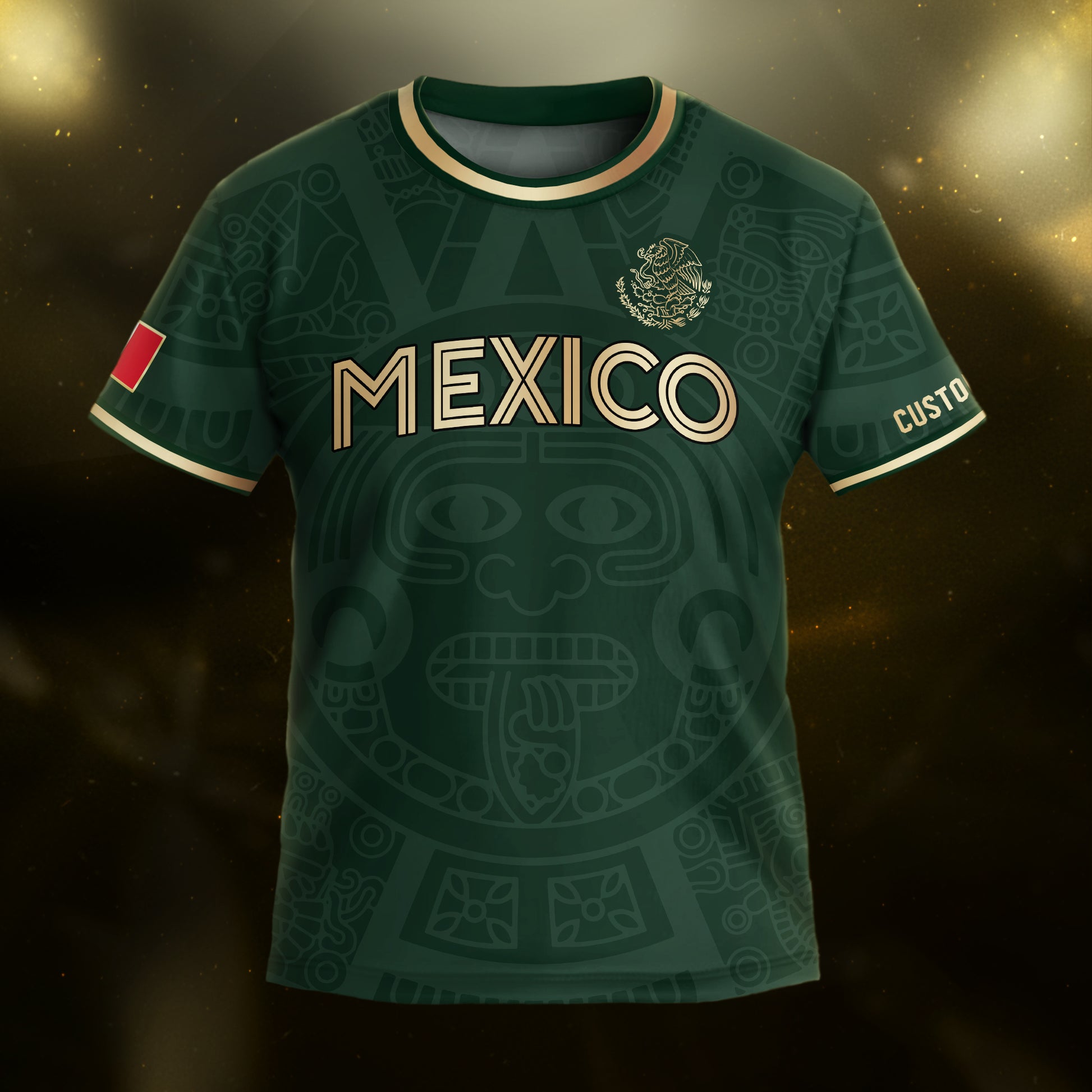 Design your Custom Mexico Kids Soccer Jersey in dark green with golden Aztec Calendar details. Add your kid’s name & number for a personalized heritage look.