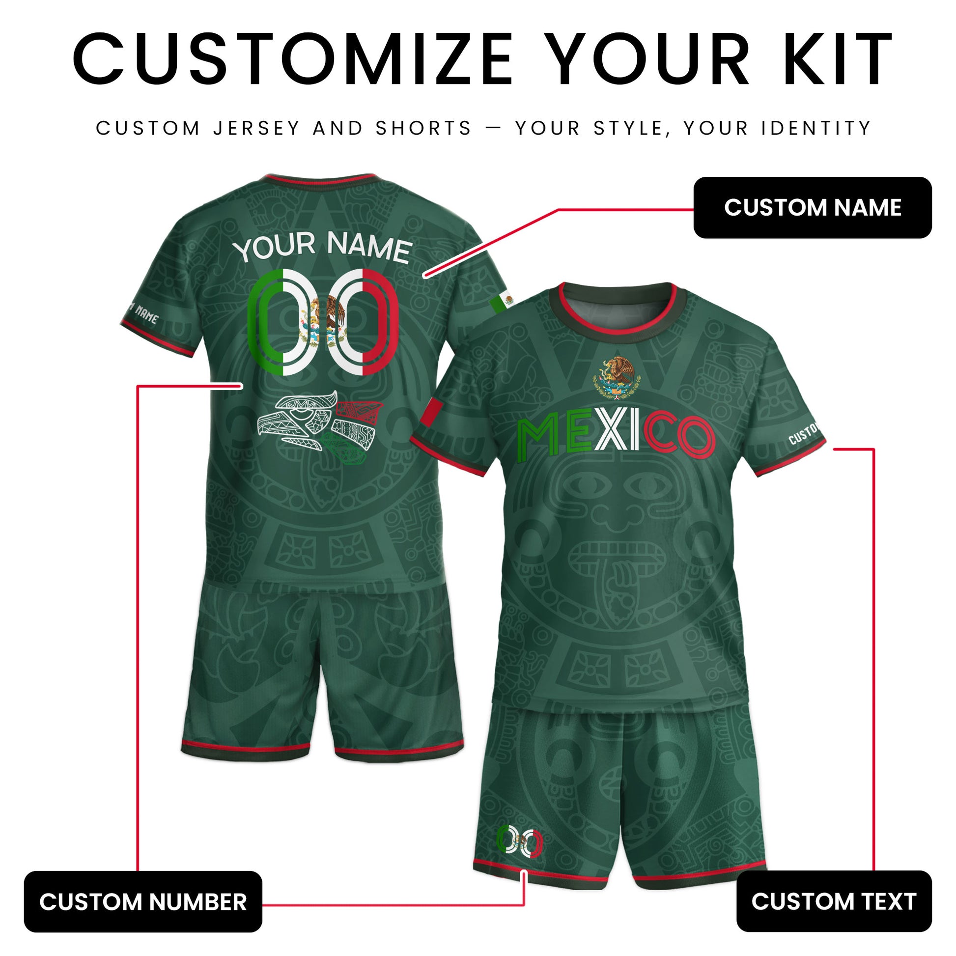 Custom Mexico Kids Soccer Jersey in green heritage flag aztec pattern design. Add kid name and number. Celebrate Mexican culture and national pride.