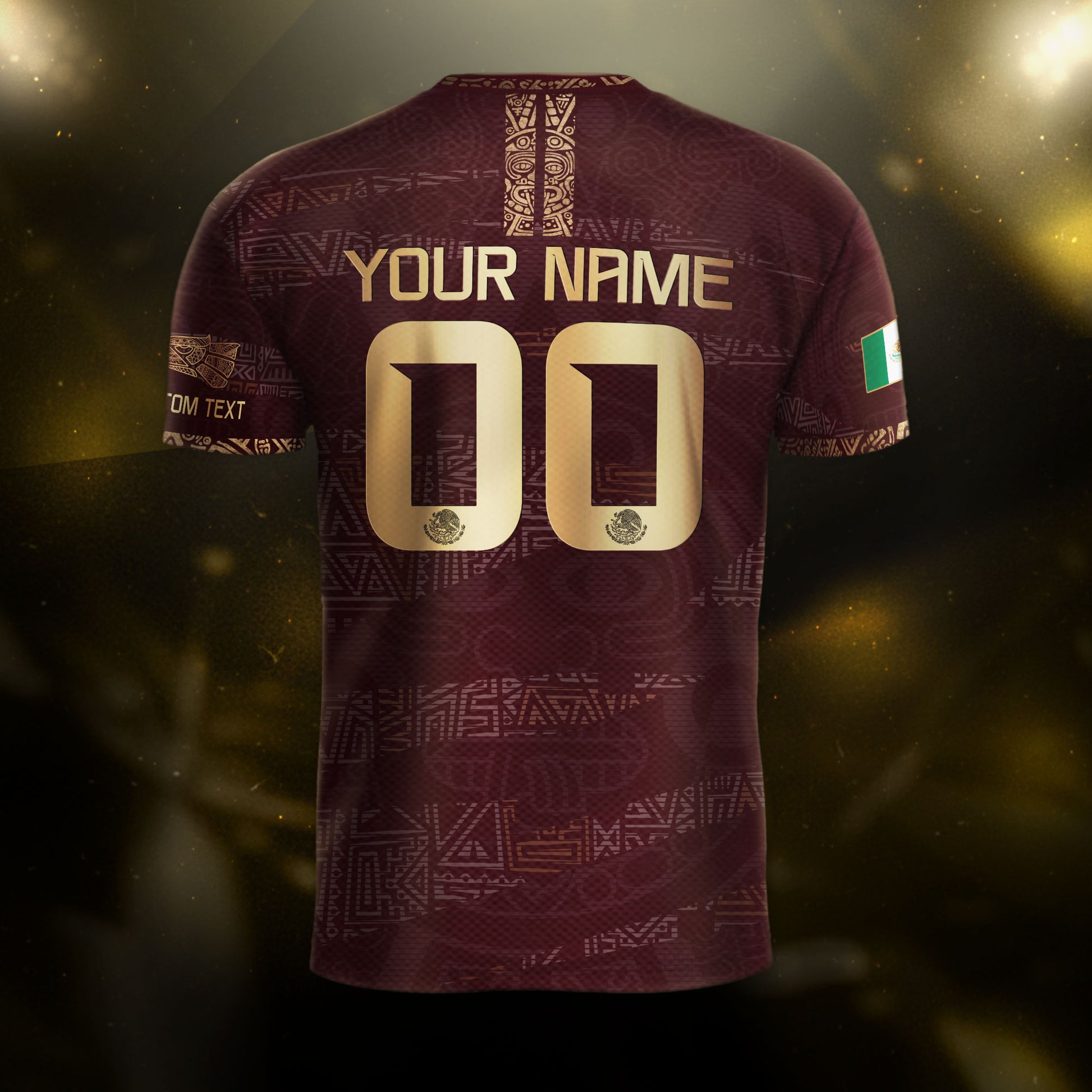 Stand out in deep maroon and gold — a custom soccer jersey inspired by Mexico’s Aztec legacy and national pride.