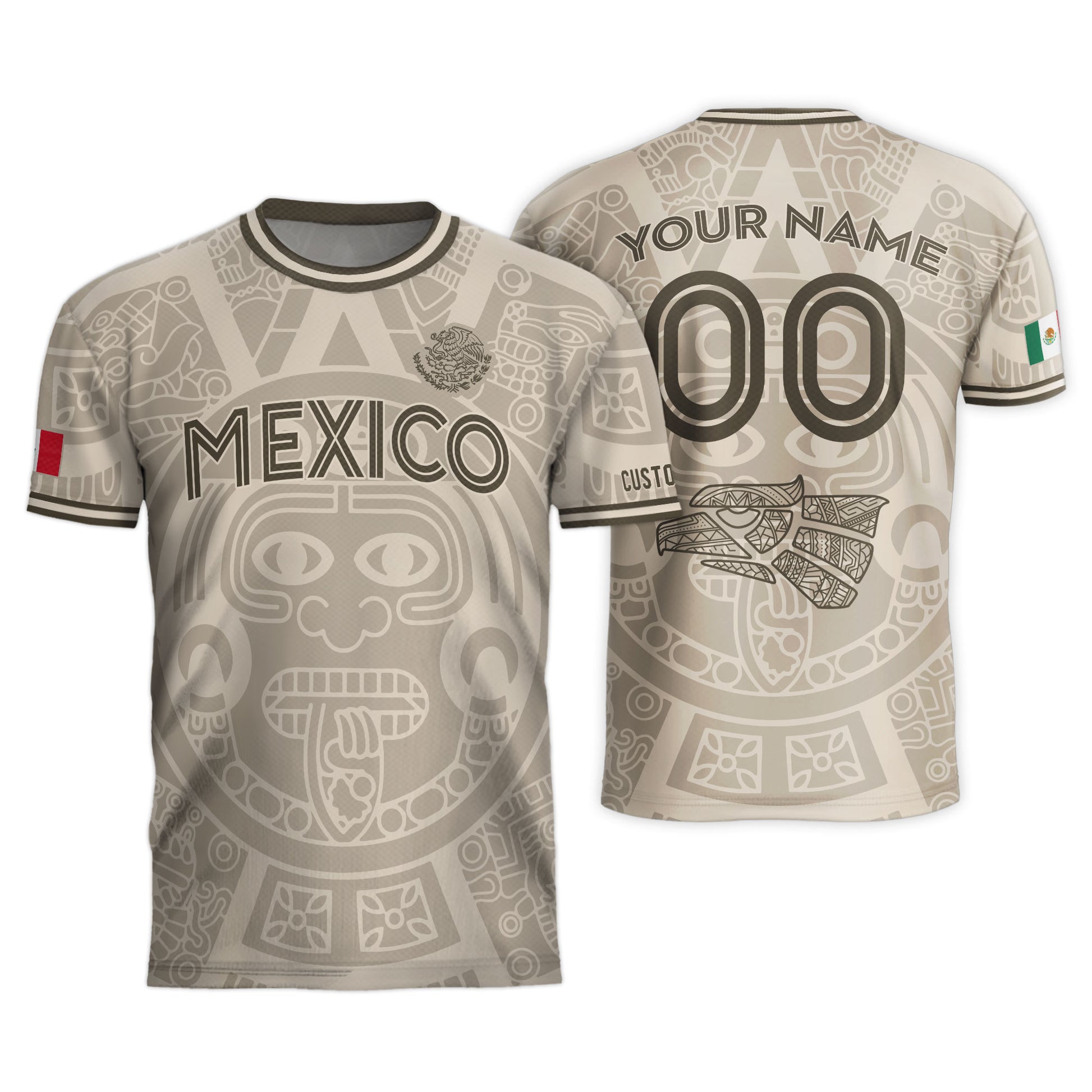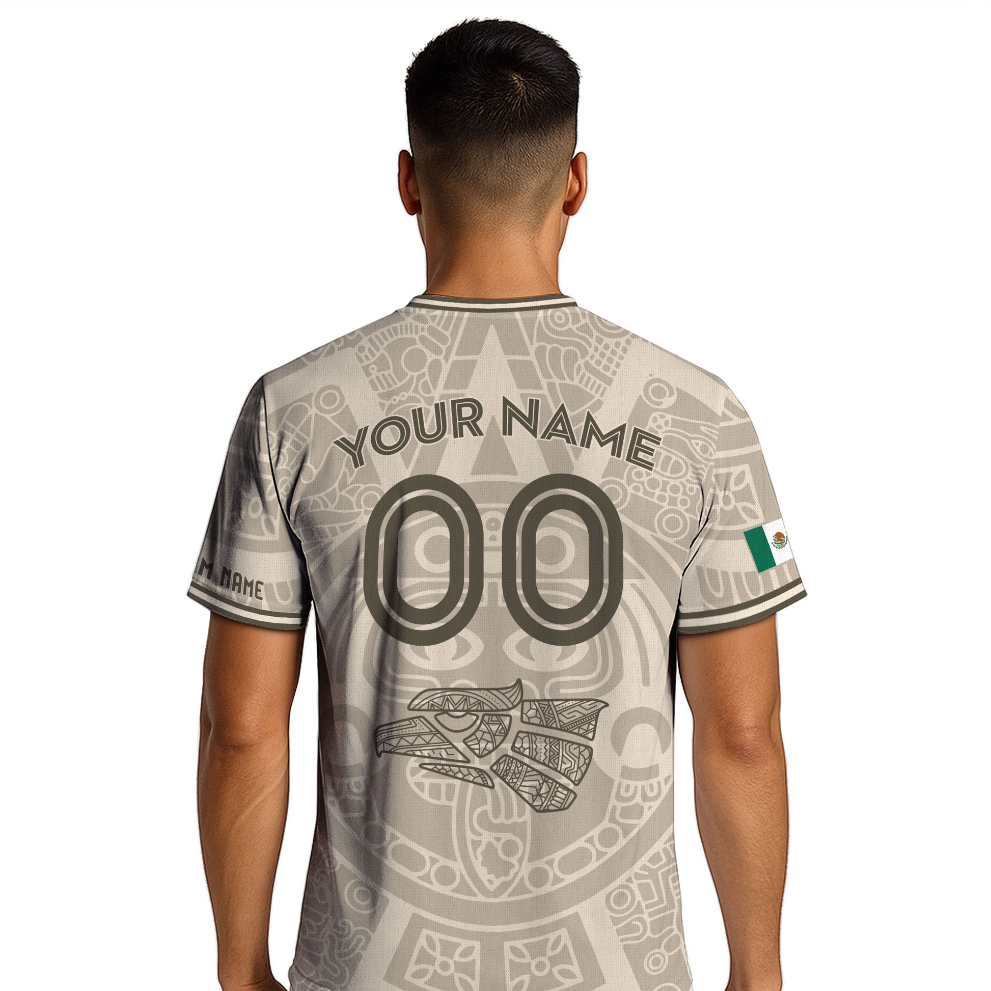 Custom Mexico Soccer Jersey in beige brown Aztec calendar design. Personalize with name and number. Inspired by Mexican culture and pride.