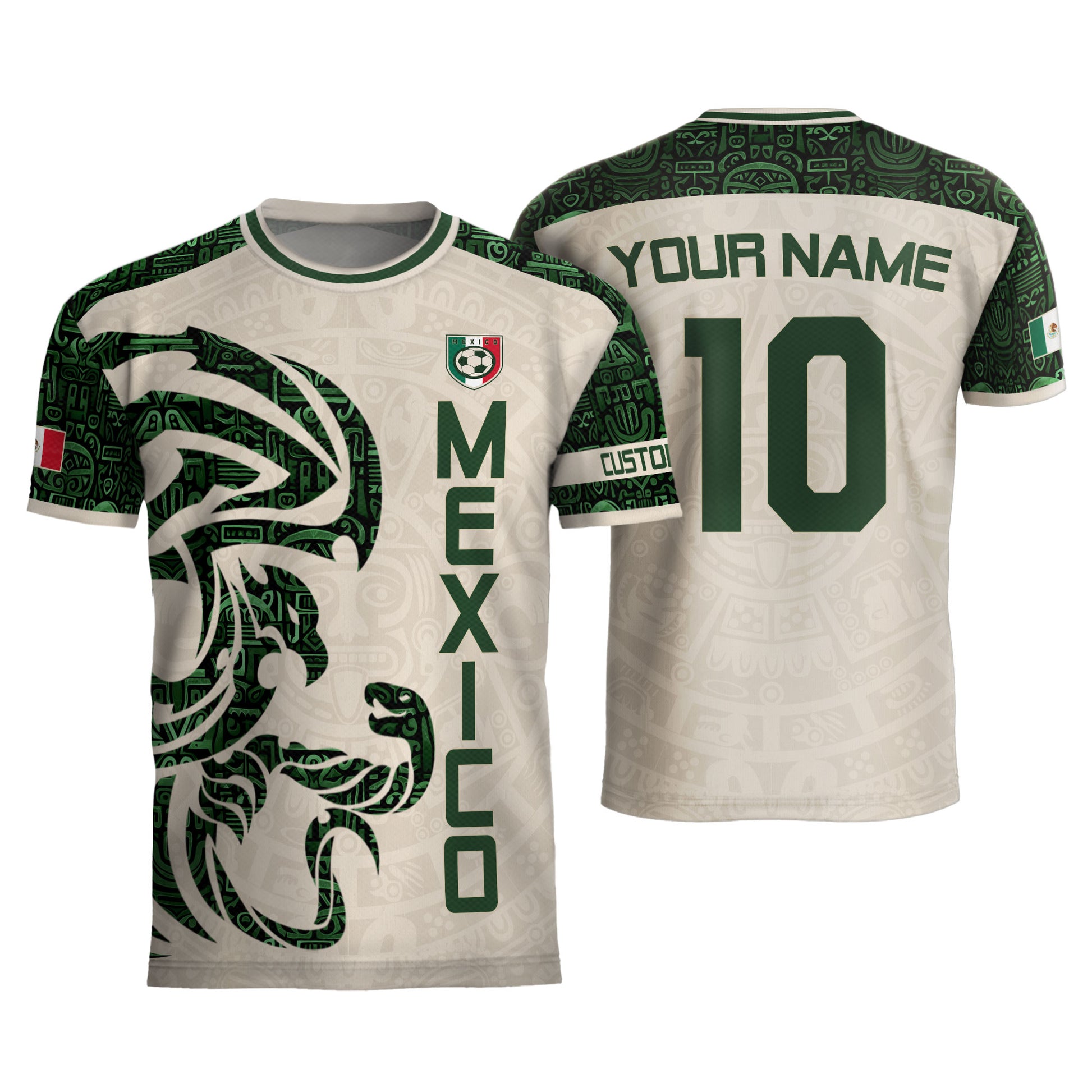 Custom Mexico soccer jersey in white and green with Aztec dragon design. Personalize with your name and number. A perfect blend of heritage and style.