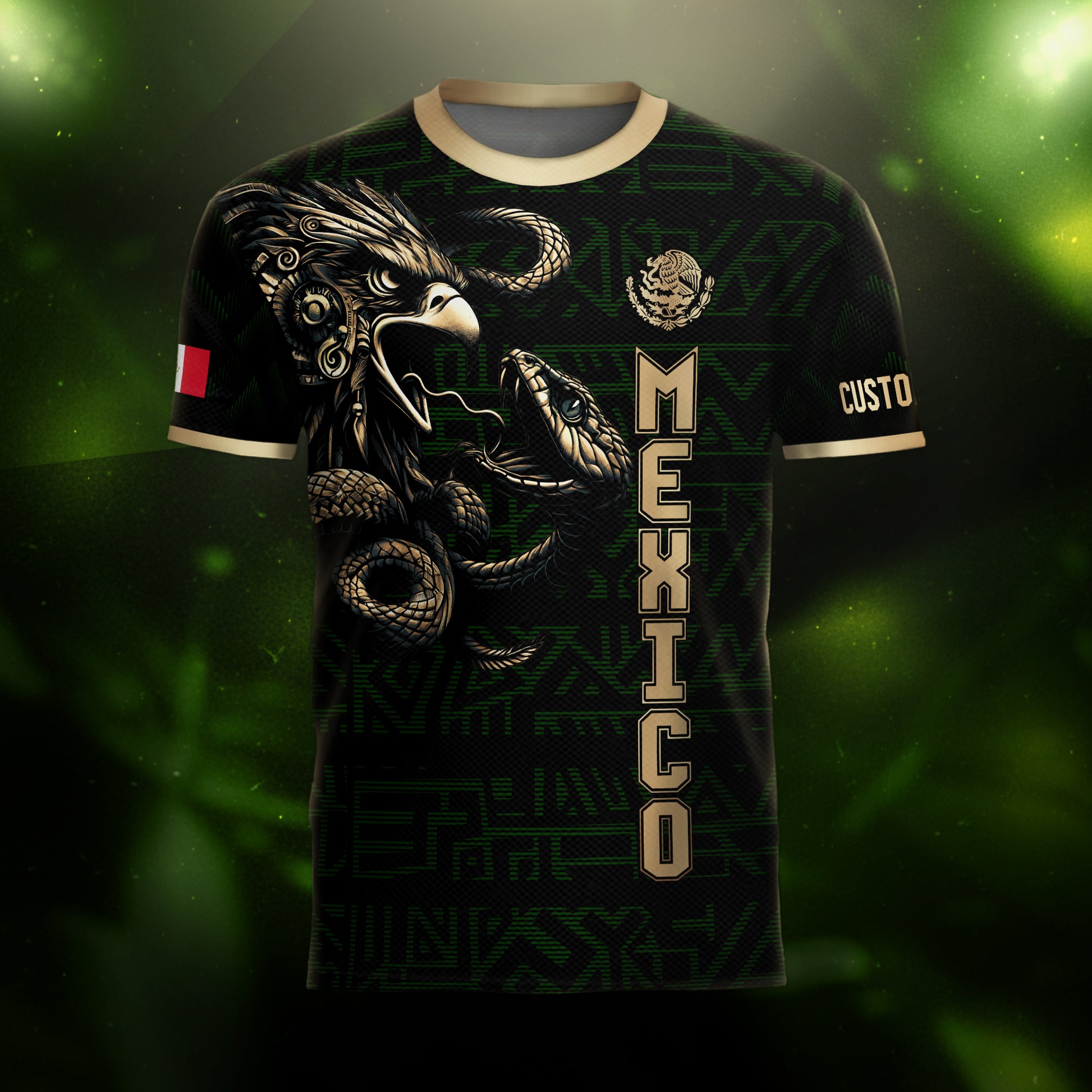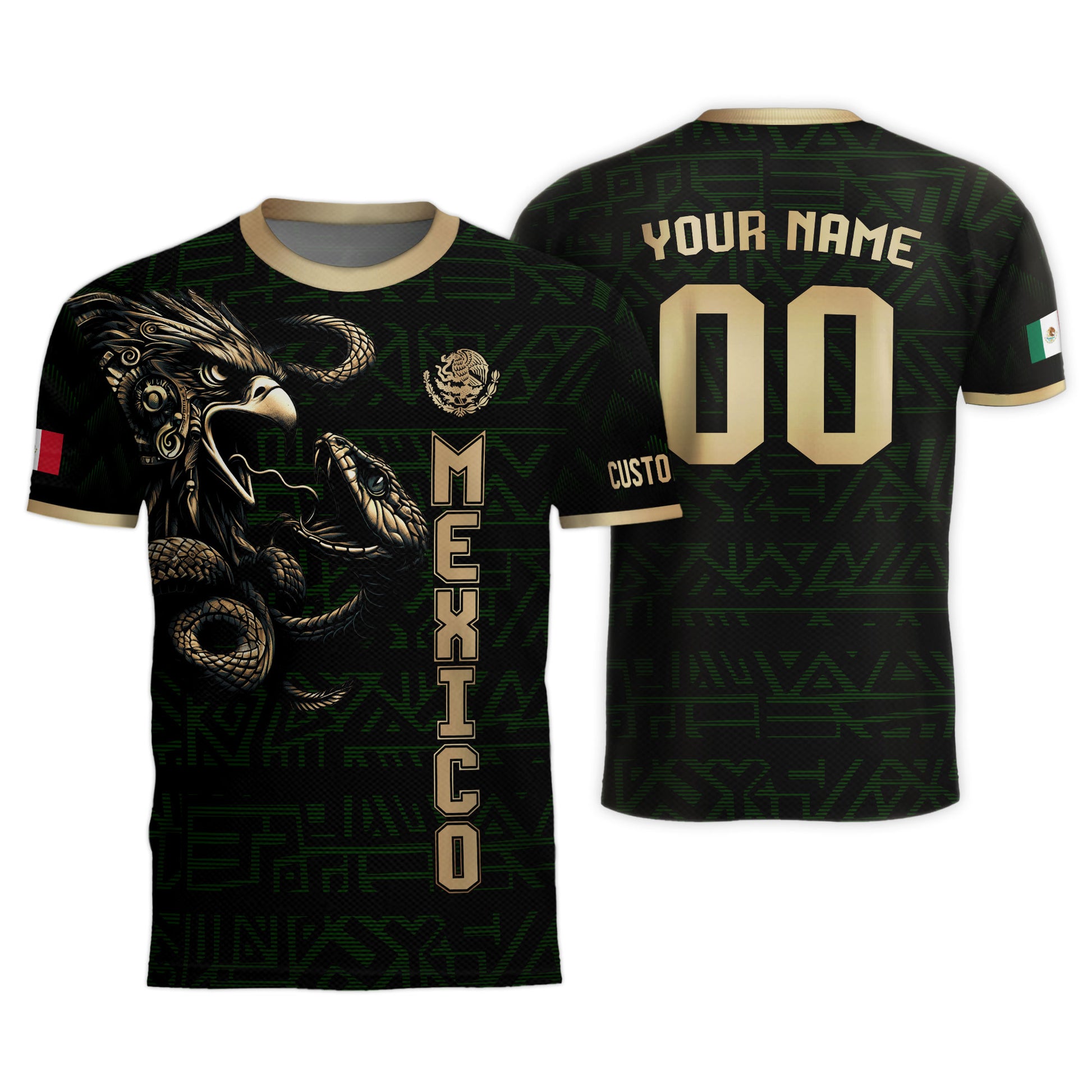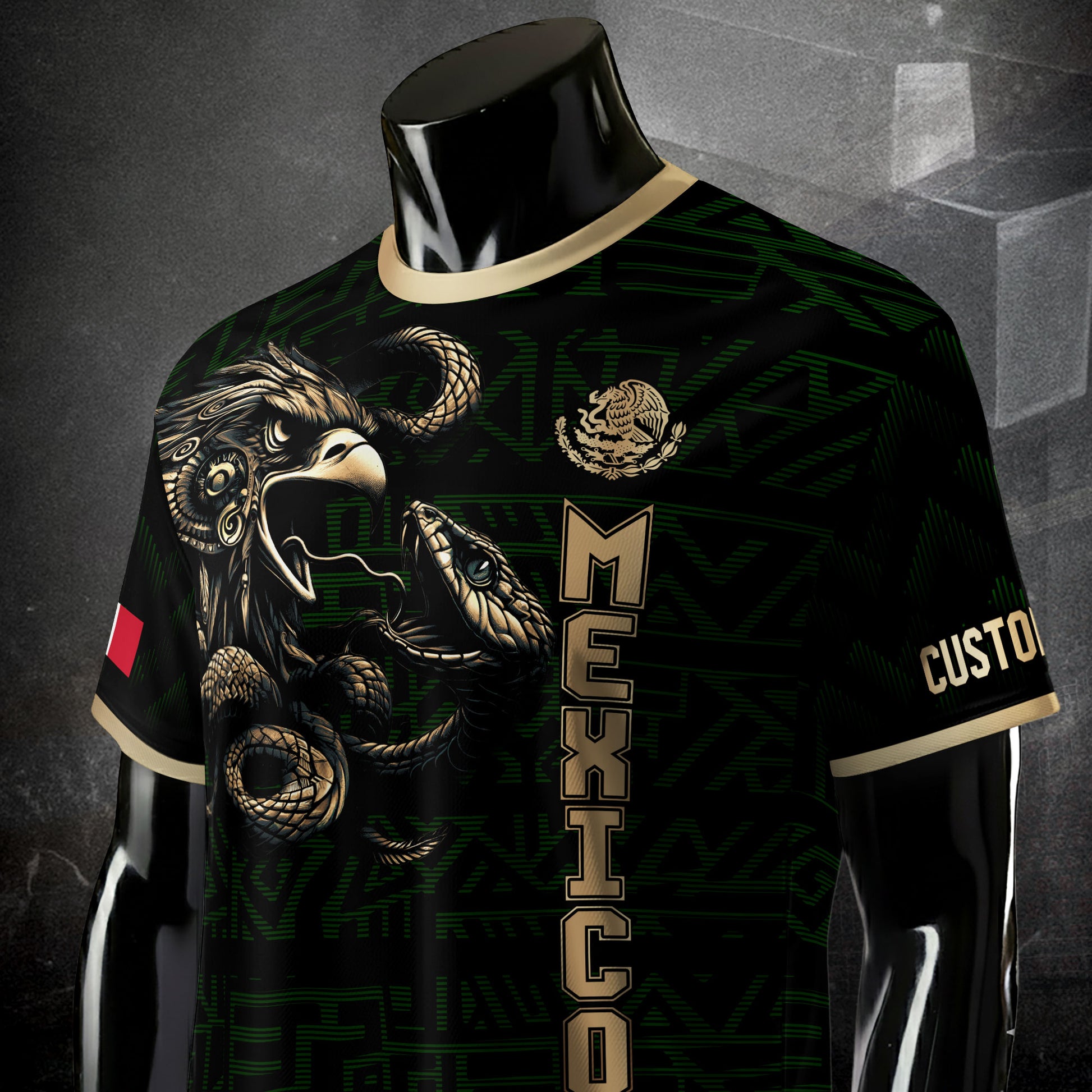 Custom Mexico Soccer Jersey in black gold Aztec eagle design. Add your name and number. Celebrate Mexican pride and culture with bold style.